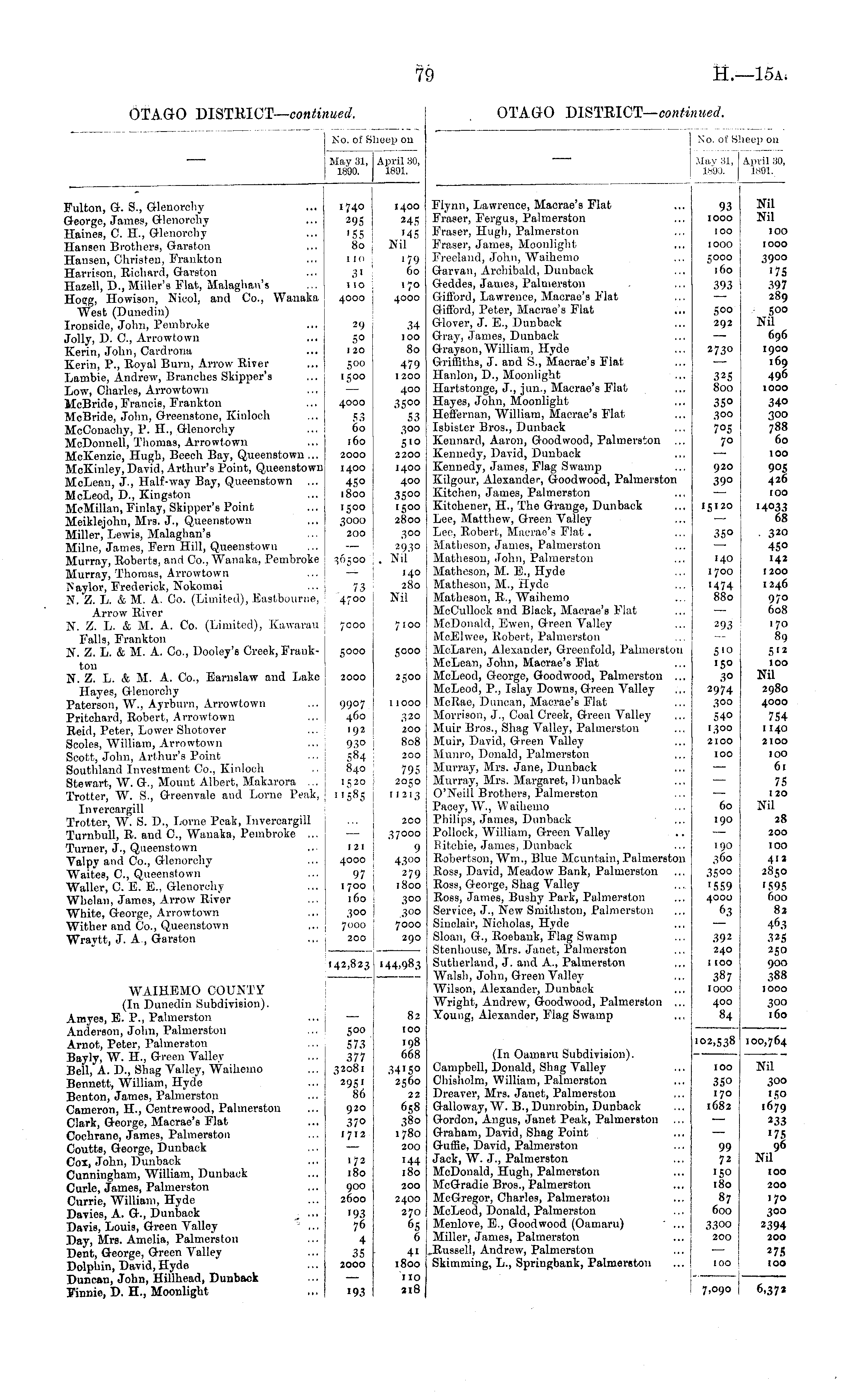 No. of Sheen on May 31, April 30, 1S00. 1801. Flynn, Lawrence, Macrae's Flat Fraser, Fergus, Palmerston Eraser, Hugh, Palmerston Fraser, James, Moonlight Freeland, John, Waihemo Garvan, Archibald, Dunback G-eddes, James, Palmerston GKfford, Lawrence, Macrae's Flat Gifford, Peter, Macrae's Flat Glover, J. E., Dunbaek Gray, James, Dunback Grayson, William, Hyde Griffiths, J. and S., Macrae's Flat Hanlon, D., Moonlight Hartstonge, J., jun., Macrae's Flat Hayes, John, Moonlight Heffernan, William, Macrae's Flat Isbister Bros., Dunback Kennard, Aaron, Goodwood, Palmerston Kennedy, DaTid, Dunback Kennedy, James, Flag Swamp Kilgour, Alexander, Goodwood, Palmerston Kitchen, James, Palmerston Kitchener, H., The Grange, Dunback Lee, Matthew, Green Valley Leo, Robert, Macrae's Flat. Matlicson, James, Palmerston Matheson, John, Palmerston Matheson, M. E., Hyde Matheson, M., Hyde Matheson, R., Waihemo McCullock and Black, Macrae's Flat McDonald, Ewen, Green Valley McElwee, Robert, Palmerston McLaren, Alexander, Greenfold, Palmerston McLean, John, Macrae's Flat McLeod, George, Goodwood, Palmerston ... McLeod, P., Islay Downs, Green Valley McRae, Duncan, Macrae's Flat Morrison, J., Coal Creek, Green Valley Muir Bros., Shag Valley, Palmerston Muir, David, Green Valley Munro, Donald, Palmerston Murray, Mrs. Jane, Dunback Murray, Mrs. Margaret, Dunback O'Neill Brothers, Palmerston Pacey, W., Waihemo Philips, James, Dunback Pollock, William, Green Valley Kitchie, James, Dunback Robertson, Wm., Blue Mountain, Palmerston Boss, David, Meadow Bank, Palmerslon Ross, George, Shag Valley Ross, James, Bushy Park, Palmerston Service, J., New Smithston, Palmerston Sinclair, Nicholas, Hyde Sloan, G., Roebank, Flag Swamp Stenhouse, Mrs. Janet, Palmerston Sutherland, J. and A., Palmerston Walsh, John, Green Valley Wilson, Alexander, Dunback Wright, Andrew, Goodwood, Palmerston ... Young, Alexander, Flag Swamp 93 IOOO IOO IOOO '160 393 500 292 2730 325 800 35° 3°° 7°5 7° 920 39° 15120 35° 140 1700 M74 880 293 Nil Nil 100 IOOO 3900 <7S 397 289 500 Nil 696 1900 169 496 IOOO 340 300 788 60 100 905 426 IOO 14033 68 . 320 45° 142 1200 1246 97° 608 170 89 5'0 15° 3° 2974 300 540 1300 2100 S1* 100 Nil 2980 4000 754 1140 2100 100 100 6! 75 120 Nil 28 _ 60 190 200 190 360 I 35 00 '5S9 i 4000 -I 100 412 2850 '595 600 I* 403 250 900 388 IOOO 300 160 39 2 240 j 1100 j 387 IOOO 400 841 (In Oainaru Subdivision). Campbell, Donald, Shag Valley Chisholm, William, Palmerston Dreaver, Mrs. Janet, Palmerston Galloway, W. B., Dunrobin, Dunback Gordon, Angus, Janet Peak, Palmerston Graham, David, Shag Point Guffie, David, Palmerston Jack, W. J., Palmerston McDonald, Hugh, Palmerston McGradie Bros., Palmerston McGregor, Charles, Palmerston McLeod, Donald, Palmerston Menlove, E., Goodwood (Oamaru) ' ... Miller, James, Palmerston Russell, Andrew, Palmerston Skimming, L., Springbank, Palmereton 102,538] IOO 350 170 1682 i 100,764 Nil 300 '5° 1679 333 175 96 Nil 99 72 'SO 180 87 600 3300 200 100 200 170 300 2394 200 _ j 27S 100 100 ' ,01 6,