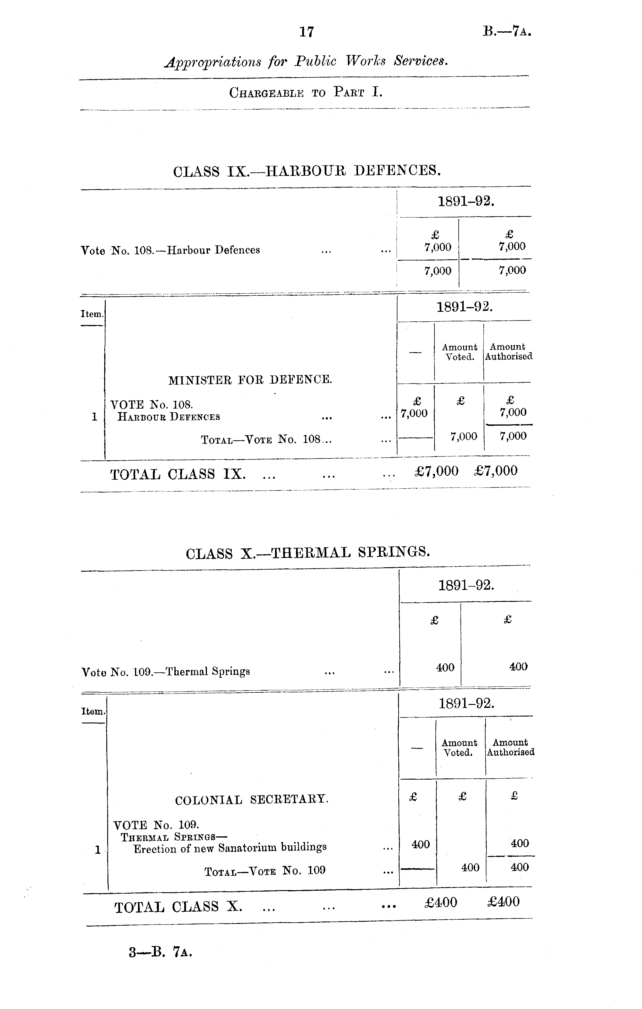 1891-92. £ £ 400 400 oto No. L09. —Thermal Springs 1891-9 Item. Amount Voted. Amount Authorised COLONIAL SECRETARY. £ VOTE No. 109. Thermal Speings— Erection of new Sanatorium buildings 400 1 400 Total—Vote No. 109 400 400 TOTAL CLASS X. £400 £400 • • •