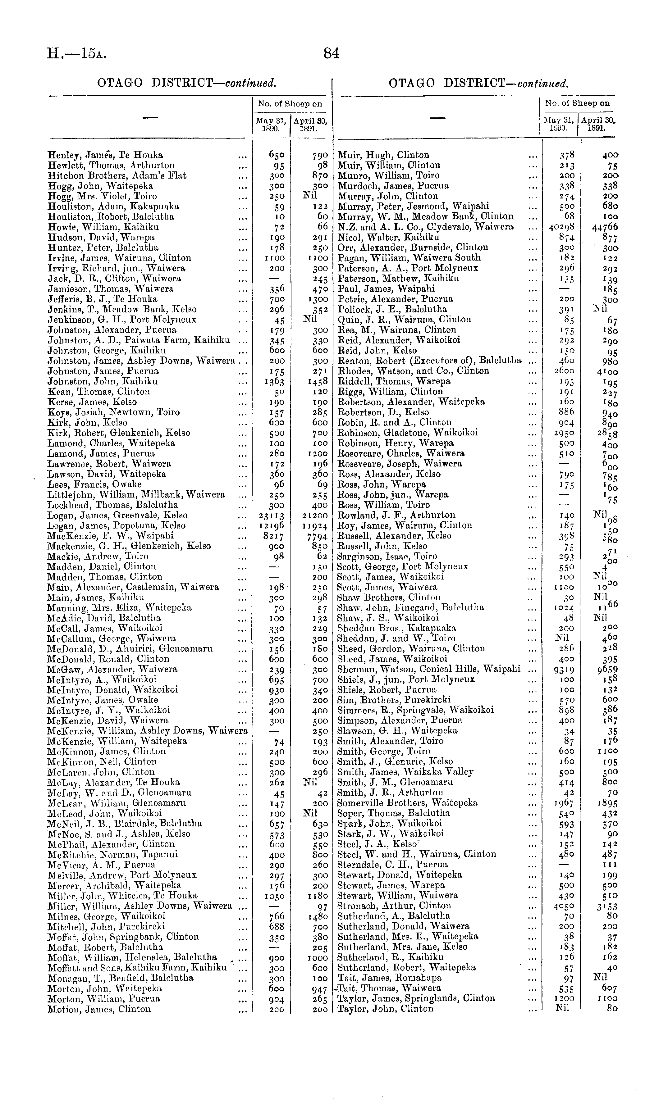 No. of Sheep on May 31, April 30, 1890. 1801. Elenley, James, Te Houka Eewlett, Thomas, Arthurton Eitchon Brothers, Adam's Flat Eogg, John, Waitepeka ffogg, Mrs. Violet, Toiro Eouliston, Adam, Kakapuaka Eouliston, Robert, Balclutha Eowie, William, Kaihiku Hudson, David, Warepa Eunter, Peter, Balclutlia [rvine, James, Wairuna, Clinton Crving, Richard, jun., Waiwera rack, D. R., Clifton, Waiwera Famieeon, Thomas, Waiwera refferie, B, J., Te Houka renkine, T., Meadow Bank, Kelso Fenkinson, G. H., Port Molyneux rohnston, Alexander, Puerua rohnston, A. D., Paiwata Farm, Kaihiku ... rohnston, George, Kaihiku rohnston, James, Ashley Downs, Waiwera ... fohnston, James, Puerua rohnBton, John, Kaihiku Cean, Thomas, Clinton Eerse, James, Kelso Keys, Josiah, Newtown, Toiro Kirk, John, Kelso Kirk, Robert, Glenkenieh, Kelao [jamond, Charles, Waitepeka [Janiond, James, Puerua Lawrence, Robert, Waiwera Liawson, David, Waitepeka Dees, Francis, Owake bittlejohn, William, Millbank, Waiwera jockhead, Thomas, Balclutlia JDgan, James, Greenvale, Kelso liogan, James, Popotuna, Kelso MacKenzie, P. W., Waipahi Mackenzie, G. II., Glenkenich, Kelso Mackie, Andrew, Toiro Madden, Daniel, Clinton Madden, Thomas, Clinton Main, Alexander, Castlemain, Waiwera Main, James, Kaihiku Manning, Mrs. Eliza, Waitepeka McAdie, David, Balclutha HcCall, James, Waikoikoi tfcCallum, George, Waiwera HcDonald, D., Ahniriri, Gleuoamaru McDonald, Ronald, Clinton YlcGaw, Alexander, Waiwera kfclntyre, A., Waikoikoi tfclntyre, Donald, Waikoikoi Hclnlyre, James, Owake Hclntyre, J. T., Waikoikoi rfcKenzie, David, Waiwera HcKenzie, William, Ashley Downs, Waiwera HcKenzie, William, Waitepeka HcKinnon, James, Clinton HcKinnon, Neil, Clinton HcLaren, John, Clinton VIcLay, Alexander, Te Houka VIcLay, W. and D., Glenoamaru McLean, William, Glenoamaru ilcLeod, John, Waikoikoi McNeil, J. B., Blairdale, Balclutha VIcNoe, S. and J., Ashlea, Kelso VIcPhail, Alexander, Clinton VlcRitchie, Norman, Tapanui VIcViear, A. M., Puerua Melville, Andrew, Port Molyneux Mercer, Archibald, Waitepeka Miller, John, Whitelea, Te Houka Miller, William, Ashley Downs, Waiwera ... Milnes, George, Waikoikoi Mitchell, John, PureMreki Moffat, John, Springbank, Clinton Moffat, Robert, Balelutha Moffat, William, Helenslea, Balclutha Moffatt and Sons, Kaihiku Farm, Kaihiku ... Monagan, T., Benfield, Balclutha Morton, John, Waitepeka Morton, William, Puerua Motion, James, Clinton 650 95 300 300 250 59 10 72 190 .78 1100 200 356 700 296 45 '79 345 600 200 '75 1363 5° 190 157 600 500 100 280 172 360 ■96 250 300 231'3 12196 8217 900 98 198 300 70 100 300 156 600 239 695 93° 300 400 300 790 98 870 goo Nil 122 60 66 291 250 1100 300 245 470 1300 352 Nil 300 330 600 300 271 120 190 285 600 700 100 1200 196 360 69 2S5 400 21200 11924 7794 850 62 150 200 250 298 57 132 229 300 1 So 600 300 700 34° 200 400 500 250 '93 200 boo 296 Nil 74 240 5°o 300 262 45 147 100 657 573 600 400 290 297 .76 1050 766 688 35° 42 200 Nil 630 53O 55° 800 260 300 200 1 180 97 1480 700 380 205 1000 600 900 300 300 600 904 200 100 947 265 200