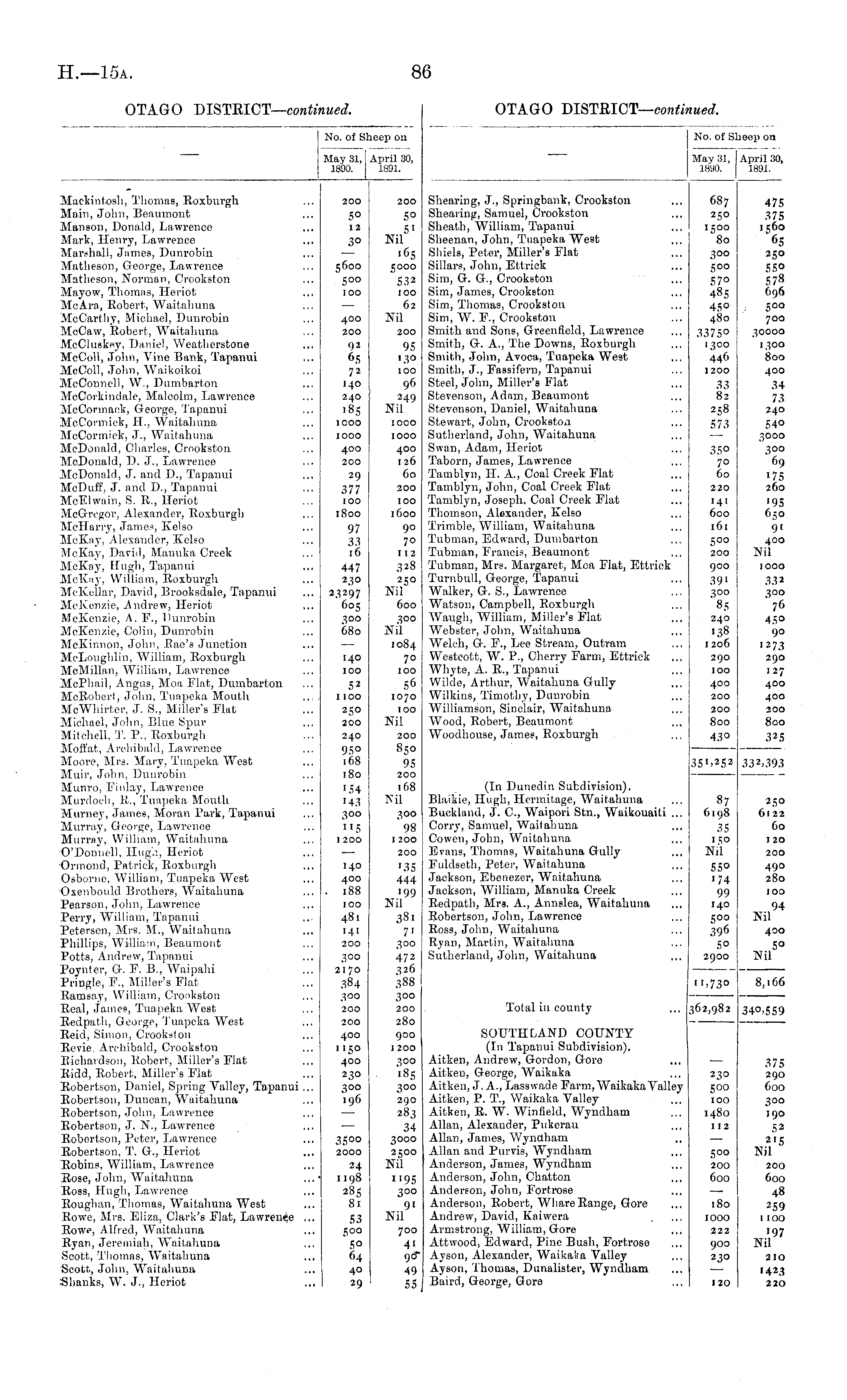 No. of Sheep on May 31, April 30, 1890. 1891. Mackintosh, Thomas, Roxburgh Main, John, Beaumont Man son, Donald, Lawrence Mark, Henry, Lawrence Marshall, Jnmes, Dunrobin Matheson, George, Lawrence Matheson, Norman, Crookston Mayow, Thomas, He riot McAra, Robert, Waitahuna McCarthy, Michael, Dunrobin McCaw, Robert, Waitahuna McCIuskey, Daniel, Weatherstone McColl, John, Tine Bank, Tapanui McColl, John, "YVaikoikoi McConneli, W., Dumbarton McCorkindale, Malcolm, Lawrence MoOormack, George, Tapanui McCormick, S., Waitahuna McCormick, J., Waitahuna McDonald, Chavles, Crookston McDonald, D. J., Lawrence McDonald, J. and D., Tapanui McDuff, J. and D., Tapanui McElwain, S. R., Heriot McGregor, Alexander, Roxburgh McIIarry, James, Kelso McKay, Alexander, Keleo McKay, David, Manuka Creek McKay, Hugh, Tapanui MoKny, William, Roxburgh MeKellar, David, Brooksdale, Tapanui McKenzie, Andrew, Heriot McKenzie, A. F., Punrobin McKenzie, Colin, Dunrobin McKinnon, John, Rae's Junction McLoughlin, William, Roxburgh McMillan, William, Lawrence McPhail, Angus, Moa Flat, Dumbarton McRroberl, John, Tunpeka Moutli McWhirtcr, J. S., Miller's Flat Michael, John, Blue Spur Mitchell, T. P., Roxburgh Moffat, Archibald, Lawrence Moore, Mrs. Mary, Tuapeka West Muir, John, Dunrobin Munro, Finlay, Lawrence Murdoch, R., Tuapeka Mouth Murney, James, Moran Park, Tapanui Murray, George, Lawrence Murray, William, Waitahuna O'Donnell, HugJ, Heriot Ormond, Patrick, Roxburgli Osborne, William, Tuapeka West Oxenbould Brothers, Waitahuna Pearson, John, Lawrence Perry, William, Tapanui Peterson, Mrs. M., Waitahuna Phillips, William, Beaumont Potts, Andrew, Tapanui Poynter, G. F. B., Waipahi Pringle, F., Miller's Flat Ramsay, William, Crookston Real, James, Tuapeka West Redpath, George, Tuapeka West Reid, Simon, Crookston Revie. Archibald, Crookston Riehaidson, Robert, Miller's Flat Ridd, Robert, Miller's Fiat Robertson, Daniel, Spring Valley, Tapanui... Robertson, Duncan, Waitahuna Robertson, John, Lawrence Robertson, J. N., Lawrence Robertson, Peter, Lawrence Robertson, T. G., Heriot Robins, William, Lawrence Rose, John, Waitahuna ... • Ross, Hugh, Lawrence Roughan, Thomas, Waitahuna West Rowe, Mrs. Eliza, Clark's Flat, Lawrenee ... Rowp, Alfred, Waitahuna Ryan, Jeremiah, Waitahuna Scott, Thomas, Waitahuna Scott, John, Waitahuna Shanks, W. J., Heriot 200 5° 12 3° 56°° 500 100 400 200 92 6.S 72 140 240 18s 1COO 1000 400 zoo 29 377 100 1800 97 33 16 447 230 23297 605 300 680 140 100 5 2 1100 250 200 240 95° 168 180 '54 143 300 »5 1200 200 5° Nil 5' ■65 5000 5.32 100 62 Nil 200 95 ■3° 100 96 249 Nil 1000 1000 400 126 60 200 100 1600 90 7° 112 328 250 Nil 600 300 Ni'l 1084 70 100 56 1070 100 Nil 200 850 95 200 168 Nil 300 98 1200 200 140 400 . 188 100 481 141 200 ■35 444 199 Nil 381 7' 300 472 326 388 300 200 280 900 1200 300 2170 384 300 200 200 400 1150 400 230 300 196 ?,oo "i8S 300 290 283 34 3000 2:500 Nil i'95 300 91 Nil 700 4' 90 49 55 35°° 2000 24 1198 285 81 53 500 5° 64 40 29