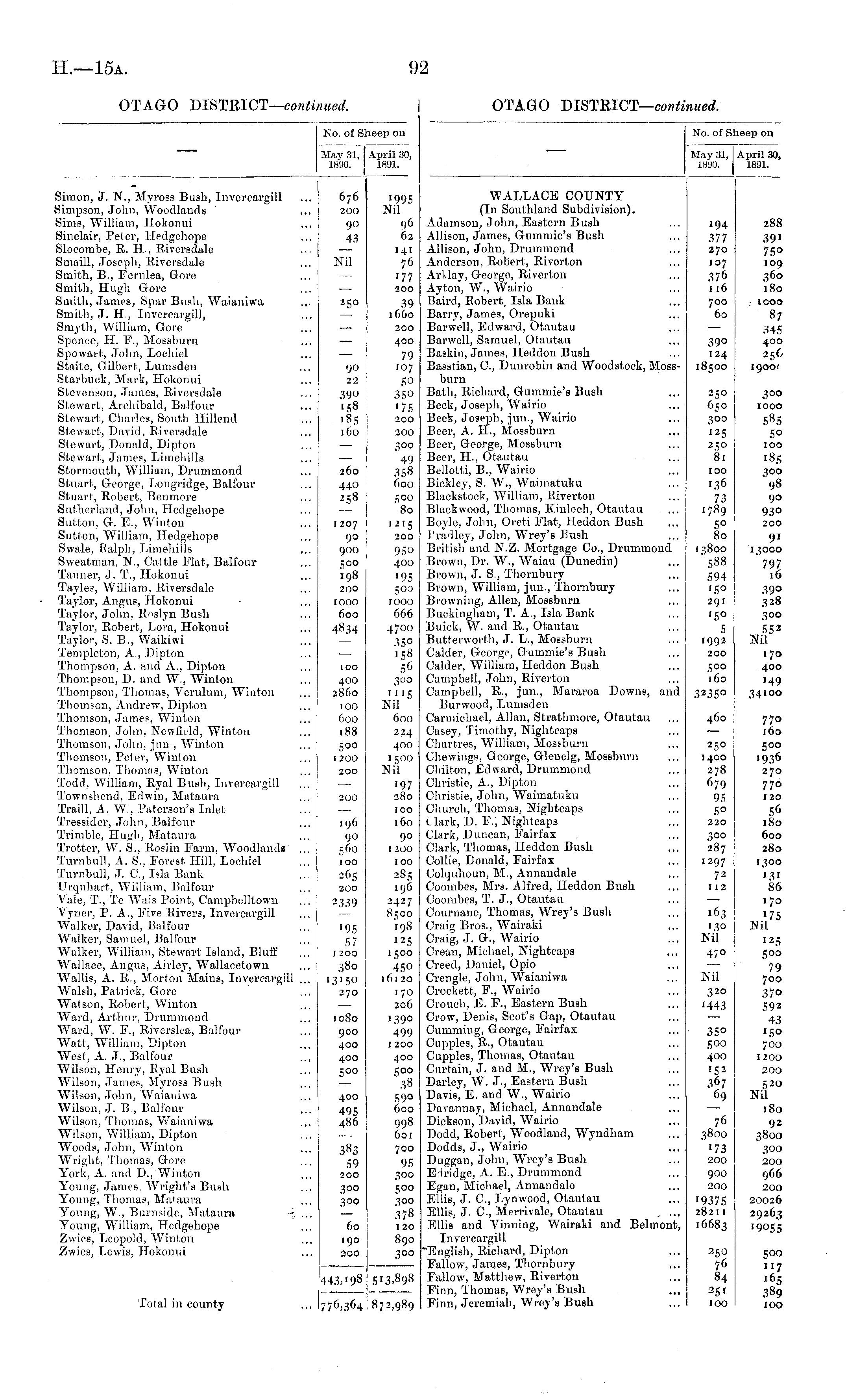 o. oi loop 011 May 31, April 30, 1890. 1891. WALLACE COUNTY (In Southland Subdivision). Adamson, John, Eastern Bush Allison, James, Gmnmie's Bush Allison, John, Drummond Anderson, Robert, Bivevton ArUay, George, Riverton Ayton, W., Wairio Baird, Robert, Isla Bank Barry, James, Orepuki Barwell, Edward, Otautau Barwell, Samuel, Otautau Baskin, James, Heddon Bush Basstian, C, Dunrobin and Woodstock, Mossburn BaUi, Richard, Gummie's Bush Beck, Joseph, Wairio Beck, Joseph, Jan., Wairio Beer, A. H., Mossburn Beer, George, Mossburn Beer, II., Otautau Bellotti, B., Wairio Bickley, S. W., Waimatuku Blackstock, William, Riverton Blackwood, Thomas, Kinloch, Otautau Boyle, John, Oreti Flat, Heddon Bush I'radley, John, Wrey's Bush British and N.Z. Mortgage Co., Drummond Brown, Dr. W., Waiau (Dunedin) Brown, J. S., Thornbury Brown, William, jun., Thornbury Browning, Allen, Mossburn Buckingham, T. A., Isla Bank Buick, W. and R., Otautau Buttenvorth, J. L., Mossburn Calder, George, Gummie's Bush Calder, William, Heddon Bush Campbell, John, Riverton Campbell, R., jun., Mararoa Downs, and Burwood, Lumsden Carniiebael, Allan, Stratlimore, Otautau Casey, Timothy, Nightcaps Chartres, William, Mossburn Chewings, George, Glenelg, Mossburn Cliilton, Edward, Drummond Christie, A., Dipton Christie, John, Waimatuku Church, Thomas, Nightcaps Clark, D. F., Nightcaps Clark, Duncan, Fairfax Clark, Thomas, Heddon Bush Collie, Donald, Fairfax Colquhoun, M., Annandale Coombes, Mrs. Alfred, Heddon Bush Coornbes, T. J., Otautau Cournane, Thomas, Wrey's Bush Craig Bros., Wairaki Craig, J. G., Wairio Crean, Michael, Nightcaps Creed, Daniel, Opio Crengle, John, Waianiwa Crockett, F., Wairio Crouch, E. F., Eastern Bush Crow, Denis, Scot's Gap, Otautau Cumming, George, Fairfax Cupples, R., Otautau Cupples, Thomas, Otautau Curtain, J. and M., Wrey's Bush Darley, W. J., Eastern Bush Davis, E. and W., Wairio Darannay, Michael, Annandale Dickson, David, Wairio Dodd, Robert, Woodland, Wyndham Dodds, J., Wairio Duggan, John, Wrey's Bush Bdridge, A. E., Drummond Egan, Michael, Annandale Ellis, J. C, Lynwood, Otautau Ellis, J. C, Merrivale, Otautau . ... Ellis and Vinning, Wairaki and Belmont, Invercargill English, Richard, Dipton Fallow, James, Thornbury Fallow, Matthew, Riverton Finn, Thomas, Wrey's Bush ... Finn, Jeremiah, Wrey's Bush '94 377 lo? 37& u6 700 60 39° 124 18500 250 650 300 125 250 81 100 136 73 1789 5° 80 i '588 S94 'SO 291 '5° 5 1992 200 500 160 323SO 460 250 1400 278 679 95 5° 220 288 39' 75° 109 360 180 1000 87 345 400 256 1900; 300 1000 585 5° 100 185 300 ■98 90 93° 200 9' 13000 797 16 39° 328 300 55 2 Nil 170 400 '49 34100 77° j6o 500 1936 270 770 120 56 180 600 280 300 287 1297 72 112 1300 '3' 86 170 •75 Nil 163 130 Nil 470 Nil 320 '443 35° 500 400 152 3 67 I 9 I25 500 79 700 37o 592 43 '5° 700 1200 200 520 Nil 180 92 3800 300 200 966 200 20026 29263 19055 76 3800 '73 200 900 200 '9375 28211 16683 250 76 84 25' 100 500 165 389 100