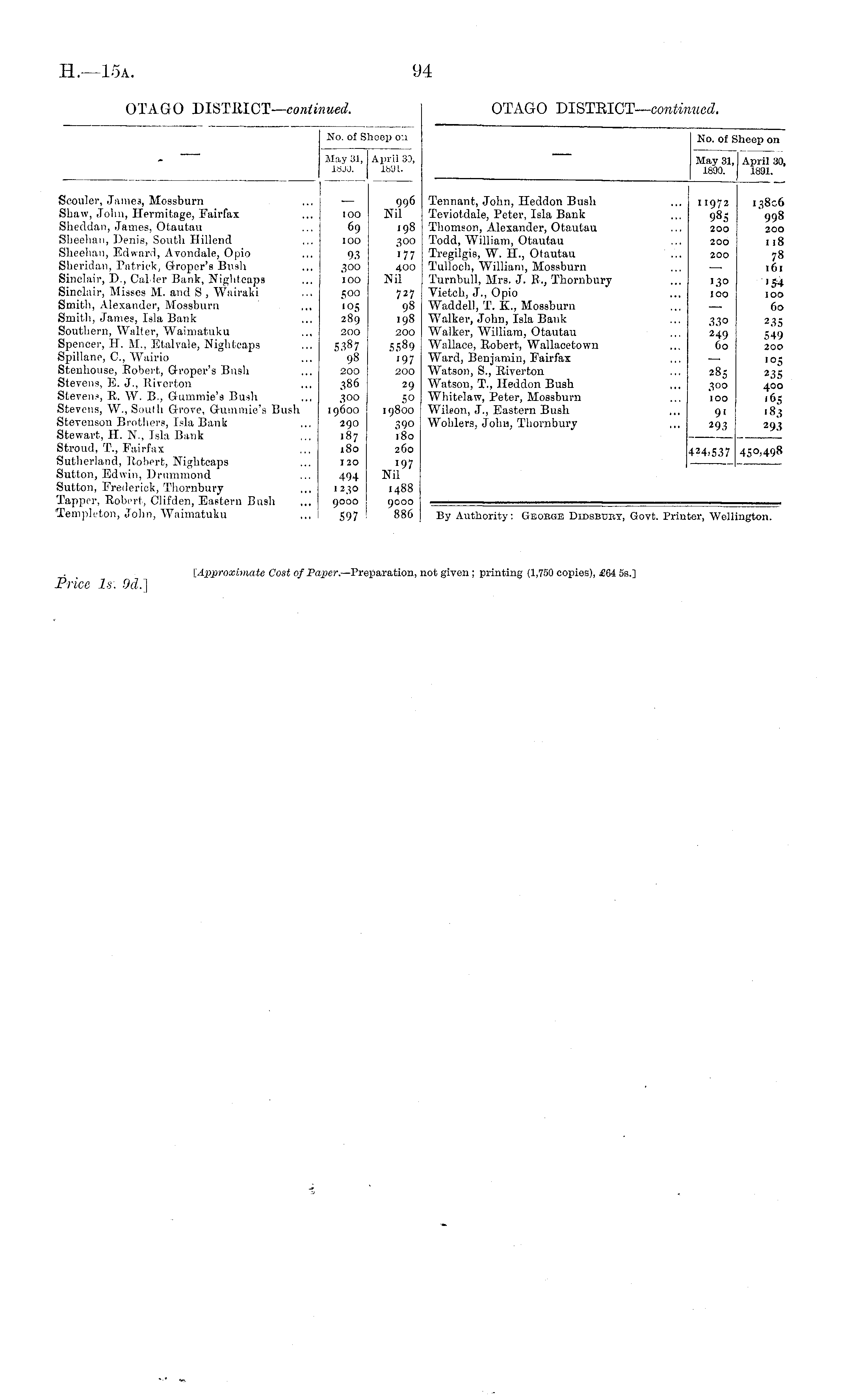 No. of Snoop 0:1 May 31, 1SJJ. April 3J, ibiH. Scouler, James, Mossburn Shaw, Join), Hermitage, Fairfax Sheddan, James, Otautau Sheelian, ])enis, South Hillend Sheehan, Edward, Avondale, Opio Sheridan, Patrick, Groper's Bush Sinclair, D., Calrler Bank, Nighfeapa Sinclair, Misses M. and S , Wairaki Smith, Alexander, Mossburn Smith, James, Isla Bank Southern, Walter, Waimatuku Spencer, H. If., Etalvale, Nightcaps Spillane, C, Wairio Stenhouse, Boberfc, Groper's Bush Stevens, E. J., Riverton Stevens, R. W. B., Gummie's Bash Stevens, W., South Grove, Gummie's Bush Stevenson Brothers, Isla Bank Stewart, II. N., Isla Bank Stroud, T., Fairfax Sutherland, Robert, Nightcaps Sutton, Edwin, Drummond Sutton, Frederick, Thornbury Tapper, Robert, Clifden, Eastern Bush Templtton, John, Waimatuku 100 69 100 93 300 100 500 '05 289 200 5387 98 200 386 300 19600 290 187 180 120 494 1230 9000 [ 996 Nil J98 300 177 400 Nil 7 27 98 ■ 98 2OO 5589 '97 200 29 5° 19800 390 180 260 ]97 Nil 1488 9000 886