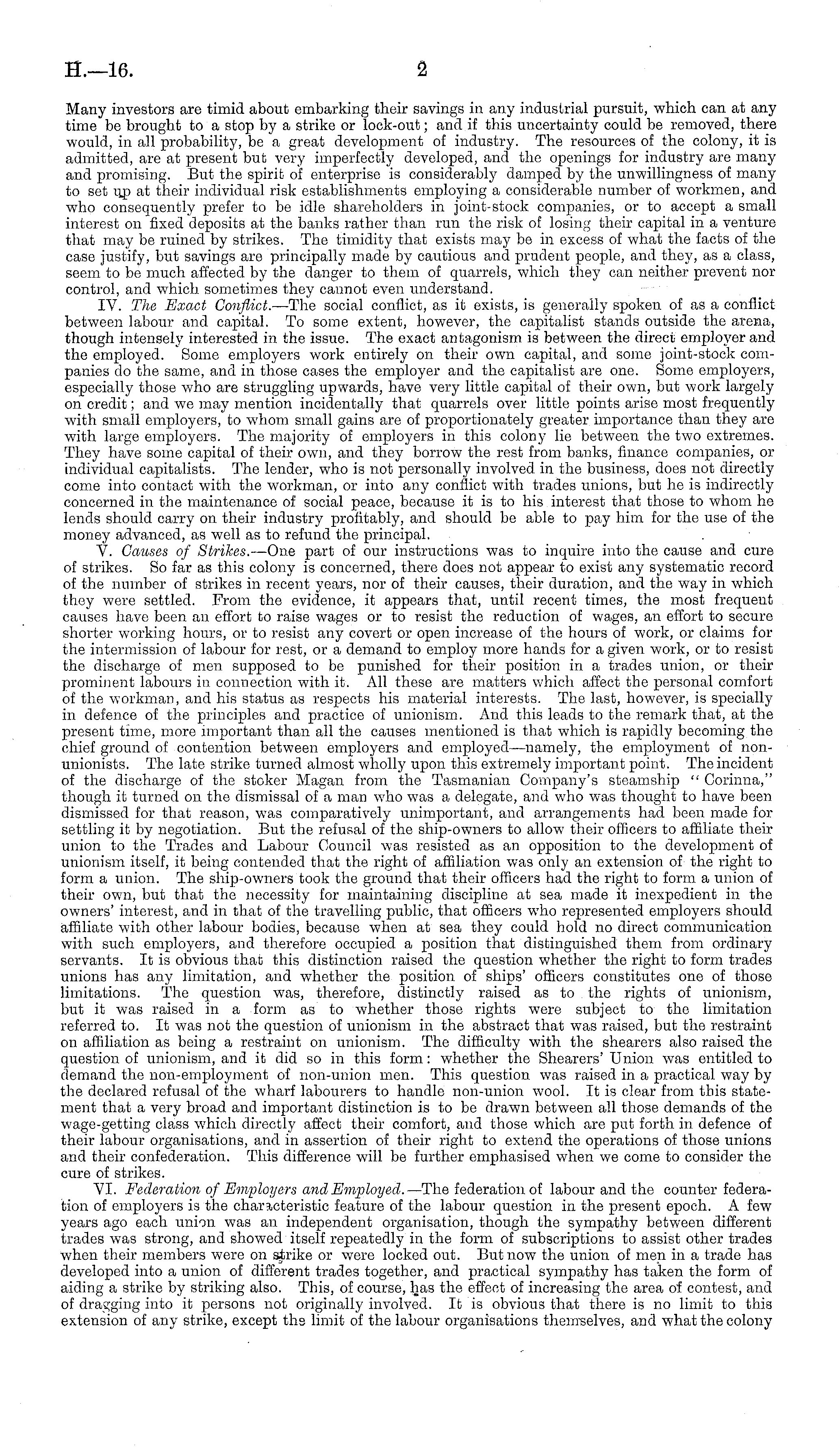 Many investors are timid about embarking their savings in any industrial pursuit, which can at any time be brought to a stop by a strike or lock-out; and if this uncertainty could be removed, there would, in all probability, be a great development of industry. The resources of the colony, it is admitted, are at present but very imperfectly developed, and the openings for industry are many and promising. But the spirit of enterprise is considerably damped by the unwillingness of many to set up at their individual risk establishments employing a considerable number of workmen, and who consequently prefer to be idle shareholders in joint-stock companies, or to accept a small interest on fixed deposits at the banks rather than run the risk of losing their capital in a venture that may be ruined by strikes. The timidity that exists may be in excess of what the facts of the case justify, but savings are principally made by cautious and prudent people, and they, as a class, seem to be much affected by the danger to them of quarrels, which they can neither prevent nor control, and which sometimes they cannot even understand. IV. The Exact Conflict. —The social conflict, as it exists, is generally spoken of as a conflict between labour and capital. To some extent, however, the capitalist stands outside the arena, though intensely interested in the issue. The exact antagonism is between the direct employer and the employed. Some employers work entirely on their own capital, and some joint-stock companies do the same, and in those cases the employer and the capitalist are one. Some employers, especially those who are struggling upwards, have very little capital of their own, but work largely on credit; and we may mention incidentally that quarrels over little points arise most frequently with small employers, to whom small gains are of proportionately greater importance than they are with large employers. The majority of employers in this colony lie between the two extremes. They have some capital of their own, and they borrow the rest from banks, finance companies, or individual capitalists. The lender, who is not personally involved in the business, does not directly come into contact with the workman, or into any conflict with trades unions, but he is indirectly concerned in the maintenance of social peace, because it is to his interest that those to whom he lends should carry on their industry profitably, and should be able to pay him for the use of the money advanced, as well as to refund the principal. V. Causes of Strikes. —One part of our instructions was to inquire into the cause and cure of strikes. So far as this colony is concerned, there does not appear to exist any systematic record of the number of strikes in recent years, nor of their causes, their duration, and the way in which they were settled. From the evidence, it appears that, until recent times, the most frequent causes have been an effort to raise wages or to resist the reduction of wages, an effort to secure shorter working hours, or to resist any covert or open increase of the hours of work, or claims for the intermission of labour for rest, or a demand to employ more hands for a given work, or to resist the discharge of men supposed to be punished for their position in a trades union, or their prominent labours in connection with it. All these are matters which affect the personal comfort of the workman, and his status as respects his material interests. The last, however, is specially in defence of the principles and practice of unionism. And this leads to the remark that, at the present time, more important than all the causes mentioned is that which is rapidly becoming the chief ground of contention between employers and employed —namely, the employment of nonunionists. The late strike turned almost wholly upon this extremely important point. The incident of the discharge of the stoker Magan from the Tasmanian Company's steamship " Corinna," though it turned on the dismissal of a man who was a delegate, and who was thought to have been dismissed for that reason, was comparatively unimportant, and arrangements had been made for settling it by negotiation. But the refusal of the ship-owners to allow their officers to affiliate their union to the Trades and Labour Council was resisted as an opposition to the development of unionism itself, it being contended that the right of affiliation was only an extension of the right to form a union. The ship-owners took the ground that their officers had the right to form a union of their own, but that the necessity for maintaining discipline at sea made it inexpedient in the owners' interest, and in that of the travelling public, that officers who represented employers should affiliate with other labour bodies, because when at sea they could hold no direct communication with such employers, and therefore occupied a position that distinguished them from ordinary servants. It is obvious that this distinction raised the question whether the right to form trades unions has any limitation, and whether the position of ships' officers constitutes one of those limitations. The question was, therefore, distinctly raised as to the rights of unionism, but it was raised in a form as to whether those rights were subject to the limitation referred to. It was not the question of unionism in the abstract that was raised, but the restraint on affiliation as being a restraint on unionism. The difficulty with the shearers also raised the question of unionism, and it did so in this form: whether the Shearers' Union was entitled to demand the non-employment of non-union men. This question was raised in a practical way by the declared refusal of the wharf labourers to handle non-union wool. It is clear from this statement that a very broad and important distinction is to be drawn between all those demands of the wage-getting class which directly affect their comfort, and those which are put forth 