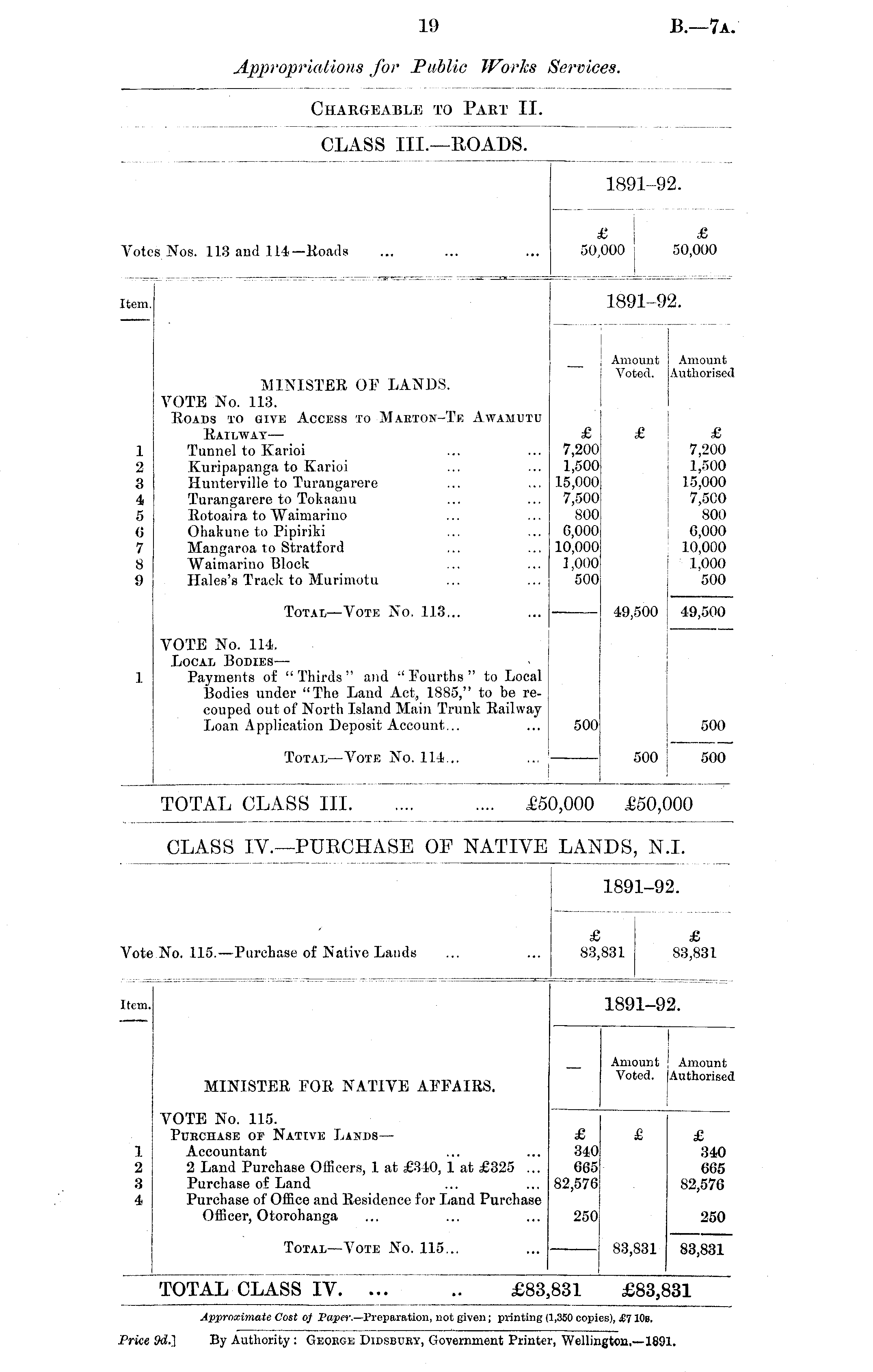 1891-92. iNos. 113 and 114—Roads £ £ 50,000 50,000 Vote; Item. 1891-92. : i MINISTER OF LANDS. VOTE No. 113. Roads to give Access to Maeton-Te Awamutu Railway—• Tunnel to Karioi Kuripapanga to Karioi Hunterville to Turangarere Turangarere to Tokaanu Rotoaira to "Waimarino Ohakune to Pipiriki Mangaroa to Stratford Waimariuo Block Hales's Track to Murimotu I Amount i Amount Voted. Authorised j 1 2 8 4 5 6 7 8 9 £ 7,200 1,500 15,000 7,500 800 6,000 10,000 ] ,000 500 £ £ £ 7,200 7,200 1,500 1,500 15,000 15,000 7,500 7,500 800 800 6,000 6,000 10,000 10,000 1,000 1,000 500 500 49,500 i 49,500 Total —Vote No. 113... VOTE No. 114. Local Bodies— Payments of " Thirds " and " Fourths " to Local Bodies under "The Land Act, 1885," to be recouped out of North Island Main Trunk Railway Loan Application Deposit Account... i 500 500 500 Total —Vote No. 111... 500 : 500 TOTAL CLASS III .... £50,000 £50,000 £5< ,000 £50,000 CLASS IV.—PUKCHASE OF NATIVE LANDS, N.L 1891-92. Vote £ £ No. 115.—Purchase of Native Lauds ... ... 83,831 83,831 Item. 1891-92. 1891-9 MINISTER FOE NATIVE AFFAIRS. Amount Voted. ! Amount [Authorised 1 2 3 4 VOTE No. 115. Puechase or Native Lands— Accountant 2 Land Purchase Officers, 1 at £340, 1 at £325 ... Purchase of Land Purchase of Office and Residence for Land Purchase Officer, Otorohanga £ 340 665 82,576 £ 340 665 82,576 250 250 Total —Vote No. 115... 83,831 83,831 TOTAL CLASS IV. ... .. £83 £83 831 £83,831 • • •