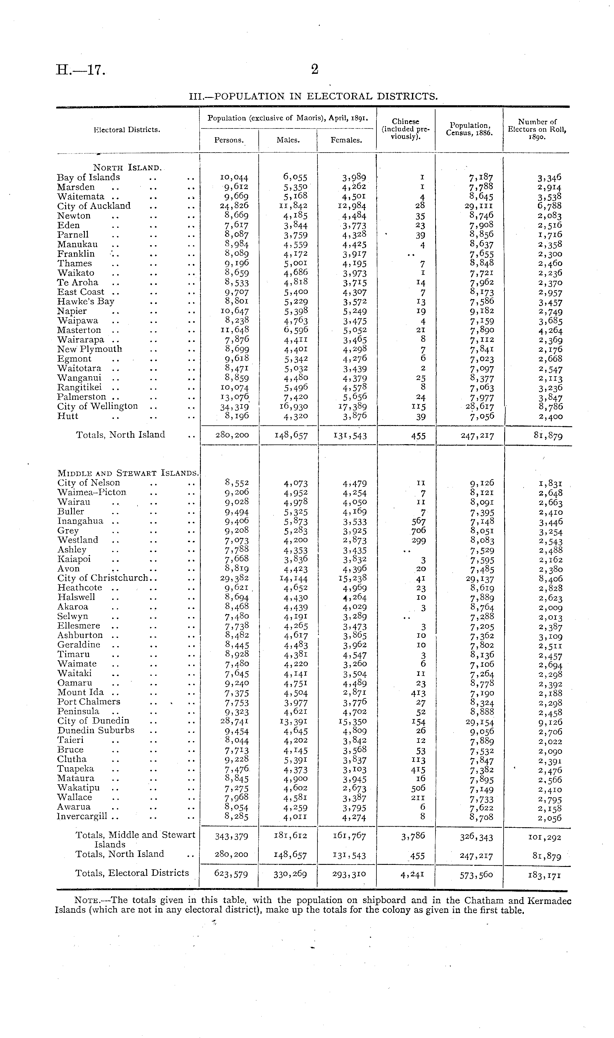 Population (exclusive of Maoris), April, 1891. Chinese (included previously). Number of Electors on Roll, 1890. Electoral Districts. Persons. Males. Females. Population, Census, 1886. North Island. Bay of Islands Marsden .. Waitemata .. .. .. City of Auckland Newton Eden Parnell Manukau Franklin Thames Waikato Te Aroha East Coast Hawke's Bay Napier Waipawa Masterton Wairarapa New Plymouth Egmont Waitotara Wanganui Rangitikei Palmerston City of Wellington Hutt 10,044 9,612 9,669 24,826 8,669 7,617 8,087 8,984 8,089 9,196 8,659 8,533 9,707 8,801 10,647 8,238 11,648 7,876 8,699 9,618 8,471 8,859 10,074 13,076 34,319 8,196 6,055 5,35° 5,168 11,842 4,185 3,844 3,759 4,559 4,172 5,001 4,686 4,818 5,400 5,229 5,398 4,763 6,596 4,411 4>4Oi 5,342 5,O32 4,480 5,496 7,420 16,930 4,32O 3,989 4,262 4,5oi 12,984 4,484 3,773 4,328 4,425 3,917 4,195 3,973 3,715 4,307 3,572 5,249 3,475 5,052 3,465 4,298 4,276 3,439 4,379 4,578 5,656 17,389 3,876 1 1 4 28 35 23 39 4 7 1 14 7 13 19 4 21 8 7 6 2 7,187 7,788 8,645 29,111 8,746 7,908 8,856 8,637 7,655 8,848 7,721 7,962 8,173 7,586 9,182 7>. I59 7,890 7,112 7,841 7,023 7,097 8,377 7,063 7,977 28,617 7,056 3,346 2,914 3,538 6,788 2,083 2,516 1,716 2,358 2,300 2,460 2,236 2,37° 2,957 3,457 2,749 3,685 4,264 2,369 2,176 2,668 2,547 2,113 3,236 3,847 8,786 2,400 25 8 24 "5 39 Totals, North Island 280,200 148,657 131,543 455 247,217 81,879 Middle and Stewart Islands. City of Nelson Waimea-Picton Wairau Buller Inangahua .. Grey Westland Ashley Kaiapoi Avon City of Christchurch.. Heathcote Halswell Akaroa Selwyn Ellesmere Ashburton Geraldine Timaru Waimate Waitaki Oamaru Mount Ida Port Chalmers Peninsula City of Dunedin Dunedin Suburbs Taieri Bruce Clutha Tuapeka Mataura Wakatipu Wallace Awarua lnvercargill 8,552 9,206 9,028 9,494 9,4°6 9,208 7,O73 7,788 7,668 8,819 29,382 9,621 8,694 8,468 7,480 7,738 8,482 8,445 8,928 7,480 7,645 9,240 7,375 7,753 9,323 28,74! 9,454 8,044 7,7 13 9,228 7,476 8,845 7,275 7,968 8,054 8,285 4,073 4,952 4,97s 5,325 5,873 5,283 4,200 4,353 3,836 4,423 14,144 4,652 4,430 4,439 4,191 4,265 4,617 4,483 4,38i 4,220 4,141 4,751 4,504 3,977 4,621 I3,39i 4,645 4,202 4,145 5,39i 4,373 4,900 4,602 4,58i 4,259 4,011 41479 4.' 254 4,050 4,169 3,533 3,925 2,873 3,435 3,832 4.396 15,238 4,969 4,264 4,029 3,289 3,473 3,865 3,962 4,547 3,260 3,5O4 4,489 2,871 3,776 4,702 15,350 4,809 3,842 3,568 3,837 3,103 3,945 2,673 3,387 3,795 4,274 11 7 11 7 567 706 299 3 20 4 1 23 10 3 3 10 10 3 6 11 23 413 27 52 154 26 12 53 113 4*5 16 506 211 6 8 9,126 8,121 8,091 7,395 7,148 8,051 8,083 7,529 7,595 7,485 29,137 8,619 7,889 8,764 7,2,88 7,205 7,362 7,802 8,136 7,106 7,264 8,778 7,190 8,324 8,888 29,154 9,056 7,889 7,532 7,847 7,382 7,895 7.149 7,733 7,622 8,708 1,831 2,648 2,663 2,410 3,446 3,254 2,543 2,488 2,162 2,380 8,406 2,828 2,623 2,009 2,013 2,387 3>iog 2,511 2,457 2,694 2,298 2,392 2,188 2,298 2,458 9,126 2,706 2,022 2,090 2,39i 2,476 2,566 2,410 2,795 2,158 2,056 Totals, Middle and Stewart Islands Totals, North Island 343,379 181,612 161,767 3,786 326,343 101,292 280,200 148,657 131:543 455 247,217 81,879 Totals, Electoral Districts 623,579 330,269 293,310 4,241 573,56o 183,171 Note.—The totals given in .slands (which are not in any el& this table, vs ;toral district' ith the popu I, make up thi ilation on shi; 3 totals for tht iboard and colony as gi in the Chathar iven in the first 1 and Kermadec able.