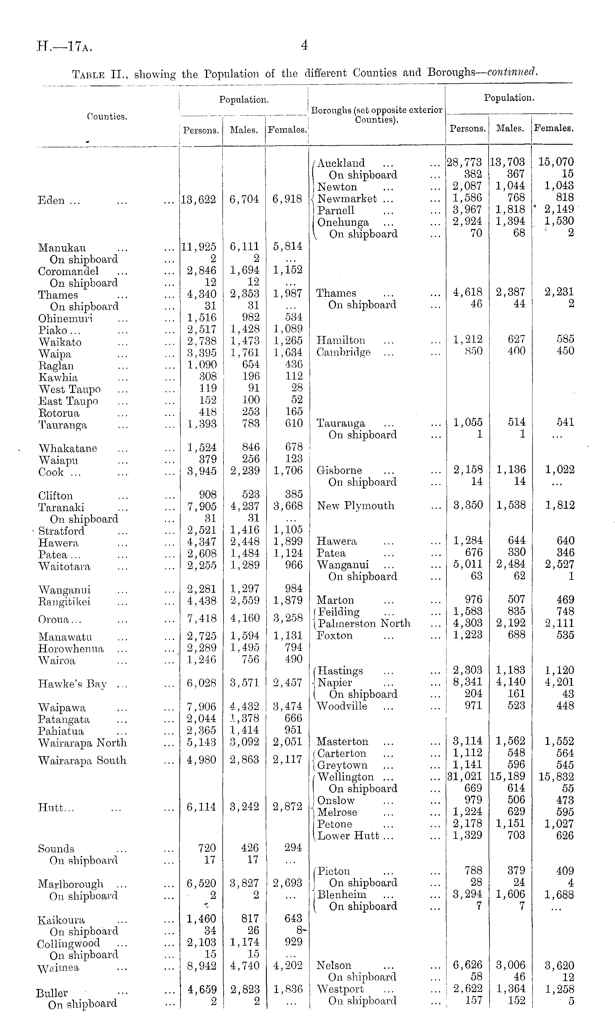 Counties. Population. _ Boroughs (set opposite exterior Counties). Persons. Males. Females. Persons. Males. Females. Population. Eden ... 13,622 6,704 6,918 /Auckland On shipboard Newton < Newmarket ... I Parnell Onehunga \ On shipboard 28,773 382 2,087 1,586 3,967 2,924 70 13,703 367 1,044 768 1,818 1,394 68 15,070 15 1,043 818 2,149 1,530 2 Manukau On shipboard Coromandel On shipboard 11,925 2 2,846 12 4,340 31 1,516 2,517 2,738 3,395 1,090 308 119 152 418 1,393 6,111 2 1,694 12 2,353 31 982 1,428 1,473 1,761 654 196 91 100 253 783 5,814 1,152 Thames On shipboard Ohinemnri Piako ... Waikato Waipa Raglan Kawhia West Taupo East Taupo Eotorua Tauranga 1,987 Thames On shipboard 4,618 46 2,387 44 2,231 2 534 1,089 1,265 1,634 436 112 28 52 165 610 Hamilton Cambridge ... 1,212 850 627 400 585 450 | Tauranga On shipboard 541 1,055 1 514 1 Whakatane Waiapu Cook ... 1,524 379 3,945 846 256 2,239 678 123 1,706 Gisborne On shipboard 1,136 14 1,022 2,158 14 Clifton Taranaki On shipboard Stratford Hawera Patea ... Waitotara 908 7,905 31 2,521 4,347 2,608 2,255 523 4,237 31 1,416 2,448 1,484 1,289 385 3,668 J New Plymouth 3,350 1,538 1,812 1,105 1,899 1,124 966 Hawera Patea Wangairui On shipboard 1,284 676 5,011 63 644 330 2,484 62 640 346 2,527 1 Wanganui Rangitikei 2,281 4,438 1,297 2,559 984 1,879 Marton (Feilding "(Palinerston North Foxton 976 1,583 4,303 1,223 507 835 2,192 688 469 748 2,111 535 Oroiia... ... 7,418 4,160 3,258 Manawatu Horowhenua Wairoa 2,725 2,289 1,246 1,594 1,495 756 1,131 794 490 Hawke's Bay ... 6,028 3,571 2,457 ( Hastings J Napier ( On shipboard Woodville i 2,303 8,341 204 971 1,183 4,140 161 523 1,120 4,201 43 448 Waipawa Patangata Pahiatua Wairarapa North 7,906 2,044 2,365 5,143 4,432 1,378 1,414 3,092 3,474 666 951 2,051 1,562 548 596 15,189 614 506 629 1,151 703 Wairarapa South Hutt... 4,980 6,114 2,863 3,242 2,117 2,872 Masterton f Carterton \ Grey town Wellington ... On shipboard j Onslow ' Melrose Petone Lower Hutt ... 3,114 1,112 1,141 31,021 669 979 1,224 2,178 1,329 1,552 564 545 15,832 55 473 595 1,027 626 Sounds On shipboard 720 17 426 17 294 Marlborough On shipboard 6,520 2 3,827 2 2,693 (Ticton On shipboard 1 Blenheim ( On shipboard 788 28 3,294 7 379 24 1,606 7 409 4 1,688 Kaikoura On shipboard Collingwood On shipboard W raimea 1,460 34 2,103 15 8,942 817 26 1,174 15 4,740 643 8929 4,202 Nelson On shipboard Westport On shipboard 6,626 58 2,622 157 3,006 46 1,364 152 3,620 12 1,258 5 Buller On shipboard 4,659 2 2,823 2 1,836