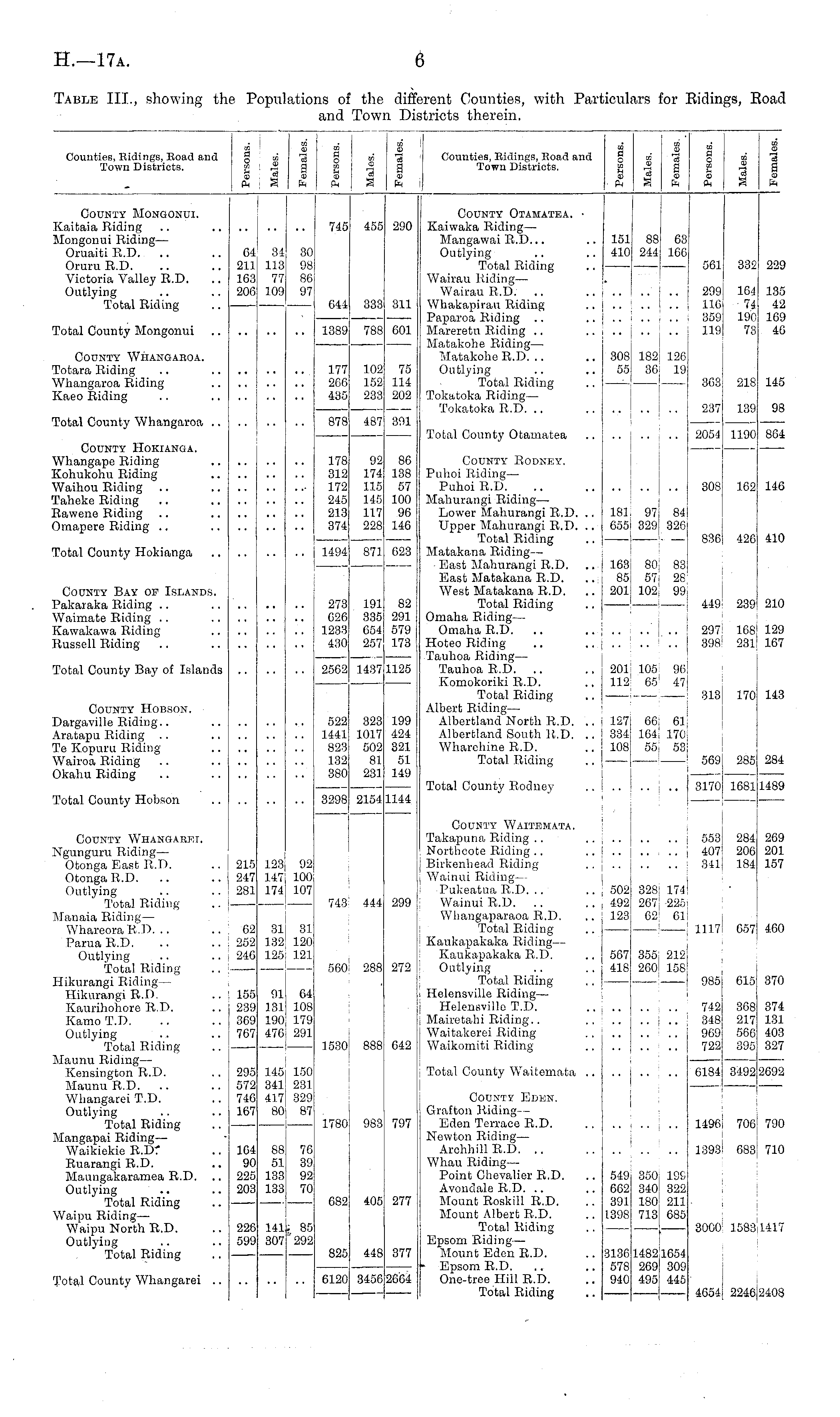 Counties, Ridings, Boad and ', § n Town Districts. : g £ I pm [ a I is I ill O a ft Counties, Ridings, Road and Town Districts. a o g I 03 li "d I 1 o DO ■a a County Mongonui. Kaitaia Riding Mongonui Riding— Oruaiti R.D. Oruru R.D. Victoria Valley R.D. Outlying Total Riding 64' 21l! 163 206 34 I 113 77 109 30 98 86j 97! 745 455 290 County Otamatea. • Kaiwaka Riding— Mangawai R.D. Outlying Total Riding Wairau Riding— Wairau R.D. .. Whakapirau Riding Paparoa Riding Mareretu Riding .. Matakohe Riding— Matakohe R.D. Outlying Total Riding Tokatoka Riding— Tokatoka R.D. 151 410 88 244 63 166 561 332 229 j 299] 116 359! 1191 164! 74 190 73 I 135 42 169 46 . . j I j I 644 333 311 .. rotal County Mongonui , 1 : 1389 788 601 •• < ! • • County Whangaboa. Potara Riding Whangaroa Riding Kaeo Riding 177 266 435 102 152 233 75 114 202 308 55 182 36 126 19 145 363 : 218 878 487 237 139 98 Fotal County Whangaroa .. 391 Total County Otamatea 2054 1190 864 County Hokianga. Whangape Riding Kohukohu Riding Waihou Riding raheke Riding Rawene Riding 3mapere Riding .. 178 312 172 245 213 374 92 174 115 145 117 228 86 138 57 100 96 146 County Rodney. Puhoi Riding — Puhoi R.D. Mahurangi Riding— Lower Mahurangi R.D. .. Upper Mahurangi R.D. .. Total Riding Matakana Riding— East Mahurangi R.D. East Matakana R.D. West Matakana R.D. Total Riding Omaha Riding— Omaha R.D. Hoteo Riding Taulioa Riding— Tauhoa R.D. Komokoriki R.D. Total RidingAlbert Riding— Albertland North R.D. .. Albertland South R.D. .. Wharehine R.D. Total Riding I 308 I 162 146 181 655 97 84 329: 326 410 rotal County Hokianga i 1494 871 623 836 426 County Bay of Islands. Pakaraka Riding .. Waimate Riding Kawakawa Riding Russell Riding i 163; 85| I 201 i 80 83, 57- 28 102 99 210 273 626 1233 430 191 335 654 257 82 291 579 173 449 297 398 239 168: 231 I 129 : 167 • ■ Total County Bay of Islands 2562 1437 1125 201 112' 105 96 ' 65: 47 143 County Hobson. Dargaville Riding.. Aratapu Riding Ie Kopuru Riding Wairoa Riding Okahu Riding 522 1441 823 132 380 323 1017 502 81 231 199 424 321 51 149 127; 334! 108! ; 66 61 i 164 1 170 • 55 53: 313 170 284 ' 1 569 j 285 2154 1144 Total County Rodney ! j 3170J ! 1681 1489 rotal County Hobson 3298 1 1 County WHANGARF.r. Ngunguru Riding— Ofconga East R.D. .. | Otonga R.D. .. Outlying .. Total Riding M'anaia Riding— Whareora R.D. ParuaB.D. OutlyingTotal Riding Hiknrangi Riding— Hikurangi R.D. Kaurihohore R.I). Kamo T.D. Outlying Total Riding Maunu Riding— Kensington R.D. Maunu R.D. Whangarei T.D. Outlying Total Riding Mangapai Riding— Waikiekie R.Df Ruarangi R.D. Maungakaramea R.D. .. Outlying Total Riding Waipu Riding— Waipu North R.D. Outlying Total Riding 215 247 1 281 I 62 : 252 246 123 147; 174, 31 132 1 125 92 100: j 107 31 120 121 743 444 299 County Waitemata. Takapuna Riding Nortbcote Riding .. Birkenhead Riding Wainui Riding— Pnkeatna R.D. Wainui R.D. Wliangnparaoa R.D. Total Riding Kaukapakaka Riding— Kaukapakaka R.D. OutlyingTotal Riding Helensville Riding— Helensville T.D. Mairetalii Riding.. Waitakorei Riding Waikomiti Riding 1 • • 502 492] 123 .. 328: 174 267| 2251 62 61 I i t 553 : 407 1 I 341 1117 284 ! 206 184 657! 269 201 157 I 460 560: 288 272 567 418 355 212: 260: 158! 370 • 155 ; 289 369 767 91 181 190: 476: 64 I 108 ■ 179 : 291 1 I 985j , 615 •• I •• ! ! •• ■• ; 742| ' 348; 969 722 i 3681 : 217' 566 395 I 374 I 131 403 327 1530! 888 642 295 572 746 167 145! 341^ 417; 80j 150 ] 231 ■ 329j I 87 Total County Waitemata .. 6184 3492 2692 County Eden. Grafton Riding— Eden Terrace R.D. Newton Riding— Archhill R.D. Whau Riding— Point Chevalier R.D. Avondale R.D. Mount Roskill R.D. Mount Albert R.D. Total Riding Epsom Riding— Mount Eden R.D. ■ Epsom R.D. One-tree Hill R.D. Total Riding l _! I 1780, 983 797 14961 TOO! ; 790 164 90 225 203 88 51 133 133 76 39 92 70 549 662 391 1398; I 350, 19S 340J 322 180; 211 | 713 685 i i 1393! 683! 710 1 1 682 405 277 3000 1583 226 599 141j 307; L 85 i 292 ,1417 i 825 6120 448 3456 377 20G4 3136 57S 940 14821654 269| 309 495 445 J2408 Total County Whangarei .. I 46541 2246J