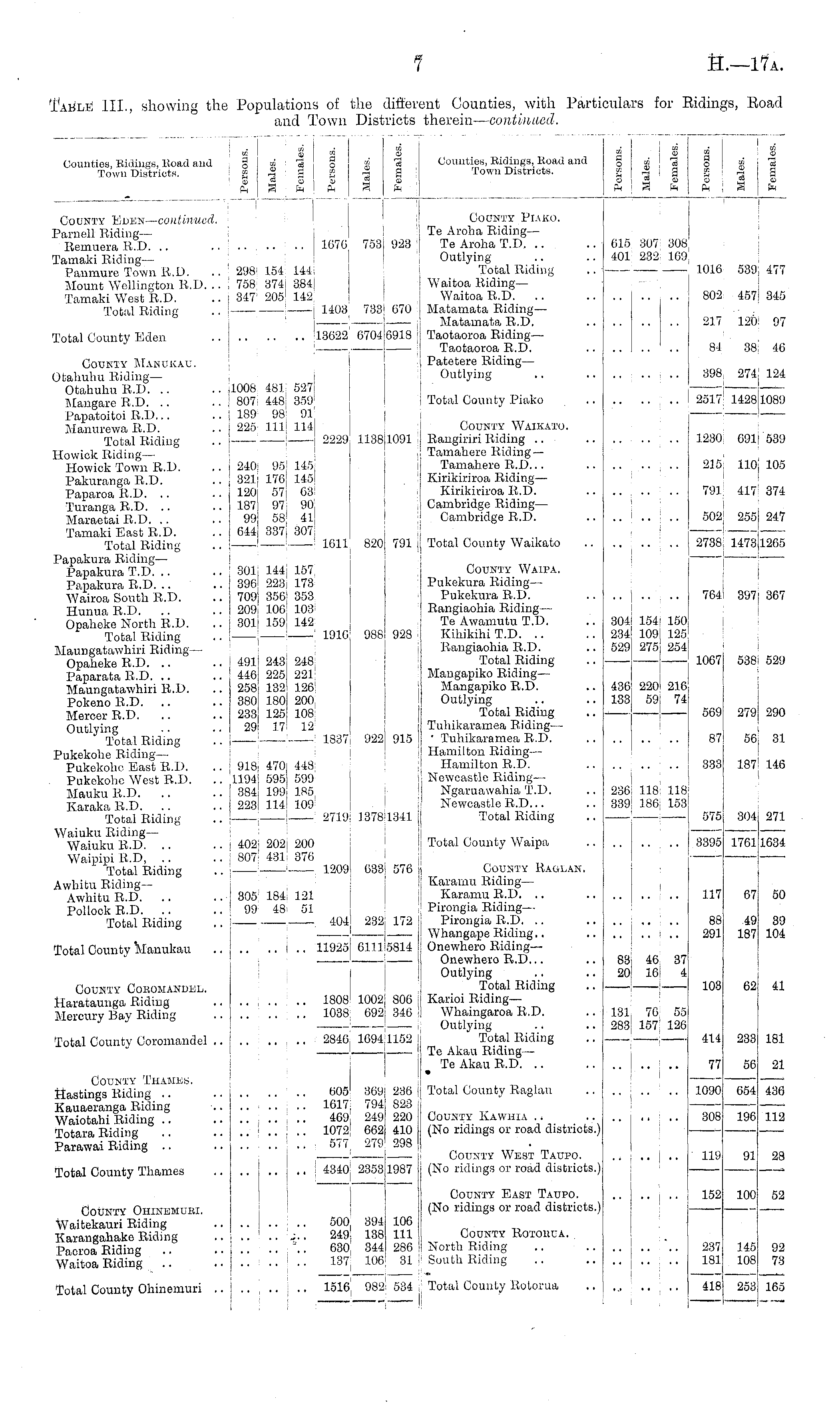 Counties, Killings, Boad ami Town Districts. County Eden— continued. Paruell Riding— Remuera R.D. .. Tamaki Riding — Panmurc Town R.D. Jlount Wellington R.D. .. Tamaki West R.D. Total RidingTotal County Eden en . til 1 8 & o ■• » ft 3 h I fn I ... j .. I .. 167(j' 298; 154 14-1 I 758 374; 3.84) I 347: 2051 142 ' ; 1403 13622 1 753 923 Counties, Bidings, lload and Town Districts. I [ County Piako. : Te Aroha Riding— Te Aroha T.D. Outlying Total Riding Waitoa Riding— Waitoa R.D. .. ! Matamata Riding— Matamata R.D. Taotaoroa Riding— Taotaoroa R.D. I Patetere Riding— Outlying 615 307 308' 401 232 109 i L 11 1 1 I Vi 1 £ ; 3 h i 1016 539, 47' I 802 4571 ! 345 738 ■■ 670 217 120 : 9v 6704 6918 84 38,' j 46 Codkiy Manukau. Otalmhu Riding— Otahuhu R.D. .. Mangare R.D. .. Papatoitoi R.D... Manurewa R.D. Total Riding Howick Riding— Howick Town R.D. Pakuranga R.D. Paparoa R.D. .. Turanga R.D. Maraetai R.D. Tamaki East R.D. Total Riding Papakura Riding— Papakura T.D. Papakura R.D. Wairoa South R.D. Hunua R.D. Opaheko North R.D. Total Riding Maungatawhiri Riding— Opaheke R.D. Paparata R.D. .. Maungatawhiri R.D. Pokeno R.D. Mercer R.D. Outlying Total Riding Pukekohe Riding— Pukekohc East R.D. Pukekohe West R.D. Mauku R.D. Karaka R.D. Total Riding Waiuku Eiding— Waiuku R.D. Waipipi R.D, Total Riding Awhitu Riding— Awhitu R.D. Pollock R.D. Total Biding ,1006 481 527 ' 807: 448! 359; 1 189 98 91 j 225; 111! 114| ! ' ; 1 2229 1 240i 95 145 I 321 176! 145J 120, 57 63: 187! 97 90, 99 58: 4li 644J 337i 307; 1 ' ; 1611 1 '•■ 301! 144! 157 I 396' 223, 173 I 709; 356 1 353 I 209! 106 103; i 8011 159! 142 ! ; 1 1916; I 49l| 243! 248 ! 4461 225 221! 258 1321 126 380 180 200 233 125 108 29! 17 12 ; ' 1 1837, I j 1 918i 470| 448 1194- 595' 599 ! 384 199! 185 223 114; 109 j 402' 202] 200 807' 431! 376 : 1209! 305' 184' 121 99 48 51 ! 404 1138; 820 988 [1091 791 (I 928 Total County Piako County Waikato. Rangiriri Riding .. : Tamahere Riding — Tamabere R.D... I Kirikiriroa Riding— Kirikiriroa R.D. i Cambridge Riding— Cambridge R.D. ; Total County Waikato County Waipa. ! Pukekura Riding— Pukekura R.D. ! Rangiaohia Riding— To Awamutu T.D. Kihikihi T.D. Raugiaohia R.D. Total Riding Mangapiko Riding— Mangapiko R.D. Outlying Total Riding ! Tuhikaramea Riding— !| ' Tuhikaramea R.D. ''] Hamilton Riding Hamilton R.D. • Newcastle Riding— Ngaruawahia T.D. Newcastle R.D... Total Riding I ■ i .. .... i I .... I .... I 304! 154' 150 234! 109! 125! 529J 275| 254| 436! 22oi 216; 133 59 74 398 274 ; i 2517' 1428; j I 1230 691 215 110 793 417 502| 255 I 2738: 1473J 764; 397; I 124 ;1089 1265 539 105 374 247 367 1067 538 529 569; 279J 290 922! 915 87; 56 31 333 187 146 1878 1341 I Total County Waipa 236: 118 118 339J 186; 153 575 3395 304 1761 271 163< Total Comity Manukau I .. : .. I .. 11925; : 232; ! 6111 633 172 i5814 i i 576 County Raulax. ! Karamu Riding— Karamu R.D. Pirongia Riding— Pirongia R.D. .. i Whangape Riding.. ;, Onewhero Riding— Onewhero R.D... Outlying Total Riding ; Karioi Riding— Whaingaroa R.D. Outlying Total Riding !! To Akau Riding— Te Akau R.D. .. 83 46 37 20; 16; 4 117 88 291 67; I 49! 187 50 39 104 COUNTY CoKOMANDEL, Harataunga Riding Mercury Bay Riding 1808 1038 1002; 692J i 806 846 I 131, 70 55 283j 157; 126 103 62 41 Total County Coromandcl ,. 2340 i 1694; 1152 414 288 181 I , <} County Thames. Hastings Riding .. Kauaeranga Riding Waiotahi Riding Totara Riding Parawai Riding ; 605 ...... 1617 .. 469, .. ! .. i .. 1072 1 .. .... 577 77 56 21 • 1090 654 436 605 1617 ...... 469, .. ! .. i .. 1072! .. .... 577 369j 794': 249 ! 662 279 I 236 ; 823 220 410 298 ; Total County Raglan .. ; .. County Kawhia (No ridings or road districts.) 308 196 112 2353 1987 County West Taupo. I (No ridings or road districts.) 119 9] 28 Total County Thames I 4340J I | 4340J ] I : 152 100 52 County Ohinemubi. Waitekauri Riding Karangahake Riding Paeroa Riding Waitoa Riding .. .... 500 .. ' .. b.. 249! .. .. .. 630 137 County East Taupo. (No ridings or road districts.) ! .. .... 500 .. ' .. b.. 249| .. .. .. 630 137 ; 394 : 138 344 106 106 111 286 31 '' County Rotohua. i| North Riding South Riding i 237 181 145 108 92 73 Total County Ohinemuri .. : 1516 ■ 1516 982^ I 534 Total County Rotorua ,. 418 QKQ\ I 165 i