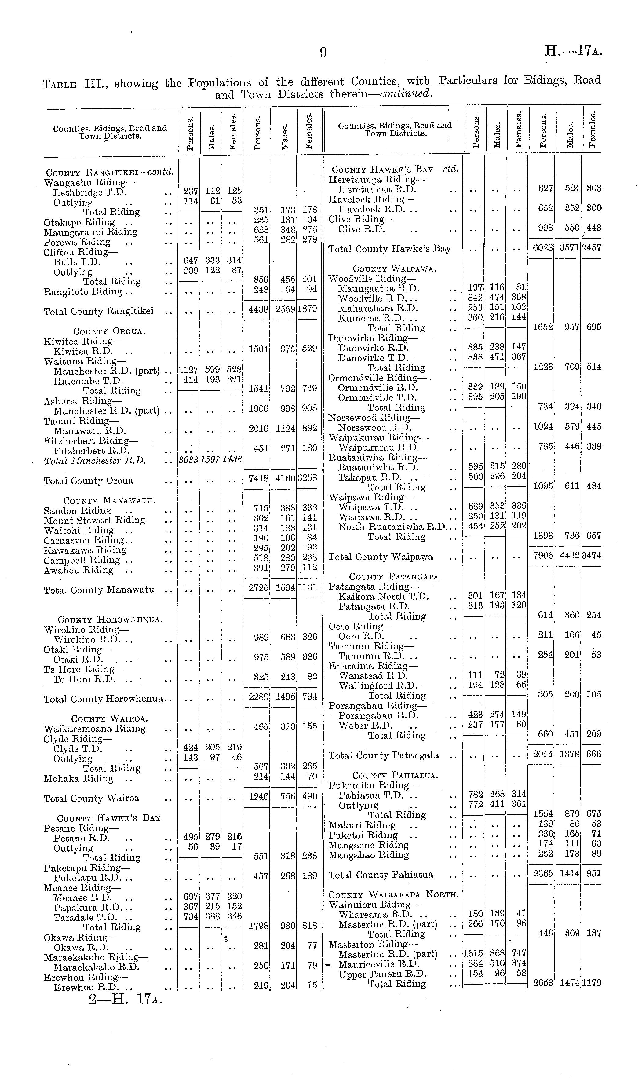 Table III., showing the Populations of the different Counties, with Particulars for Ridings, Road and Town Districts therein — continued.