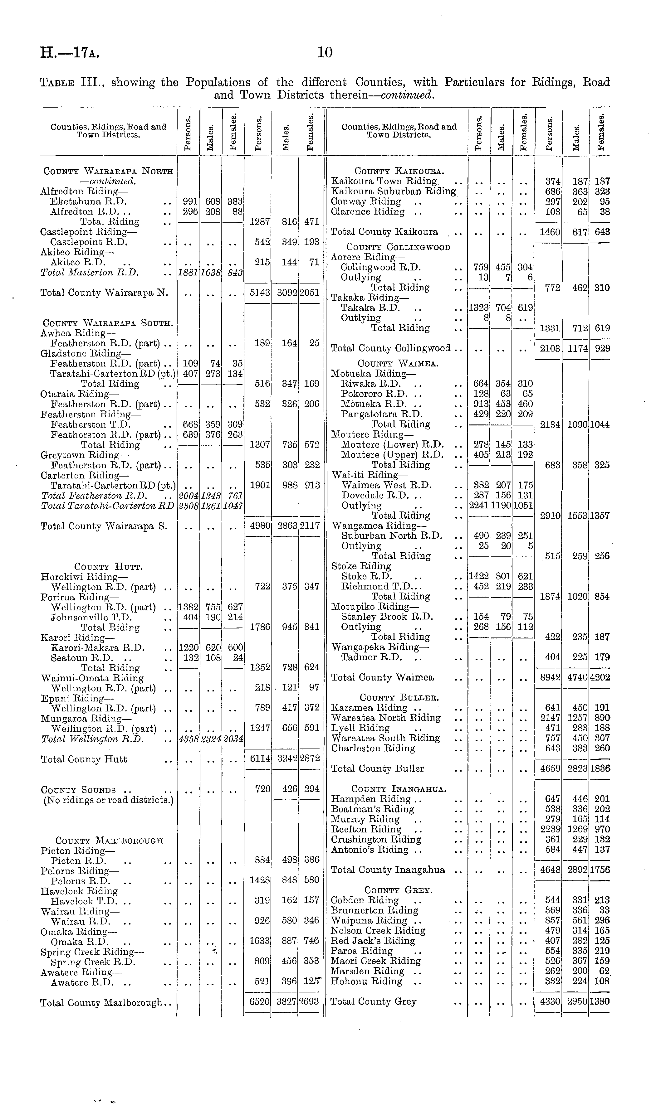 Counties, Ridings, Eoad and g Town Districts. g ft 1 (5 o CD Counties, Riflings, Road and Town Districts. m d o M CD o Is 3 to CD s a o p £ County Waibaeapa Nokth — continued. Alfredton Riding— Eketahuna R.D. Alfredton R.D. Total Riding Castlepoint Riding— Castlepoint R.D. Akiteo Riding— Akiteo R.D. Total Masterton R.D. County Kaikouba. Kaikoura Town Riding Kaikoura Suburban Riding Gonway Riding Clarence Riding 374 686 297 103 187 363 202 65 W 32! 9i 81 991 296 608 208 383 88 1287 816 471 Total County Kaikoura 1460 817 64! 542 349 193 County Collingwood Aorere Riding— Collingwood R.D. Outlying Total Riding Takaka Riding— Takaka R.D. .. Outlying Total Riding 1881 1038 843 215 144 71 759 13 455 7 304 6 Total County Wairarapa N. 5143 3092 2051 772 462 311 1323 8 704 8 619 County Wairaeapa South. Awhea Riding— Featherston R.D. (part) .. Gladstone Riding— Featherston R.D. (part) .. Taratahi-CartertonRD (pt.) Total Riding Otaraia Riding— Featherston R.D. (part) .. Featherston Riding— Featherston T.D. Featherston R.D. (part).. Total Riding Greytown Riding— Featherston R.D. (part).. Carterton Riding— Taratahi-CartertonRD (pt.) Total Featherston R.D. Total Taratahi-Carterton RD 109 407 74 273 35 134 189 516 532 164 347 326 169 206 25 Total County Collingwood .. County Waimea. Motueka Riding— Riwaka R.D. Pokororo R.D. Motueka R.D. .. Pangatotara R.D. Total Riding Moutere Riding— Moutere (Lower) R.D. .. Moutere (Upper) R.D. .. Total Riding Wai-iti Riding— Waimea West R.D. Dovedale R.D. Outlying Total Riding Wangamoa Riding— Suburban North R.D. .. Outlying Total Riding Stoke Riding— Stoke R.D. Richmond T.D. Total Riding Motupiko Riding— Stanley Brook R.D. Outlying Total Riding Wangapeka Riding— Tadmor R.D. 664 128 913 429 354 63 453 220 310 65 460 209 1331 2103 712 1174 61! '.)•£ 668 639 359 376 309 263 2134 1090 104' 1307 735 572 278 405 145 213 133 192 535 303 232 683 :i58 32J 3004 2308 1243 1261 761 1047 1901 988 913 382 287 2241 207 156 1190 175 131 1051 2910 1553 135' Total County Wairarapa S. 4980 2863 2117 490 25 239 20 251 5 County Hutt. Horokiwi Riding— Wellington R.D. (part) .. Porirua Riding— Wellington R.D. (part) .. Johnsonville T.D. Total Riding Karori Riding— Karori-Makara R.D. Seatoun R.D. Total Riding Wainui-Omata Riding— Wellington R.D. (part) .. Epuni Riding— Wellington R.D. (part) .. Mungaroa Riding— Wellington R.D. (part) .. Total Wellington R.D. 1382 404 1220 132 755 190 620 108 627 214 600 24 1786 722 375 945 347 841 1422 452 154 268 801 219 79 156 621 233 75 112 422 404 1874 515 235 225 1020 259 251 85i 18' 17! 1352 728 624 Total County Waimea 8942 4740 97 420! 218 121 2034 789 1247 417 656 372 591 County Bulleb. Karamea Riding .. Wareatea North Riding Lyell Riding Wareatea South Riding Charleston Riding 641 2147 471 757 643 450 1257 283 450 383 19: 89( 181 80' 261 4358 2324 6114 3242 2872 Total County Hutt Total County Buller 4659 2823 183i County Sounds (No ridings or road districts.) 720 426 294 County Inangahua. Hampden Biding Boatman's Riding Murray Riding Reefton Riding Crushington Riding Antonio's Riding 647 538 279 2239 361 584 446 336 165 1269 229 447 20: 20: ii( 97( 13! 13' County Marlbobough Picton Riding— Picton R.D. Pelorus Riding— Pelorus R.D. Havelock Riding— Havelock T.D. Wairau Riding— Wairau R.D. Omaka Riding— Omaka R.D. Spring Creek Riding— Spring Creek R.D. Awatere Rifling— Awatere R.D. 884 1428 319 498 848 162 386 580 157 Total County Inangahua .. County Geey. Cobden Riding Brunnerton Riding Waipuna Riding Nelson Creek Riding Red Jack's Riding Paroa Riding Maori Creek Riding Marsden Riding Hohonu Riding 4648 544 369 857 479 407 554 526 262 332 2892 331 336 561 314 282 335 367 200 224 175i 213 33 296 165 125 219 159 62 108 926 580 346 1033 887 746 809 456 353 521 396 125* Total County Marlborough.. 6520 3827 2693 Total County Grey 4330 2950 1381