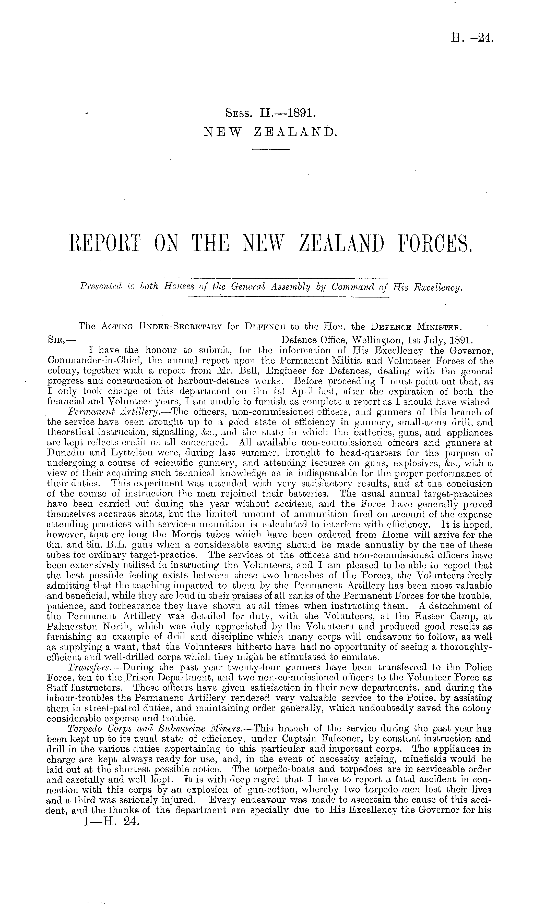 The Acting Undek-Secbetaby for Defence to the Hon. the Defence Ministeb. Sir,— Defence Office, Wellington, Ist July, 1891. I have the honour to submit, for the information of His Excellency the Governor, Commander-in-Chief, the annual report upon the Permanent Militia and Volunteer Forces of the colony, together with a report from Mr. Bell, Engiueer for Defences, dealing with the general progress and construction of harbour-defence works. Before proceeding I must point out that, as I only took charge of this department on the Ist April last, after the expiration of both the financial and Volunteer years, I am unable fco furnish as complete a report as I should have wished Permanent Artillery. —The officers, non-commissioned officers, and gunners of this branch of the service have been brought up to a good state of efficiency in gunnery, small-arms drill, and theoretical instruction, signalling, &c, and the state in which the batteries, guns, and appliances are kept reflects credit on all concerned. All available non-commissioned officers and gunners at Dunediu and Lyttelton were, during last summer, brought to head-quarters for the purpose of undergoing a course of scientific gunnery, and attending lectures on guns, explosives, &c, with a view of their acquiring such technical knowledge as is indispensable for the proper performance of their duties. This experiment was attended with very satisfactory results, and at the conclusion of the course of instruction the men rejoined their batteries. The usual annual target-practices have been carried out during the year without accident, and the Force have generally proved themselves accurate shots, but the limited amount of ammunition fired on account of the expense attending practices with service-ammunition is calculated to interfere with efficiency. It is hoped, however, that ere long the Morris tubes which have been ordered from Home will arrive for the 6in. and Bin. B.L. guns when a considerable saving should be made annually by the use of these tubes for ordinary target-practice. The services of the officers and non-commissioned officers have been extensively utilised in instructing the Volunteers, and I am pleased to be able to report that the best possible feeling exists between these two branches of the Forces, the Volunteers freely admitting that the teaching imparted to them by the Permanent Artillery has been most valuable and beneficial, while they are loud in their praises of all ranks of the Permanent Forces for the trouble, patience, and forbearance they have shown at all times when instructing them. A detachment of the Permanent Artillery was detailed for duty, with the Volunteers, at the Easter Camp, at Palmerston North, which was duly appreciated by the Volunteers and produced good results as furnishing an example of drill and discipline which many corps will endeavour to follow, as well as supplying a want, that the Volunteers hitherto have had no opportunity of seeing a thoroughlyefficient and well-drilled corps which they might be stimulated to emulate. Transfers. —During the past year twenty-four gunners have been transferred to the Police Force, ten to the Prison Department, and two non-commissioned officers to the Volunteer Force as Staff Instructors. These officers have given satisfaction in their new departments, and during the labour-troubles the Permanent Artillery rendered very valuable service to the Police, by assisting them in street-patrol duties, and maintaining order generally, which undoubtedly saved the colony considerable expense and trouble. Torpedo Corps and Submarine Miners. —This branch of the service during the past year has been kept up to its usual state of efficiency, under Captain Falconer, by constant instruction and drill in the various duties appertaining to this particular and important corps. The appliances in charge are kept always ready for use, and, in the event of necessity arising, minefields would be laid out at the shortest possible notice. The torpedo-boats and torpedoes are in serviceable order and carefully and well kept. It is with deep regret that I have to report a fatal accident in connection with this corps by an explosion of gun-cotton, whereby two torpedo-men lost their lives and a third was seriously injured. Every endeavour was made to ascertain the cause of this accident, and the thanks of the department are specially due to His Excellency the Governor for his I—H. 24.