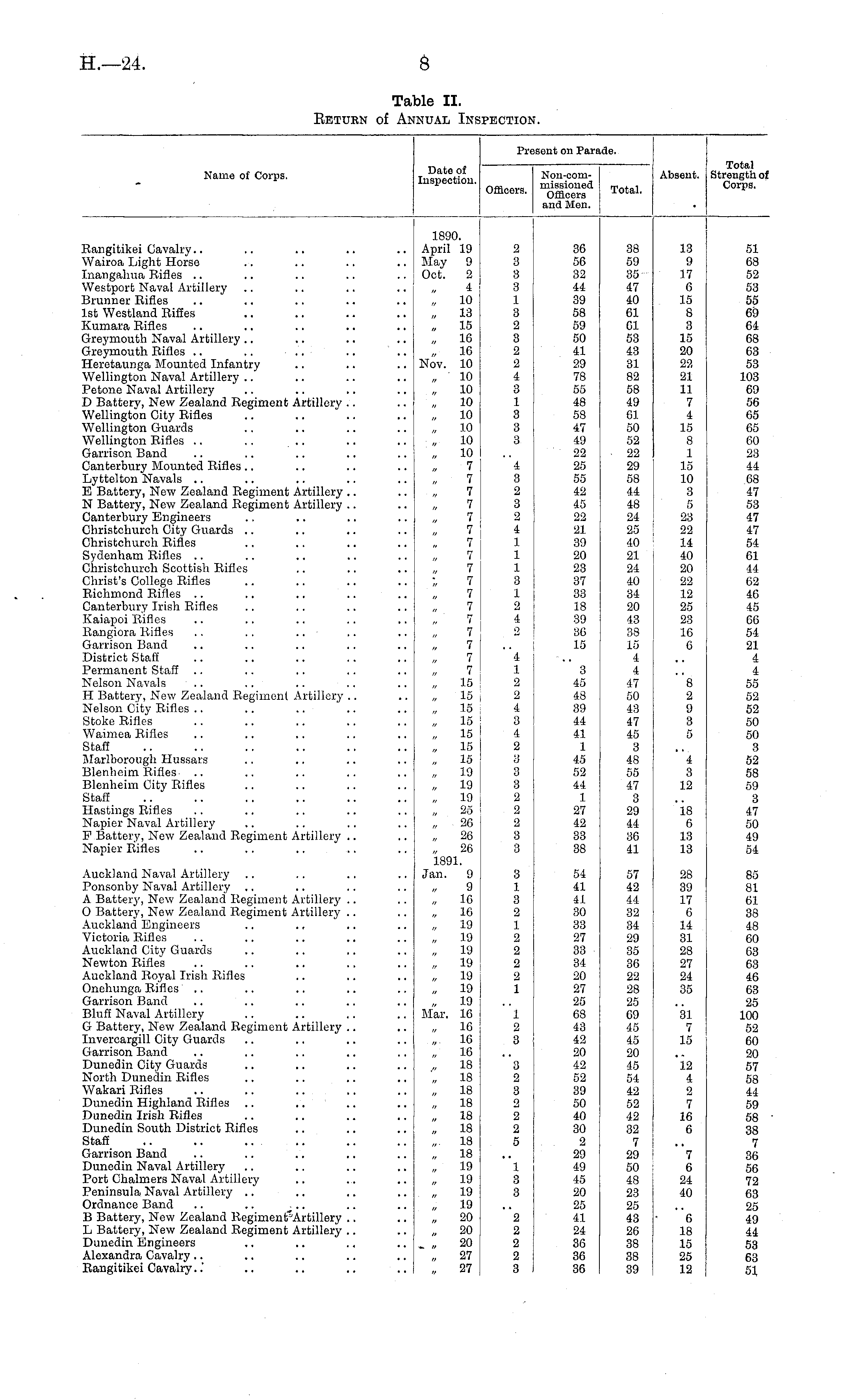 Pri :sent on Pan tde. Name of Corps. Date of Inspection. Non-com-missioned Officers and Men. Absent. Total Strength of Corps. Officers. Total. Rangitikei Cavalry.. Wairoa Light Horse Inangahua Rifles Westport Naval Artillery Brunner Rifles 1st Westland Riffes Kumara Rifles Greymouth Naval Artillery Greymouth Rifles .. .. .. Heretaunga Mounted Infantry Wellington Naval Artillery Petone Naval Artillery D Battery, New Zealand Regiment Artillery .. Wellington City Rifles Wellington Guards Wellington Rifles .. .. Garrison Band Canterbury Mounted Rifles Lyttelton Navals .. E Battery, New Zealand Regiment Artillery .. N Battery, New Zealand Regiment Artillery .. Canterbury Engineers Christchurch City Guards Christchurch Rifles Sydenham Rifles Christchurch Scottish Rifles Christ's College Rifles Richmond Rifles .. .. .. Canterbury Irish Rifles Kaiapoi Rifles Rangiora Rifles Garrison Band District Staff Permanent Staff Nelson Navals H Battery, New Zealand Regiment Artillery .. Nelson City Rifles Stoke Rifles Waimea Rifles Staff Marlborough Hussars Blenheim Rifles Blenheim City Rifles Staff Hastings Rifles Napier Naval Artillery F Battery, New Zealand Regiment Artillery .. Napier Rifles 1890. April 19 May 9 Oct. 2 4 10 „ 13 15 16 16 Nov. 10 10 10 10 10 10 10 10 7 7 7 7 I 7 7 7 « 7 7 7 7 7 „ 7 7 7 7 7 15 „ 15 15 15 15 15 15 19 19 19 25 20 26 „ 26 1891. Jan. 9 9 16 16 19 19 19 19 19 19 19 Mar. 16 16 16 16 18 18 „ 18 18 18 18 18 18 19 19 19 19 20 20 20 „ 27 27 2 3 3 3 1 3 2 3 2 2 4 3 1 3 3 3 4 3 2 3 2 4 1 1 1 3 1 2 4 2 4 1 2 2 4 3 4 2 3 3 3 2 2 2 3 3 36 56 32 44 39 58 59 50 41 29 78 55 48 58 47 49 22 25 55 42 45 22 21 39 20 23 37 33 18 39 36 15 3 45 48 39 44 41 1 45 52 44 1 27 42 33 38 38 59 35 47 40 61 61 53 43 31 82 58 49 61 50 52 22 29 58 44 48 24 25 40 21 24 40 34 20 43 38 15 4 4 47 50 43 47 45 3 48 55 47 3 29 44 36 41 13 9 17 6 15 8 3 15 20 22 21 11 7 4 15 8 1 15 10 3 5 23 22 14 40 20 22 12 25 23 16 6 8 2 9 3 5 51 68 52 53 55 69 64 68 63 53 103 69 56 65 65 60 23 44 68 47 53 47 47 54 61 44 62 46 45 66 54 21 4 4 55 52 52 50 50 3 52 58 59 3 47 50 49 54 4 3 12 18 6 13 13 Auckland Naval Artillery Ponsonby Naval Artillery A Battery, New Zealand Regiment Artillery .. O Battery, New Zealand Regiment Artillery .. Auckland Engineers Victoria Rifles Auckland City Guards Newton Rifles Auckland Royal Irish Rifles Onehunga Rifles Garrison Band Bluff Naval Artillery G Battery, New Zealand Regiment Artillery .. Invercargill City Guards Garrison Band Dunedin City Guards North Dunedin Rifles Wakari Rifles Dunedin Highland Rifles Dunedin Irish Rifles Dunedin South District Rifles Staff Garrison Band Dunedin Naval Artillery Port Chalmers Naval Artillery Peninsula Naval Artillery Ordnance Band .. .. B Battery, New Zealand Regiment Artillery .. L Battery, New Zealand Regiment Artillery .. Dunedin Engineers Alexandra Cavalry Rangitikei Cavalry 3 1 3 2 1 2 2 2 2 1 1 2 3 3 2 3 2 2 2 5 54 41 41 30 33 27 33 34 20 27 25 68 43 42 20 42 52 39 50 40 30 2 29 49 45 20 25 41 24 36 36 36 57 42 44 32 34 29 35 36 22 28 25 69 45 45 20 45 54 42 52 42 32 7 29 50 48 23 25 43 26 38 38 39 28 39 17 6 14 31 28 27 24 35 31 7 15 12 4 2 7 16 6 85 81 61 38 48 60 63 63 46 63 25 100 52 60 20 57 58 44 59 58 38 7 36 56 72 63 25 49 ii 53 63 51 1 3 3 7 6 24 40 2 2 2 2 3 j. 6 18 15 25 12