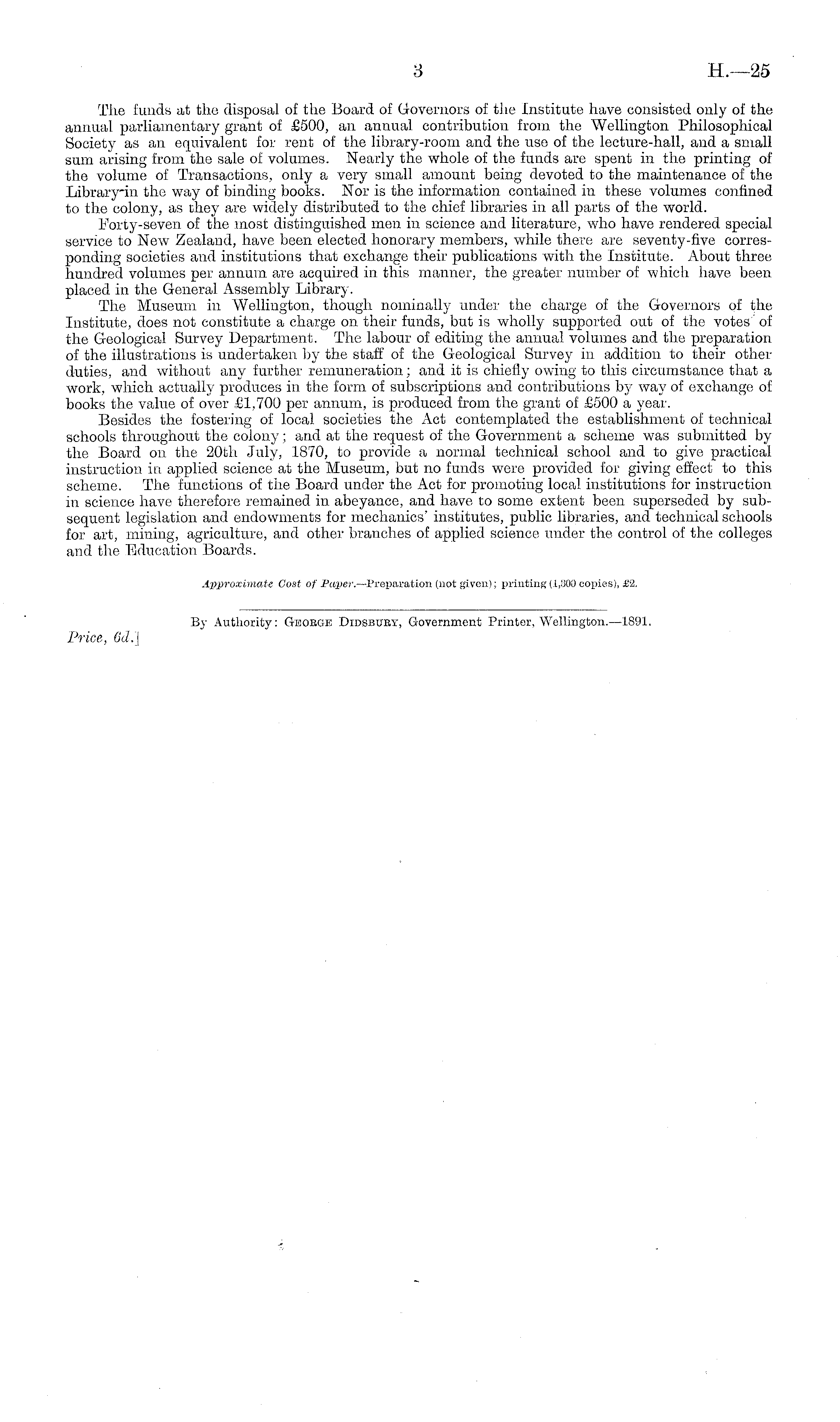 The funds at tho disposal of the Board of Governors of the Institute have consisted only of the annual parliamentary grant of £500, an annual contribution from the Wellington Philosophical Society as an equivalent for rent of the library-room and the use of the lecture-hall, and a small sum arising from the sale of volumes. Nearly the whole of the funds are spent in the printing of the volume of Transactions, only a very small amount being devoted to the maintenance of the Library-in the way of binding books. Nor is the information contained in these volumes confined to the colony, as they are widely distributed to the chief libraries in all parts of the world. Forty-seven of the most distinguished men in science and literature, who have rendered special service to New Zealand, have been elected honorary members, while there are seventy-five corresponding societies and institutions that exchange their publications with the Institute. About three hundred volumes per annum are acquired in this manner, the greater number of which have been placed in the General Assembly Library. The Museum in Wellington, though nominally under the charge of the Governors of the Institute, does not constitute a charge on their funds, but is wholly supported out of the votes of the Geological Survey Department. The labour of editing the annual volumes and the preparation of the illustrations is undertaken by the staff of the Geological Survey in addition to their other duties, and without any further remuneration; and it is chiefly owing to this circumstance that a work, which actually produces in the form of subscriptions and contributions by way of exchange of books the value of over £1,700 per annum, is produced from the grant of £500 a year. Besides the fostering of local societies the Act contemplated the establishment of technical schools throughout the colony; and at the request of tho Government a scheme was submitted by the Board on the 20th July, 1870, to provide a normal technical school and to give practical instruction in applied science at the Museum, but no funds were provided for giving effect to this scheme. The functions of the Board under the Act for promoting local institutions for instruction in science have therefore remained in abeyance, and have to some extent been superseded by subsequent legislation and endowments for mechanics' institutes, public libraries, and technical schools for art, mining, agriculture, and other branches of applied science under the control of the colleges and the Education Boards.