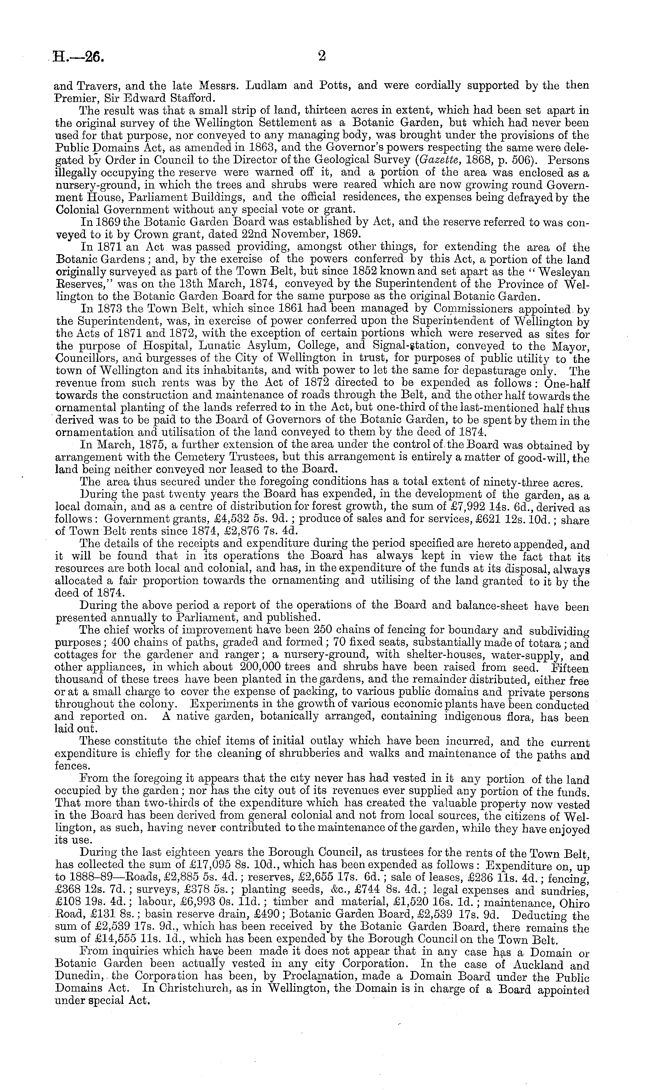 and Travers, and the late Messrs. Ludlam and Potts, and were cordially supported by the then Premier, Sir Edward Stafford. The result was that a small strip of land, thirteen acres in extent, which had been set apart in the original survey of the Wellington Settlement as a Botanic Garden, but which had never been used for that purpose, nor conveyed to any managing body, was brought under the provisions of the Public Domains Act, as amended in 1863, and the Governor's powers respecting the same were delegated by Order in Council to the Director of the Geological Survey (Gazette, 1868, p. 506). Persons illegally occupying the reserve were warned off it, and a portion of the area was enclosed as a nursery-ground, in which the trees and shrubs were reared which are now growing round Government House, Parliament Buildings, and the official residences, the expenses being defrayed by the Colonial Government without any special vote or grant. In 1869 the Botanic Garden Board was established by Act, and the reserve referred to was conveyed to it by Crown grant, dated 22nd November, 1869. In 1871 an Act was passed providing, amongst other things, for extending the area of the Botanic Gardens ; and, by the exercise of the powers conferred by this Act, a portion of the land originally surveyed as part of the Town Belt, but since 1852 known and set apart as the " Wesleyan Eeserves," was on the 13th March, 1874, conveyed by the Superintendent of the Province of Wellington to the Botanic Garden Board for the same purpose as the original Botanic Garden. In 1873 the Town Belt, which since 1861 had been managed by Commissioners appointed by the Superintendent, was, in exercise of power conferred upon the Superintendent of Wellington by the Acts of 1871 and 1872, with the exception of certain portions which were reserved as sites for the purpose of Hospital, Lunatic Asylum, College, and Signal-station, conveyed to the Mayor, Councillors, and burgesses of the City of Wellington in trust, for purposes of public utility to the town of Wellington and its inhabitants, and with power to let the same for depasturage only. The revenue from such rents was by the Act of 1872 directed to be expended as follows : One-half towards the construction and maintenance of roads through the Belt, and the other half towards the ornamental planting of the lands referred to in the Act, but one-third of the last-mentioned half thus derived was to be paid to the Board of Governors of the Botanic Garden, to be spent by them in the ornamentation and utilisation of the land conveyed to them by the deed of 1874. In March, 1875, a further extension of the area under the control of. the Board was obtained by arrangement with the Cemetery Trustees, but this arrangement is entirely a matter of good-will, the land being neither conveyed nor leased to the Board. The area thus secured under the foregoing conditions has a total extent of ninety-three acres. During the past twenty years the Board has expended, in the development of the garden, as a local domain, and as a centre of distribution for forest growth, the sum of £7,992 14s. 6d., derived as follows : Government grants, £4,532 ss. 9d. ; produce of sales and for services, £621 12s. lOd.; share of Town Belt rents since 1874, £2,876 7s. 4d. The details of the receipts and expenditure during the period specified are hereto appended, and it will be found that in its operations the Board has always kept in view the fact that its resources are both local and colonial, and has, in the expenditure of the funds at its disposal, always allocated a fair proportion towards the ornamenting and utilising of the land granted to it by the deed of 1874. During the above period a report of the operations of the Board and balance-sheet have been presented annually to Parliament, and published. The chief works of improvement have been 250 chains of fencing for boundary and subdividing purposes; 400 chains of paths, graded and formed; 70 fixed seats, substantially made of totara ; and cottages for the gardener and ranger; a nursery-ground, with shelter-houses, water-supply, and other appliances, in which about 200,000 trees and shrubs have been raised from seed. I'ifteen thousand of these trees have been planted in the gardens, and the remainder distributed, either free or at a small charge to cover the expense of packing, to various public domains and private persons throughout the colony. Experiments in the growth of various economic plants have been conducted and reported on. A native garden, botanically arranged, containing indigenous flora, has been laid out. These constitute the chief items of initial outlay which have been incurred, and the current expenditure is chiefly for the cleaning of shrubberies and walks and maintenance of the paths and fences. From the foregoing it appears that the city never has had vested in it any portion of the land occupied by the garden; nor has the city out of its revenues ever supplied any portion of the funds. That more than two-thirds of the expenditure which has created the valuable property now vested in the Board has been derived from general colonial and not from local sources, the citizens of Wellington, as such, having never contributed to the maintenance of the garden, while they have enjoyed its use. During the last eighteen years the Borough Council, as trustees for the rents of the Town Belt, has collected the sum of £17,095 Bs. 10d., which has been expended as follows : Expenditure on, up to 1888-89—Eoads, £2,885 ss. 4d.; reserves, £2,655 17s. 6d.; sale of leases, £236 11s. 4d.; fencing, £368 12s. 7d.; surveys, £378 55.; planting seeds, &c, £744 Bs. 4d.; legal expenses and sundries, £108 19s. 4d.; labour, £6,993 os. lid. ; timber and material, £1,520 16s. Id. ; maintenance, Ohiro Eoad, £131 Bs.; basin reserve drain, £490; Botanic Garden Board, £2,539 17s. 9d. Deducting the sum of £2,539 17s. 9d., which has been received by the Botani