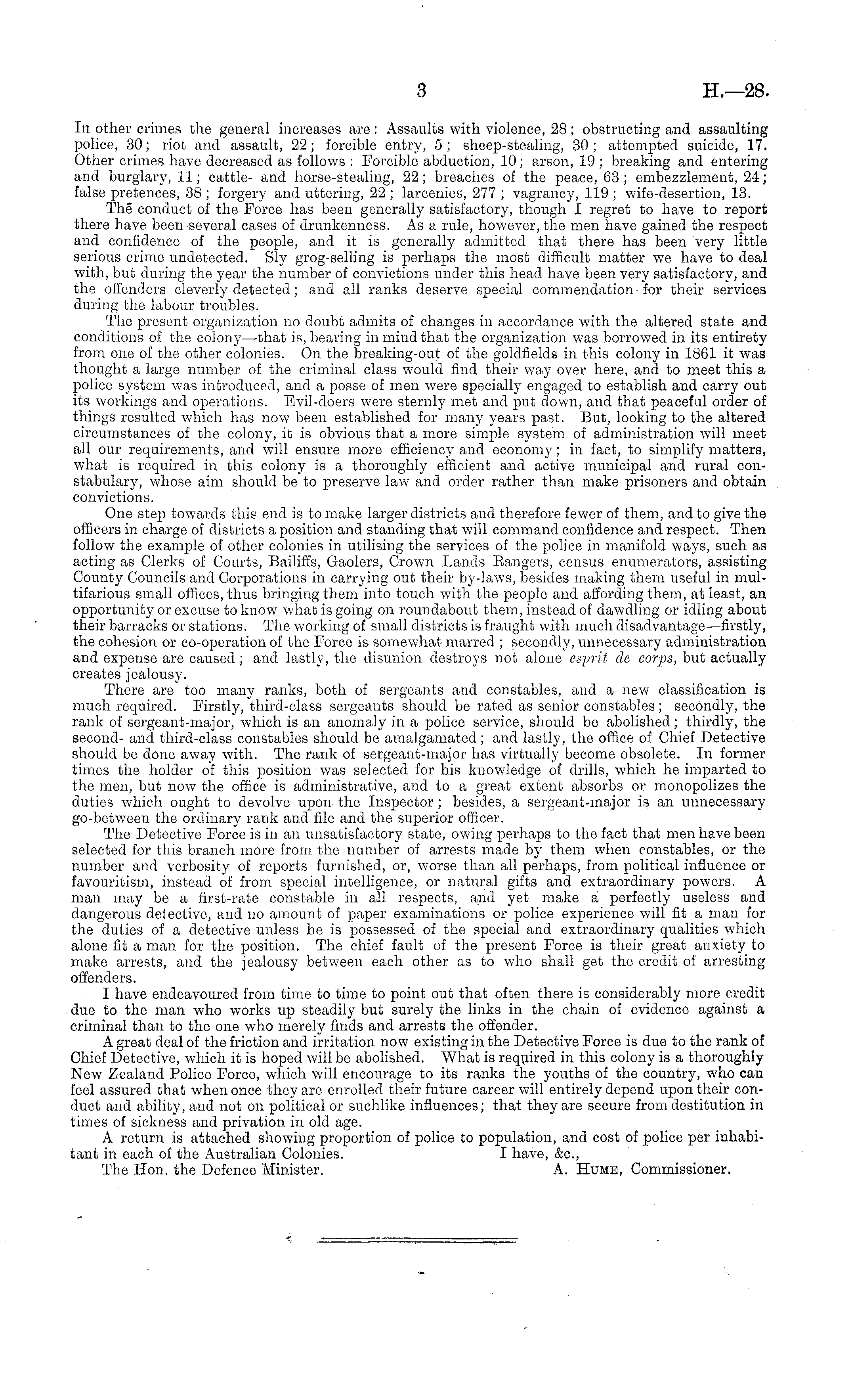 In other crimes the general increases are : Assaults with violence, 28; obstructing and assaulting police, 30; riot and assault, 22; forcible entry, 5; sheep-stealing, 30; attempted suicide, 17. Other crimes have decreased as follows : Forcible abduction, 10; arson, 19 ; breaking and entering and burglary, 11; cattle- and horse-stealing, 22; breaches of the peace, 63; embezzlement, 24; false pretences, 38 ; forgery and uttering, 22 ; larcenies, 277 ; vagrancy, 119 ; wife-desertion, 13. The conduct of the Force has been generally satisfactory, though I regret to have to report there have been several cases of drunkenness. As a rule, however, the men have gained the respect and confidence of the people, and it is generally admitted that there has been very little serious crime undetected. Sly grog-selling is perhaps the most difficult matter we have to deal with, but during the year the number of convictions under this head have been very satisfactory, and the offenders cleverly detected; and all ranks deserve special commendation for their services during the labour troubles. The present organization no doubt admits of changes in accordance with the altered state and conditions of the colony—that is, bearing in mind that the organization was borrowed in its entirety from one of the other colonies. On the breaking-out of the goldfields in this colony in 1861 it was thought a large number of the criminal class would find their way over here, and to meet this a police system was introduced, and a posse of men were specially engaged to establish and carry out its workings and operations. Evil-doers were sternly met and put down, and that peaceful order of things resulted which has now been established for many years past. But, looking to the altered circumstances of the colony, it is obvious that a more simple system of administration will meet all our requirements, and will ensure more efficiency and economy; in fact, to simplify matters, what is required in this colony is a thoroughly efficient and active municipal and rural constabulary, whose aim should be to preserve law and order rather than make prisoners and obtain convictions. One step towards this end is to make larger districts aud therefore fewer of them, and to give the officers in charge of districts a position and standing that will command confidence and respect. Then follow the example of other colonies in utilising the services of the police in manifold ways, such as acting as Clerks of Courts, Bailiffs, Gaolers, Crown Lands Rangers, census enumerators, assisting County Councils and Corporations in carrying out their by-laws, besides making them useful in multifarious small offices, thus bringing them into touch with the peojxle and affording them, at least, an opportunity or excuse to know what is going on roundabout them, instead of dawdling or idling about their barracks or stations. The working of small districts is fraught with much disadvantage—firstly, the cohesion or co-operation of the Force is somewhat marred ; secondly, unnecessary administration and expense are caused; and lastly, the disunion destroys not alone esprit de corps, but actually creates jealousy. There are too many ranks, both of sergeants and constables, aud a new classification is much required. Firstly, third-class sergeants should be rated as senior constables ; secondly, the rank of sergeant-major, which is an anomaly in a police service, should be abolished; thirdly, the second- and third-class constables should be amalgamated; and lastly, the office of Chief Detective should be done away with. The rank of sergeant-major has virtually become obsolete. In former times the holder of this position was selected for his knowledge of drills, which he imparted to the men, but now the office is administrative, and to a great extent absorbs or monopolizes the duties which ought to devolve upon the Inspector; besides, a sergeant-major is an unnecessary go-between the ordinary rank and file and the superior officer. The Detective Force is in an unsatisfactory state, owing perhaps to the fact that men have been selected for this branch more from the number of arrests made by them when constables, or the number and verbosity of reports furnished, or, worse than all perhaps, from political influence or favouritism, instead of from special intelligence, or natural gifts and extraordinary powers. A man may be a first-rate constable in all respects, and yet make a perfectly useless and dangerous defective, and no amount of paper examinations or police experience will fit a man for the duties of a detective unless he is possessed of the special and extraordinary qualities which alone fit a man for the position. The chief fault of the present Force is their great anxiety to make arrests, and the jealousy between each other as to who shall get the credit of arresting offenders. I have endeavoured from time to time to point out that often there is considerably more credit due to the man who works up steadily but surely the links in the chain of evidence against a criminal than to the one who merely finds and arrests the offender. A great deal of the friction and irritation now existing in the Detective Force is due to the rank of Chief Detective, which it is hoped will be abolished. What is required in this colony is a thoroughly New Zealand Police Force, which will encourage to its ranks the youths of the country, who can feel assured that when once they are enrolled their future career will entirely depend upon their conduct and ability, and not on political or suchlike influences; that they are secure from destitution in times of sickness and privation in old age. A return is attached showing proportion of police to population, and cost of police per inhabitant in each of the Australian Colonies. I have, &c, The Hon. the Defence Minister. A. Hume, Commissioner.