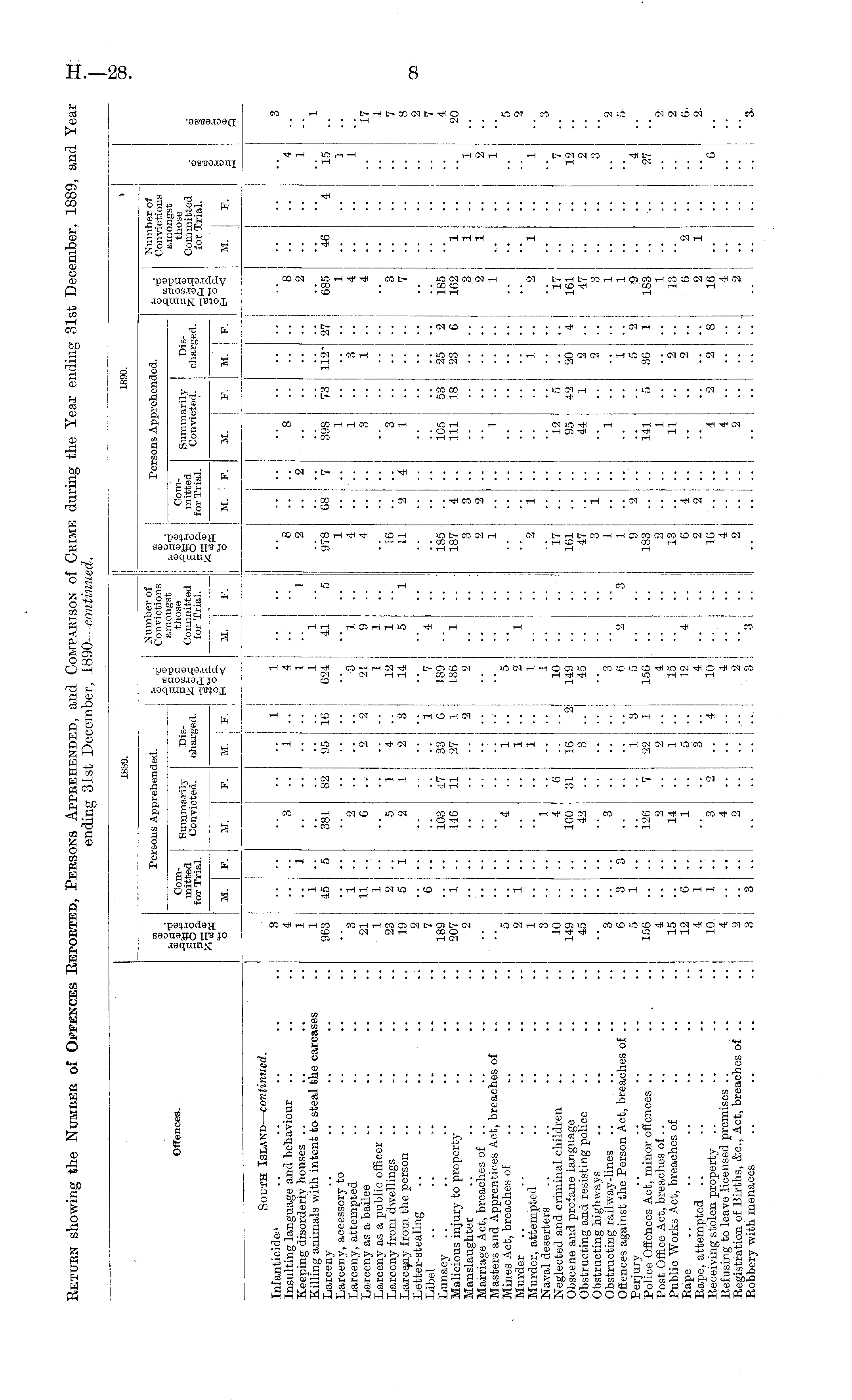 Return showing the Number of Offences Reported, Persons Apprehended, and Comparison of Crime during the Year ending 31st December, 1889, and Year ending 31st December, 1890— continued.