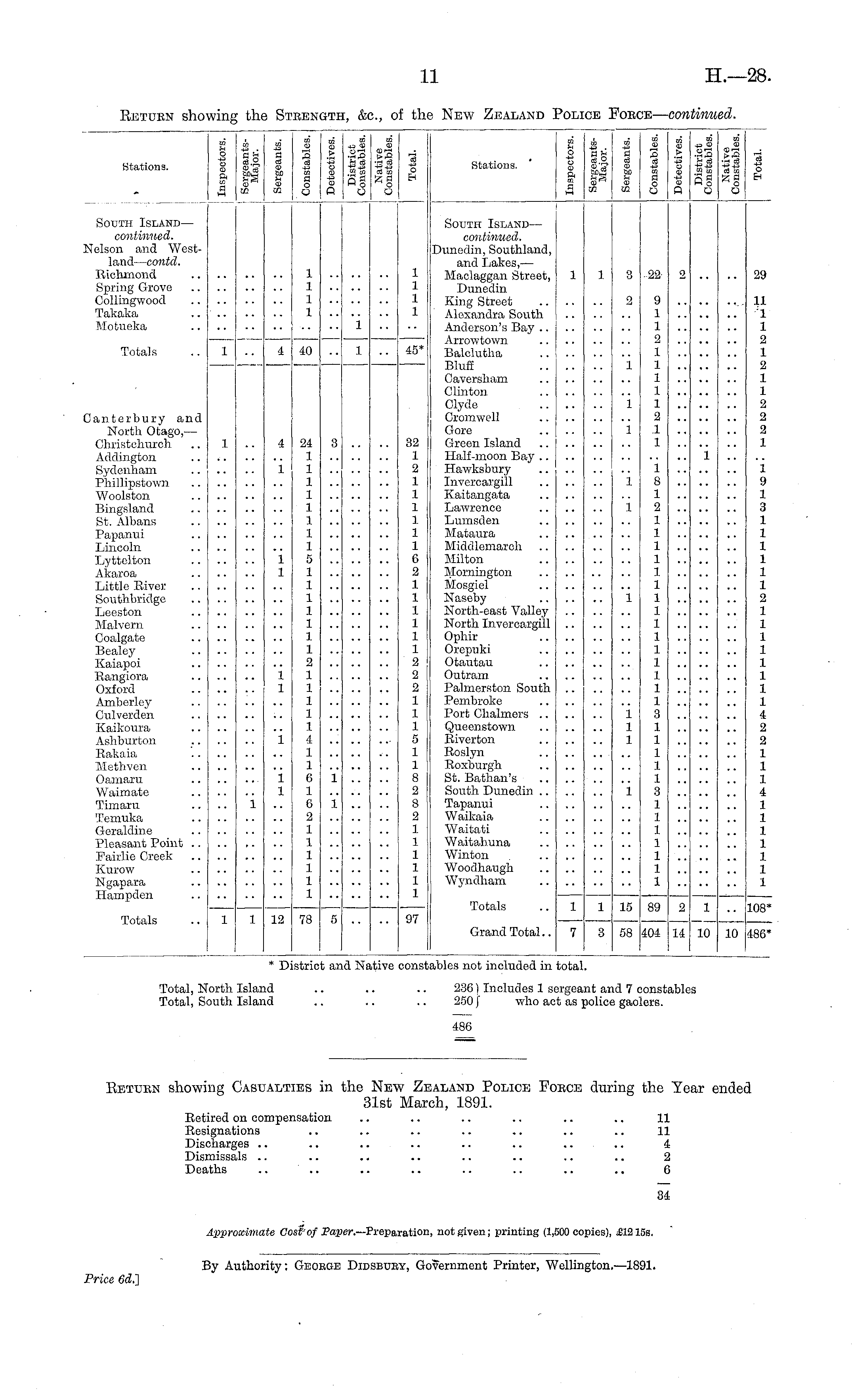 Eetuen showing Casualties in the New Zealand Police Foece during the Year ended 31st March, 1891. Betired on compensation .. .. .. .. .. .. 11 Resignations .. .. .. .. .. .. .. 11 Discharges .. .. .. .. .. .. .. .. 4 Dismissals .. .. .. .. .. .. .. .. 2 Deaths .. .. .. .. .. .. .. .. 6 34 Approximate Cost of Paper.— Preparation, not given; printing (1,500 copies), £12 155.