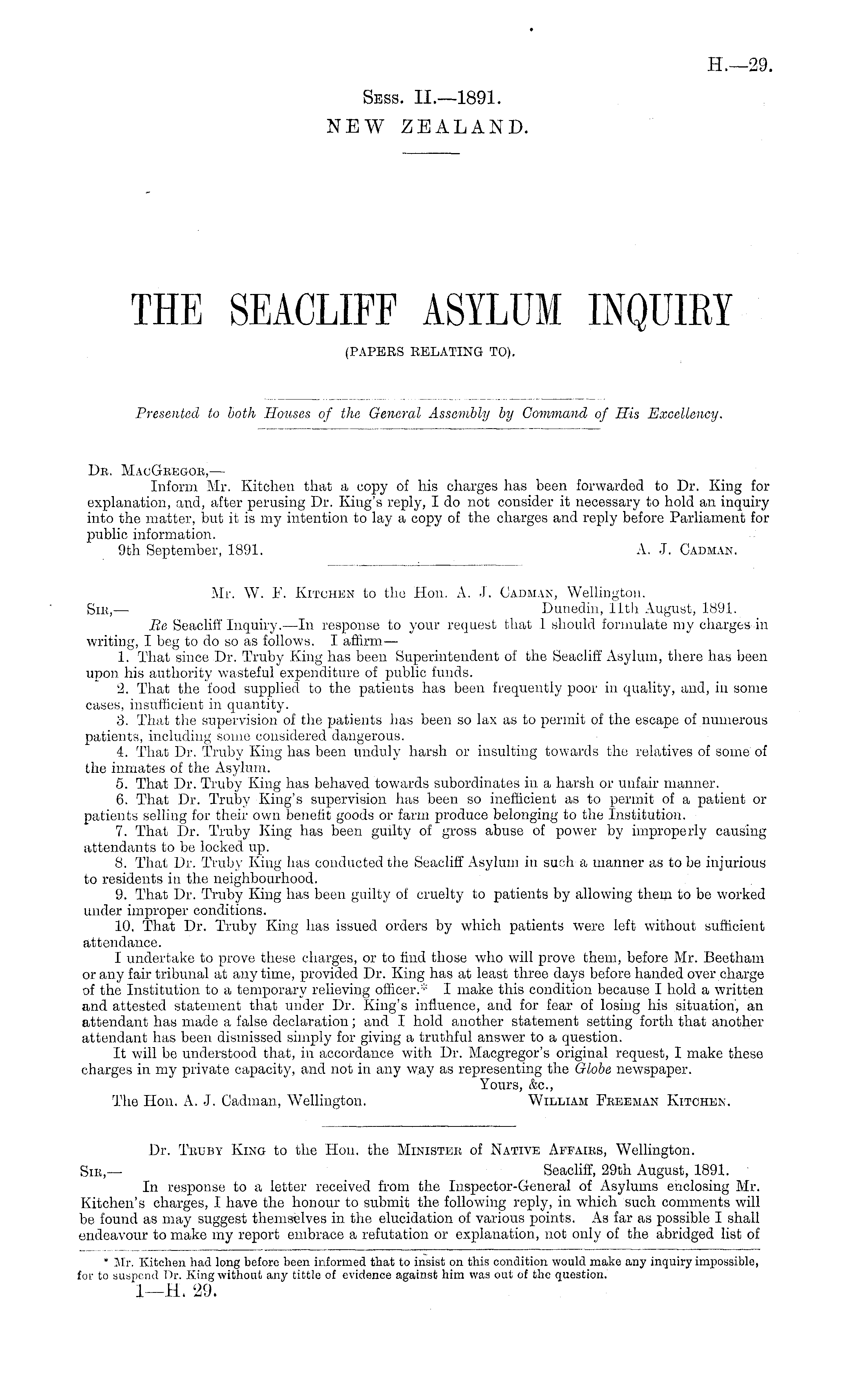 Mr. W. F. Kitchen to the Hon. A. J. Cadman, Wellington. Bib,— Dunedin, 11th August, 1891. Be Seacliff Inquiry.—ln response to your request that I should formulate my charges in writing, I beg to do so as follows. I affirm— 1. That since Dr. Truby King has been Superintendent of the Seacliff Asylum, there has been upon his authority wasteful expenditure of public funds. 2. That the food supplied to the patients has been frequently poor in quality, and, in some cases, insufficient in quantity. 3. That the supervision of the patients has been so lax as to permit of the escape of numerous patients, including some considered dangerous. 4. That Dr. Truby King has been unduly harsh or insulting towards the relatives of some of the inmates of the Asylum. 5. That Dr. Truby King has behaved towards subordinates in a harsh or unfair manner. 6. That Dr. Truby King's supervision has been so inefficient as to permit of a patient or patients selling for their own benefit goods or farm produce belonging to the Institution. 7. That Dr. Truby King has been guilty of gross abuse of power by improperly causing attendants to be locked up. 8. That Dr. Truby King has conducted the Seacliff Asylum in such a manner as to be injurious to residents in the neighbourhood. 9. That Dr. Truby King has been guilty of cruelty to patients by allowing them to be worked under improper conditions. 10. That Dr. Truby King has issued orders by which patients were left without sufficient attendance. I undertake to prove these charges, or to find those who will prove them, before Mr. Beetham or any fair tribunal at anytime, provided Dr. King has at least three days before handed over charge of the Institution to a temporary relieving officer.* I make this condition because I hold a written and attested statement that under Dr. King's influence, and for fear of losing his situation, an attendant has made a false declaration; and I hold another statement setting forth that another attendant has been dismissed simply for giving a truthful answer to a question. It will be understood that, in accordance with Dr. Macgregor's original request, I make these charges in my private capacity, and not in any way as representing the Globe newspaper. Yours, &c, The Hon. A. J. Cadman, Wellington. William Freeman Kitchen.