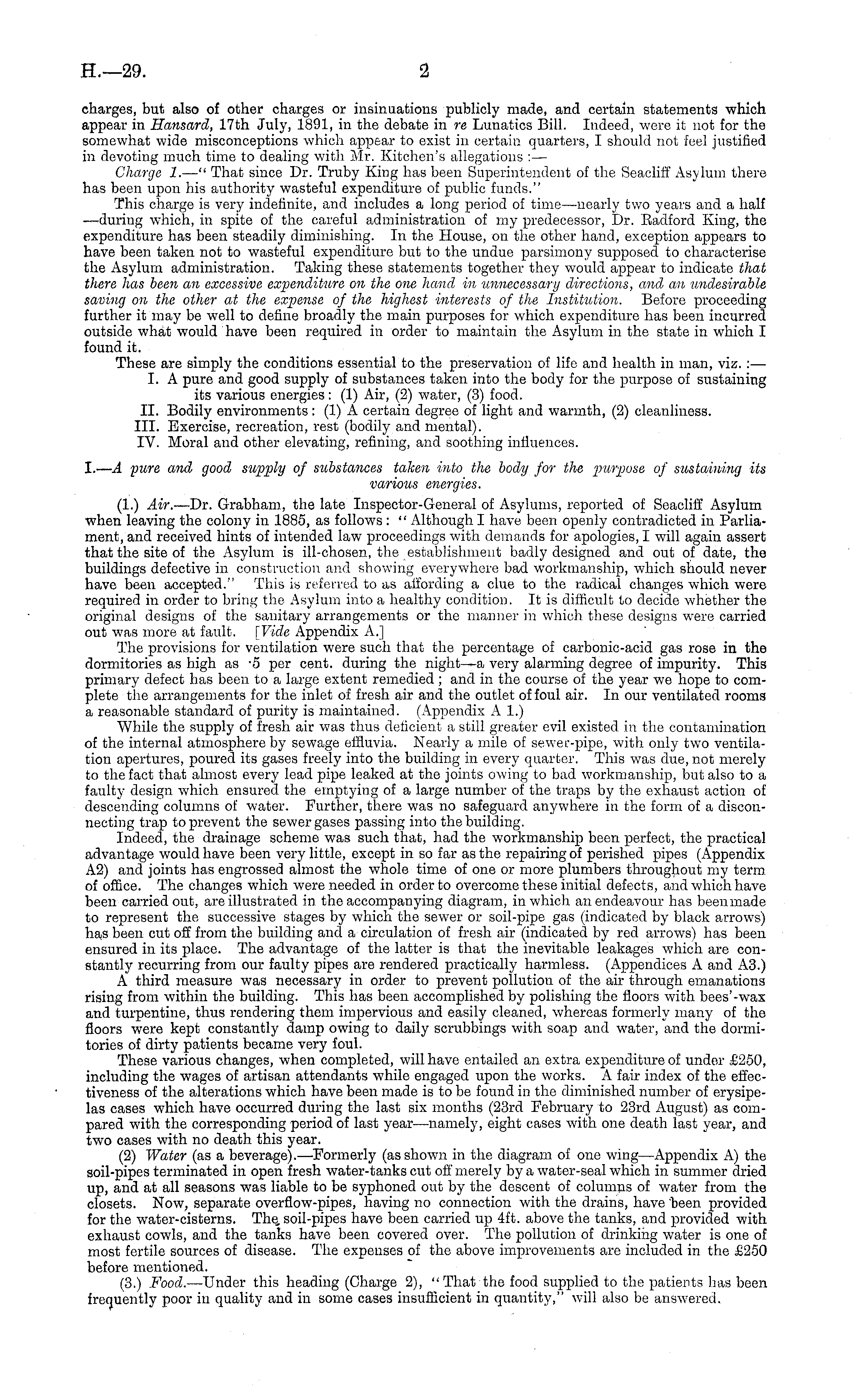 charges, but also of other charges or insinuations publicly made, and certain statements which appear in Hansard, 17th July, 1891, in the debate in re Lunatics Bill. Indeed, were it not for the somewhat wide misconceptions which appear to exist in certain quarters, I should not feel justified in devoting much time to dealing with Mr. Kitchen's allegations :— Charge I. —" That since Dr. Truby King has been Superintendent of the Seacliff Asylum there has been upon his authority wasteful expenditure of public funds." This charge is very indefinite, and includes a long period of time—nearly two years and a half —during which, in spite of the careful administration of my predecessor, Dr. Eadford King, the expenditure has been steadily diminishing. In the House, on the other hand, exception appears to have been taken not to wasteful expenditure but to the undue parsimony supposed to characterise the Asylum administration. Taking these statements together they would appear to indicate that there has been an excessive expenditure on the one hand in unnecessary directions, and an undesirable saving on the other at the expense of the highest interests of the Institution. Before proceeding further it may be well to define broadly the main purposes for which expenditure has been incurred outside what would have been required in order to maintain the Asylum in the state in which I found it. These are simply the conditions essential to the preservation of life and health in man, viz.:— I. A pure and good supply of substances taken into the body for the purpose of sustaining its various energies: (1) Air, (2) water, (3) food. 11. Bodily environments: (1) A certain degree of light and warmth, (2) cleanliness. 111. Exercise, recreation, rest (bodily and mental). IV. Moral and other elevating, refining, and soothing influences. I.— A pure and good supply of substances taken into the body for the purpose of sustaining its various energies. (1.) Air. —Dr. Grabham, the late Inspector-General of Asylums, reported of Seacliff Asylum when leaving the colony in 1885, as follows : " Although I have been openly contradicted in Parliament, and received hints of intended law proceedings with demands for apologies, I will again assert that the site of the Asylum is ill-chosen, the establishment badly designed and out of date, the buildings defective in construction and showing everywhere bad workmanship, which should never have been accepted." This is referred to as affording a clue to the radical changes which were required in order to bring the Asylum into a healthy condition. It is difficult to decide whether the original designs of the sanitary arrangements or the manner in which these designs were carried out was more at fault. [Vide Appendix A.] The provisions for ventilation were such that the percentage of carbonic-acid gas rose in the dormitories as high as -5 per cent, during the night—a very alarming degree of impurity. This primary defect has been to a large extent remedied ; and in the course of the year we hope to complete the arrangements for the inlet of fresh air and the outlet of foul air. In our ventilated rooms a reasonable standard of purity is maintained. (Appendix A 1.) While the supply of fresh air was thus deficient a still greater evil existed in the contamination of the internal atmosphere by sewage effluvia. Nearly a mile of sewer-pipe, with only two ventilation apertures, poured its gases freely into the building in every quarter. This was due, not merely to the fact that almost every lead pipe leaked at the joints owing to bad workmanship, but also to a faulty design which ensured the emptying of a large number of the traps by the exhaust action of descending columns of water. Further, there was no safeguard anywhere in the form of a disconnecting trap to prevent the sewer gases passing into the building. Indeed, the drainage scheme was such that, had the workmanship been perfect, the practical advantage would have been very little, except in so far as the repairing of perished pipes (Appendix A 2) and joints has engrossed almost the whole time of one or more plumbers throughout my term of office. The changes which were needed in order to overcome these initial defects, and which have been carried out, are illustrated in the accompanying diagram, in which an endeavour has beenmade to represent the successive stages by which the sewer or soil-pipe gas (indicated by black arrows) ha,s been cut off from the building and a circulation of fresh air (indicated by red arrows) has been ensured in its place. The advantage of the latter is that the inevitable leakages which are constantly recurring from our faulty pipes are rendered practically harmless. (Appendices A and A3.) A third measure was necessary in order to prevent pollution of the air through emanations rising from within the building. This has been accomplished by polishing the floors with bees-wax and turpentine, thus rendering them impervious and easily cleaned, whereas formerly many of the floors were kept constantly damp owing to daily scrubbings with soap and water, and the dormitories of dirty patients became very foul. These various changes, when completed, will have entailed an extra expenditure of under £250, including the wages of artisan attendants while engaged upon the works. A fair index of the effectiveness of the alterations which have been made is to be found in the diminished number of erysipelas cases which have occurred during the last six months (23rd February to 23rd August) as compared with the corresponding period of last year—namely, eight cases with one death last year, and two cases with no death this year. (2) Water (as a beverage). —-Formerly (as shown in the diagram of one wing—Appendix A) the soil-pipes terminated in open fresh water-tanks cut off merely by a water-seal which in summer dried up, and at all seasons was liable to be syphoned out by the descent of columns of water fro