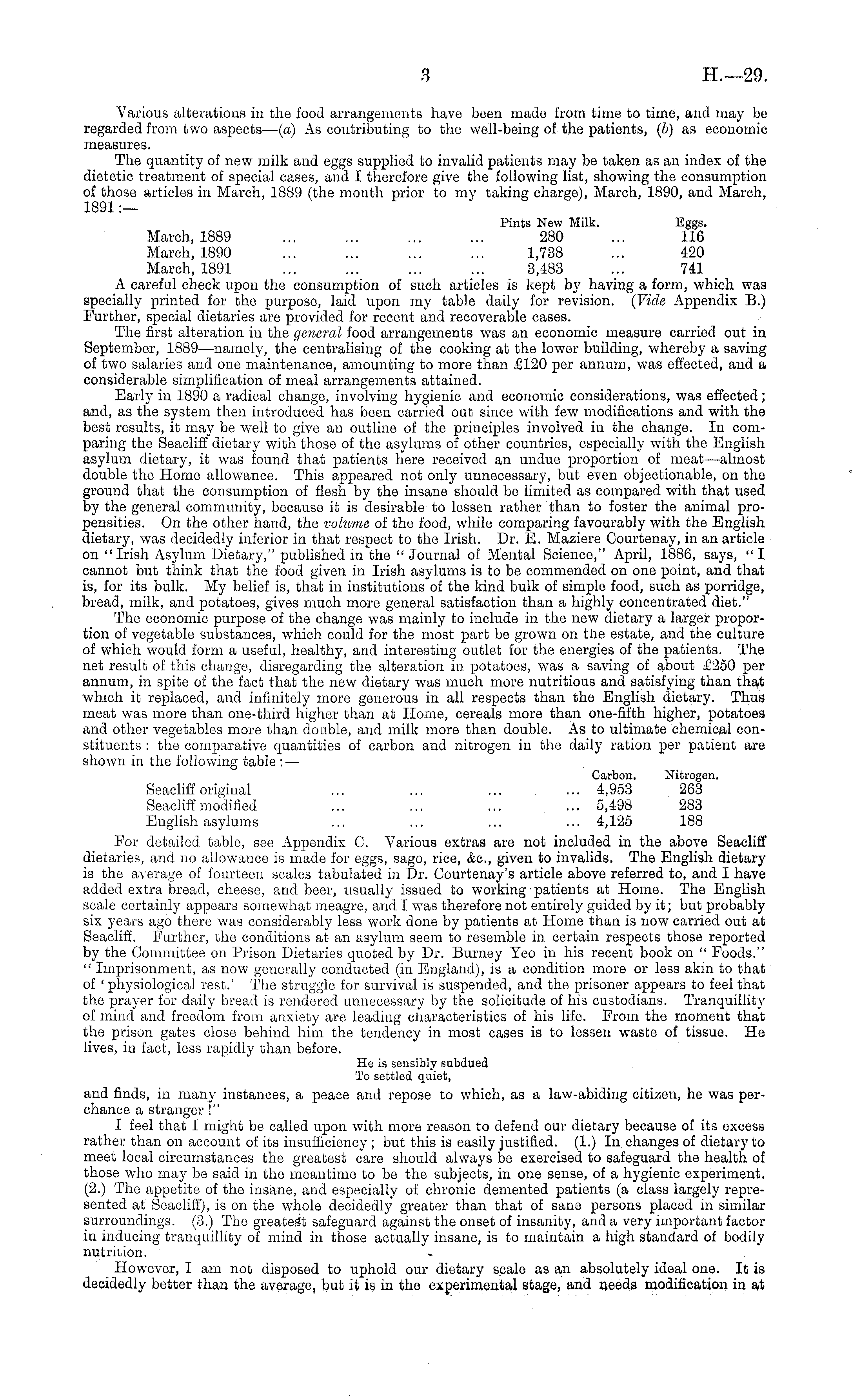 Various alterations in the food arrangements have been made from time to time, and may be regarded from two aspects— (a) As contributing to the well-being of the patients, (b) as economic measures. The quantity of new milk and eggs supplied to invalid patients may be taken as an index of the dietetic treatment of special cases, and I therefore give the following list, showing the consumption of those articles in March, 1889 (the month prior to my taking charge), March, 1890, and March, 1891 :— Pints New Milk. Eggs, March, 1889 ... ... ... ... 280 ... 116 March, 1890 ... ... ... ... 1,738 ... 420 March, 1891 ... ... ... ... 3,483 ... 741 A careful check upon the consumption of such articles is kept by having a form, which was specially printed for the purpose, laid upon my table daily for revision. (Vide Appendix B.) Further, special dietaries are provided for recent and recoverable cases. The first alteration in the general food arrangements was an economic measure carried out in September, 1889—namely, the centralising of the cooking at the lower building, whereby a saving of two salaries and one maintenance, amounting to more than £120 per annum, was effected, and a considerable simplification of meal arrangements attained. Early in 1890 a radical change, involving hygienic and economic considerations, was effected; and, as the system then introduced has been carried out since with few modifications and with the best results, it may be well to give an outline of the principles involved in the change. In comparing the Seacliff dietary with those of the asylums of other countries, especially with the English asylum dietary, it was found that patients here received an undue proportion of meat—almost double the Home allowance. This appeared not only unnecessary, but even objectionable, on the ground that the consumption of flesh by the insane should be limited as compared with that used by the general community, because it is desirable to lessen rather than to foster the animal propensities. On the other hand, the volume of the food, while comparing favourably with the English dietary, was decidedly inferior in that respect to the Irish. Dr. E. Maziere Courtenay, in an article on "Irish Asylum Dietary," published in the " Journal of Mental Science," April, 1886, says, "I cannot but think that the food given in Irish asylums is to be commended on one point, and that is, for its bulk. My belief is, that in institutions of the kind bulk of simple food, such as porridge, bread, milk, and potatoes, gives much more general satisfaction than a highly concentrated diet." The economic purpose of the change was mainly to include in the new dietary a larger proportion of vegetable substances, which could for the most part be grown on the estate, and the culture of which would form a useful, healthy, and interesting outlet for the energies of the patients. The net result of this change, disregarding the alteration in potatoes, was a saving of about £250 per annum, in spite of the fact that the new dietary was much more nutritious and satisfying than that which it replaced, and infinitely more generous in all respects than the English dietary. Thus meat was more than one-third higher than at Home, cereals more than one-fifth higher, potatoes and other vegetables more than double, and milk more than double. As to ultimate chemical constituents : the comparative quantities of carbon and nitrogen in the, daily ration per patient are mw rn in the following table : — Carbon. Nitrogen. Seacliff original ... ... ... ... 4,953 263 Seacliff modified ... ... ... ... 5,498 283 English asylums ... ... ... ... 4,125 188 For detailed table, see Appendix C. Various extras are not included in the above Seacliff dietaries, and no allowance is made for eggs, sago, rice, &c, given to invalids. The English dietary is the average of fourteen scales tabulated in Dr. Courtenay's article above referred to, and I have added extra bread, cheese, and beer, usually issued to working patients at Home. The English scale certainly appears somewhat meagre, and I was therefore not entirely guided by it; but probably six years ago there was considerably less work done by patients at Home than is now carried out at Seacliff. Further, the conditions at an asylum seem to resemble in certain respects those reported by the Committee on Prison Dietaries quoted by Dr. Burney Yeo in his recent book on " Foods." " Imprisonment, as now generally conducted (in England), is a condition more or less akm to that of ' physiological rest.' The struggle for survival is suspended, and the prisoner appears to feel that the prayer for daily bread is rendered unnecessary by the solicitude of his custodians. Tranquillity of mind and freedom from anxiety are leading characteristics of his life. From the moment that the prison gates close behind him the tendency in most cases is to lessen waste of tissue. He lives, in fact, less rapidly than before. He is sensibly subdued To settled quiet, and finds, in many instances, a peace and repose to which, as a law-abiding citizen, he was perchance a stranger !" I feel that I might be called upon with more reason to defend our dietary because of its excess rather than on account of its insufficiency; but this is easily justified. (1.) In changes of dietary to meet local circumstances the greatest care should always be exercised to safeguard the health of those who may be said in the meantime to be the subjects, in one sense, of a hygienic experiment. (2.) The appetite of the insane, and especially of chronic demented patients (a class largely represented at Seacliff), is on the whole decidedly greater than that of sane persons placed in similar surroundings. (3.) The greatest safeguard against the onset of insanity, and a very important factor in inducing tranquillity of mind in those actually insane, is to maintain a high standard of bodily nutrition. " However, I am not disposed to uphold our dietary sca