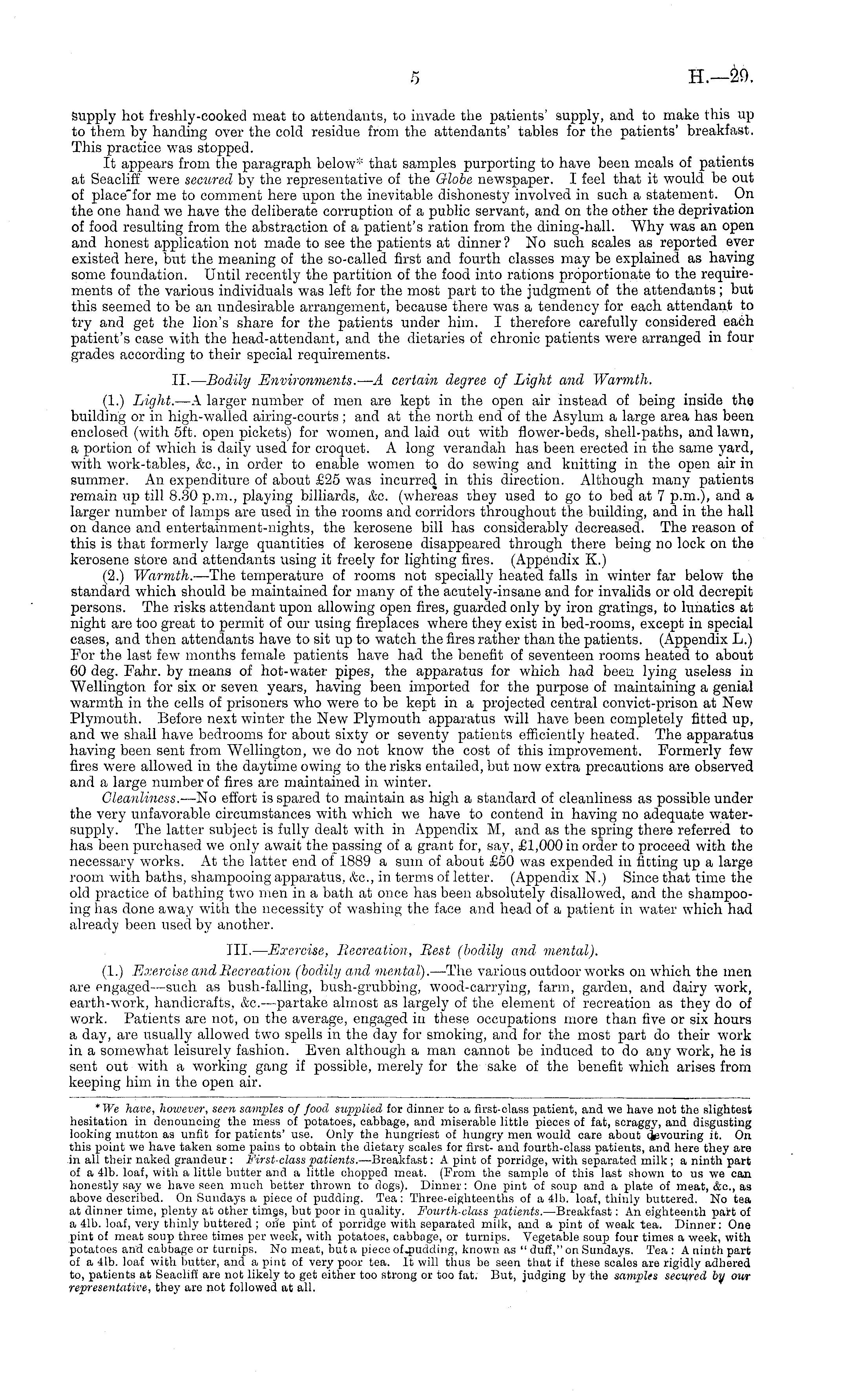 supply hot freshly-cooked meat to attendants, to invade the patients' supply, and to make this up to them by handing over the cold residue from the attendants' tables for the patients' breakfast. This practice was stopped. It appears from the paragraph below* that samples purporting to have been meals of patients at Seacliff were secured by the representative of the Globe newspaper. I feel that it would be out of place'for me to comment here upon the inevitable dishonesty involved in such a statement. On the one hand we have the deliberate corruption of a public servant, and on the other the deprivation of food resulting from the abstraction of a patient's ration from the dining-hall. Why was an open and honest application not made to see the patients at dinner? No such scales as reported ever existed here, but the meaning of the so-called first and fourth classes may be explained as having some foundation. Until recently the partition of the food into rations proportionate to the requirements of the various individuals was left for the most part to the judgment of the attendants ; but this seemed to be an undesirable arrangement, because there was a tendency for each attendant to try and get the lion's share for the patients under him. I therefore carefully considered each patient's case with the head-attendant, and the dietaries of chronic patients were arranged in four grades according to their special requirements. II. — Bodily Environments. — A certain degree of Light and Warmth. (1.) Light. —A larger number of men are kept in the open air instead of being inside the building or in high-walled airing-courts ; and at the north end of the Asylum a large area has been enclosed (with sft. open pickets) for women, and laid out with flower-beds, shell-paths, and lawn, a portion of which is daily used for croquet. A long verandah has been, erected in the same yard, with work-tables, &c, in order to enable women to do sewing and knitting in the open air in summer. An expenditure of about £25 was incurred in this direction. Although many patients remain up till 8.30 p.m., playing billiards, &o. (whereas they used to go to bed at 7 p.m.), and a larger number of lamps are used in the rooms and corridors throughout the building, and in the hall on dance and entertainment-nights, the kerosene bill has considerably decreased. The reason of this is that formerly large quantities of kerosene disappeared through there being no lock on the kerosene store and attendants using it freely for lighting fires. (Appendix X.) (2.) Warmth. —The temperature of rooms not specially heated falls in winter far below the standard which should be maintained for many of the acutely-insane and for invalids or old decrepit persons. The risks attendant upon allowing open fires, guarded only by iron gratings, to lunatics at night are too great to permit of our using fireplaces where they exist in bed-rooms, except in special cases, and then attendants have to sit up to watch the fires rather than the patients. (Appendix L.) For the last few months female patients have had the benefit of seventeen rooms heated to about 60 deg. Fahr. by means of hot-water pipes, the apparatus for which had been lying useless in Wellington for six or seven years, having been imported for the purpose of maintaining a genial warmth in the cells of prisoners who were to be kept in a projected central convict-prison at New Plymouth. Before next winter the New Plymouth apparatus will have been completely fitted up, and we shall have bedrooms for about sixty or seventy patients efficiently heated. The apparatus having been sent from Wellington, we do not know the cost of this improvement. Formerly few fires were allowed in the daytime owing to the risks entailed, but now extra precautions are observed and a large number of fires are maintained in winter. Cleanliness. —No effort is spared to maintain as high a standard of cleanliness as possible under the very unfavorable circumstances with which we have to contend in having no adequate watersupply. The latter subject is fully dealt with in Appendix M, and as the spring there referred to has been purchased we only await the passing of a grant for, say, £1,000 in order to proceed with the necessary works. At the latter end of 1889 a sum of about £50 was expended in fitting up a large room with baths, shampooing apparatus, &0., in terms of letter. (Appendix N.) Since that time the old practice of bathing two men in a bath at once has been absolutely disallowed, and the shampooing lias done away with the necessity of washing the face and head of a patient in water which had already been used by another. 111. — Exercise, Recreation, Best (bodily and mental). (1.) Exercise and Recreation (bodily and mental). —The various outdoor works on which the men are engaged—such as bush-falling, bush-grubbing, wood-carrying, farm, garden, and dairy work, earth-work, handicrafts, &o. —partake almost as largely of the element of recreation as they do of work. Patients are not, on the average, engaged in these occupations more than five or six hours a day, are usually allowed two spells in the day for smoking, and for the most part do their work in a somewhat leisurely fashion. Even although a man cannot be induced to do any work, he is sent out with a working gang if possible, merely for the sake of the benefit which arises from keeping him in the open air.
