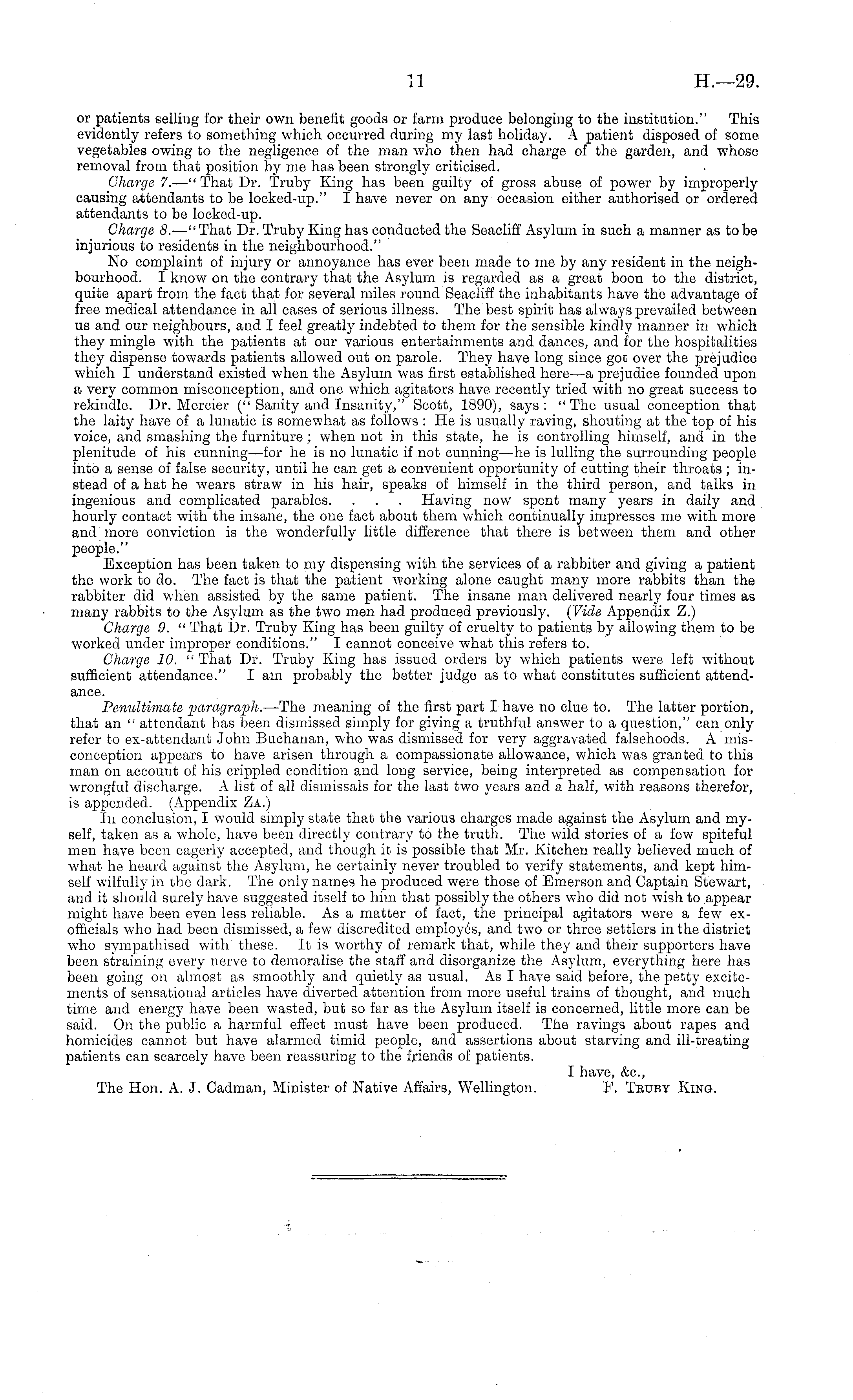 or patients selling for their own benefit goods or farm produce belonging to the institution." This evidently refers to something which occurred during my last holiday. A patient disposed of somo vegetables owing to the negligence of the man who then had charge of the garden, and whose removal from that position by me has been strongly criticised. Charge 7. —" That Dr. Truby King has been guilty of gross abuse of power by improperly causing attendants to be locked-up." I have never on any occasion either authorised or ordered attendants to be locked-up. Charge 8. —"That Dr. Truby King has conducted the Seacliff Asylum in such a manner as to be injurious to residents in the neighbourhood." No complaint of injury or annoyance has ever been made to me by any resident in the neighbourhood. I know on the contrary that the Asylum is regarded as a great boon to the district, quite apart from the fact that for several miles round Seacliff the inhabitants have the advantage of free medical attendance in all cases of serious illness. The best spirit has always prevailed between us and our neighbours, and I feel greatly indebted to them for the sensible kindly manner in which they mingle with the patients at our various entertainments and dances, and for the hospitalities they dispense towards patients allowed out on parole. They have long since goc over the prejudice which I understand existed when the Asylum was first established here—a prejudice founded upon a very common misconception, and one which agitators have recently tried with no great success to rekindle. Dr. Mercier (" Sanity and Insanity," Scott, 1890), says: "The usual conception that the laity have of a lunatic is somewhat as follows : He is usually raving, shouting at the top of his voice, and smashing the furniture ; when not in this state, he is controlling himself, and in the plenitude of his cunning—for he is no lunatic if not cunning—he is lulling the surrounding people into a sense of false security, until he can get a convenient opportunity of cutting their throats ; instead of a hat he wears straw in his hair, speaks of himself in the third person, and talks in ingenious and complicated parables. . . . Having now spent many years in daily and hourly contact with the insane, the one fact about them which continually impresses me with more and more conviction is the wonderfully little difference that there is between them and other people." Exception has been taken to my dispensing with the services of a rabbiter and giving a patient the work to do. The fact is that the patient working alone caught many more rabbits than the rabbiter did when assisted by the same patient. The insane man delivered nearly four times as many rabbits to the Asylum as the two men had produced previously. (Vide Appendix Z.) Charge 9. " That Dr. Truby King has been guilty of cruelty to patients by allowing them to be worked under improper conditions." I cannot conceive what this refers to. Charge 10. " That Dr. Truby King has issued orders by which patients were left without sufficient attendance." lam probably the better judge as to what constitutes sufficient attendance. Penultimate paragraph. —The meaning of the first part I have no clue to. The latter portion, that an " attendant has been dismissed simply for giving a truthful answer to a question," can only refer to ex-attendant John Buchanan, who was dismissed for very aggravated falsehoods. A misconception appears to have arisen through a compassionate allowance, which was granted to this man on account of his crippled condition and long service, being interpreted as compensation for wrongful discharge. A list of all dismissals for the last two years and a half, with reasons therefor, is appended. (Appendix Za.) In conclusion, I would simply state that the various charges made against the Asylum and myself, taken as a whole, have been directly contrary to the truth. The wild stories of a few spiteful men have been eagerly accepted, and though it is possible that Mr. Kitchen really believed much of what he heard against the Asylum, he certainly never troubled to verify statements, and kept himself wilfully in the dark. The only names he produced were those of Emerson and Captain Stewart, and it should surely have suggested itself to him that possibly the others who did not wish to appear might have been even less reliable. As a matter of fact, the principal agitators were a few exofficials who had been dismissed, a few discredited employes, and two or three settlers in the district who sympathised with these. It is worthy of remark that, while they and their supporters have been straining every nerve to demoralise the staff and disorganize the Asylum, everything here has been going on almost as smoothly and quietly as usual. As I have said before, the petty excitements of sensational articles have diverted attention from more useful trains of thought, and much time and energy have been wasted, but so far as the Asylum itself is concerned, little more can be said. On the public a harmful effect must have been produced. The ravings about rapes and homicides cannot but have alarmed timid people, and assertions about starving and ill-treating patients can scarcely have been reassuring to the friends of patients. I have, &c, The Hon. A. .1. Cadman, Minister of Native Affairs, Wellington. F. Truby King.