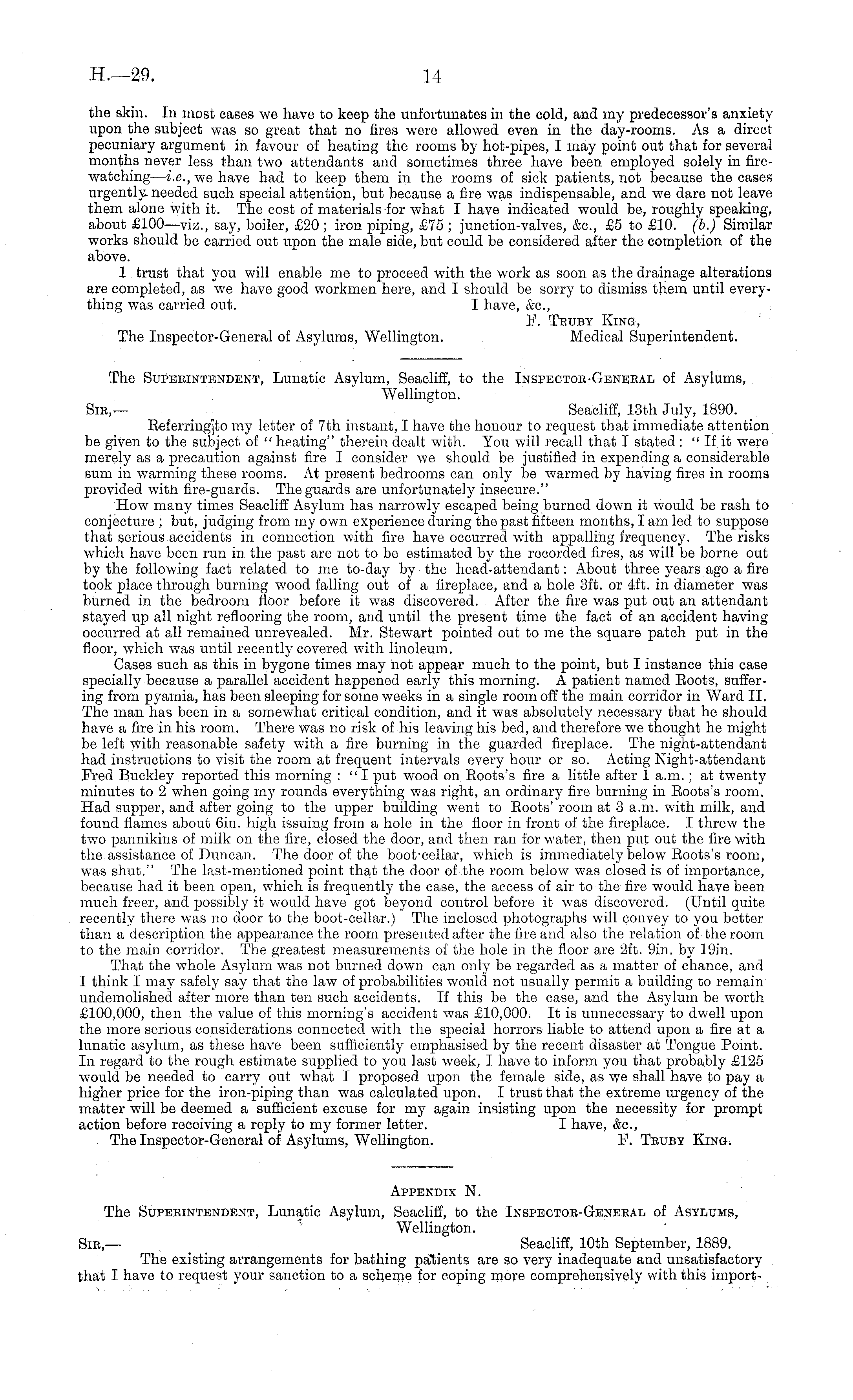 The Supeeintendent, Lunatic Asylum, Seacliff, to the Inspectob-Genebal of Asylums, Wellington. Sib,— Seacliff, 13th July, 1890. Eeferringjto my letter of 7th instant, I have the honour to request that immediate attention be given to the subject of " heating" therein dealt with. You will recall that I stated: "If it were merely as a precaution against fire I consider we should be justified in expending a considerable sum in warming these rooms. At present bedrooms can only be warmed by having fires in rooms provided with fire-guards. The guards are unfortunately insecure." How many times Seacliff Asylum has narrowly escaped being burned down it would be rash to conjecture ; but, judging from my own experience during the past fifteen months, lam led to suppose that serious accidents in connection with fire have occurred with appalling frequency. The risks which have been run in the past are not to be estimated by the recorded fires, as will be borne out by the following fact related to me to-day by the head-attendant: About three years ago a fire took place through burning wood falling out of a fireplace, and a hole 3ft. or 4ft. in diameter was burned in the bedroom floor before it was discovered. After the fire was put out an attendant stayed up all night reflooring the room, and until the present time the fact of an accident having occurred at all remained unrevealed. Mr. Stewart pointed out to me the square patch put in the floor, which was until recently covered with linoleum. Cases such as this in bygone times may not appear much to the point, but I instance this case specially because a parallel accident happened early this morning. A patient named Eoots, suffering from pyamia, has been sleeping for some weeks in a single room off the main corridor in Ward 11. The man has been in a somewhat critical condition, and it was absolutely necessary that he should have a fire in his room. There was no risk of his leaving his bed, and therefore we thought he might be left with reasonable safety with a fire burning in the guarded fireplace. The night-attendant had instructions to visit the room at frequent intervals every hour or so. Acting Night-attendant Fred Buckley reported this morning :"I put wood on Boots's fire a little after 1 a.m.; at twenty minutes to 2 when going my rounds everything was right, an ordinary fire burning in Eoots's room. Had supper, and after going to the upper building went to Eoots' room at 3 a.m. with milk, and found flames about 6in. high issuing from a hole in the floor in front of the fireplace. I threw the two pannikins of milk on the fire, closed the door, and then ran for water, then put out the fire with the assistance of Duncan. The door of the boot'cellar, which is immediately below Eoots's room, was shut." The last-mentioned point that the door of the room below was closed is of importance, because had it been open, which is frequently the case, the access of air to the fire would have been much freer, and possibly it would have got beyond control before it was discovered. (Until quite recently there was no door to the boot-cellar.) The inclosed photographs will convey to you better than a description the appearance the room presented after the fire and also the relation of the room to the main corridor. The greatest measurements of the hole in the floor are 2ft. 9in. by 19in. That the whole Asylum was not burned down can only be regarded as a matter of chance, and I think I may safely say that the law of probabilities would not usually permit a building to remain undemolished after more than ten such accidents. If this be the case, and the Asylum be worth £100,000, then the value of this morning's accident was £10,000. It is unnecessary to dwell upon the more serious considerations connected, with the special horrors liable to attend upon a fire at a lunatic asylum, as these have been sufficiently emphasised by the recent disaster at Tongue Point. In regard to the rough estimate supplied to you last week, I have to inform you that probably £125 would be needed to carry out what I proposed upon the female side, as we shall have to pay a higher price for the iron-piping than was calculated upon. I trust that the extreme urgency of the matter will be deemed a sufficient excuse for my again insisting upon the necessity for prompt action before receiving a reply to my former letter. I have, &c, The Inspector-General of Asylums, Wellington. F. Teuby King.