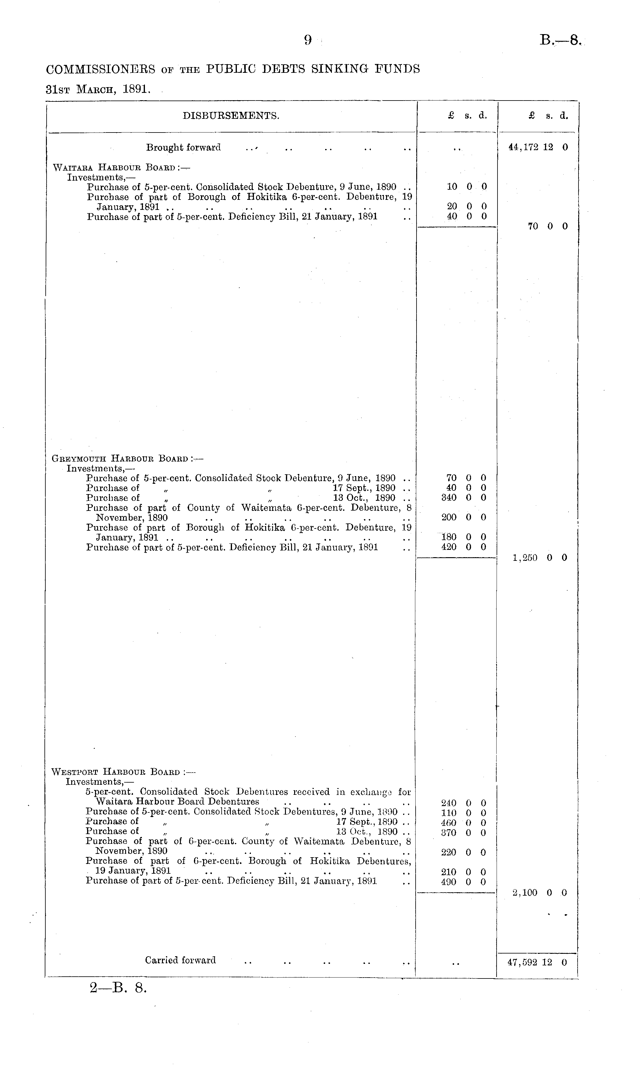 DISBURSEMENTS. £ s. a. £ s. a. Brought forward 44,172 12 0 Waitara Harboub Board :— Investments, — Purchase of 5-per-cent. Consolidated Stock Debenture, 9 June, 1890 .. Purchase of part of Borough of Hokitika 6-por-oent. Debenture, 19 January, 1891 Purchase of part of 5-per-cent. Deficiency Bill, 21 January, 1891 10 0 0 70 0 0 20 0 0 40 0 0 Greymouth Harbour Board :— Investments, — Purchase of 5-per-cent. Consolidated Stock Debenture, 9 June, 1890 .. Purchase of „ „ 17 Sept., 1890 .. Purchase of „ „ 13 Oct., 1890 .. Purchase of part of County of Waitemata 0-per-cent. Debenture, 8 November, 1890 Purchase of part of Borough of Hokitika 0-per-cent. Debenture, 19 January, 1891 Purchase of part of 5-pcr-cent. Deficiency Bill, 21 January, 1891 70 0 0 40 0 0 340 0 0 1,250 0 0 200 0 0 180 0 0 420 0 0 Westfobt Harbour Board :— Investments, — 5-per-cent. Consolidated Stock Debentures received in exchange for Waitara Harbour Board Debentures Purchase of 5-per-cent. Consolidated Stock Debentures, 9 June, 1890 .. Purchase of „ „ 17 Sept., 1890 .. Purchase of „ „ 13 Oct., 1890.. Purchase of part of G-per-cent. County of Waitemata Debenture, 8 November, 1890 Purchase of part of 0-per-cent. Borough of Hokitika Debentures, 19 January, 1891 Purchase of part of 5-per-cent. Deficiency Bill, 21 January, 1891 240 0 0 110 0 0 460 0 0 370 0 0 2,100 0 0 220 0 0 210 0 0 490 0 0 Carried forward 47,592 12 0