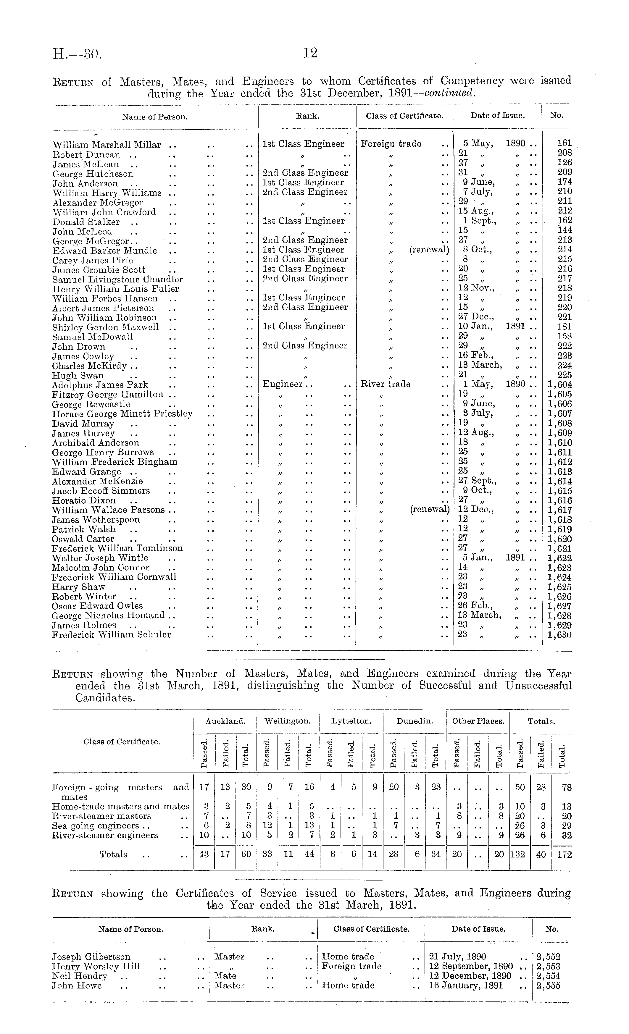 Return of Masters, Mates, and Engineers to whom Certificates of Competency were issued during the Year ended the 31st December, 1891 — continued.