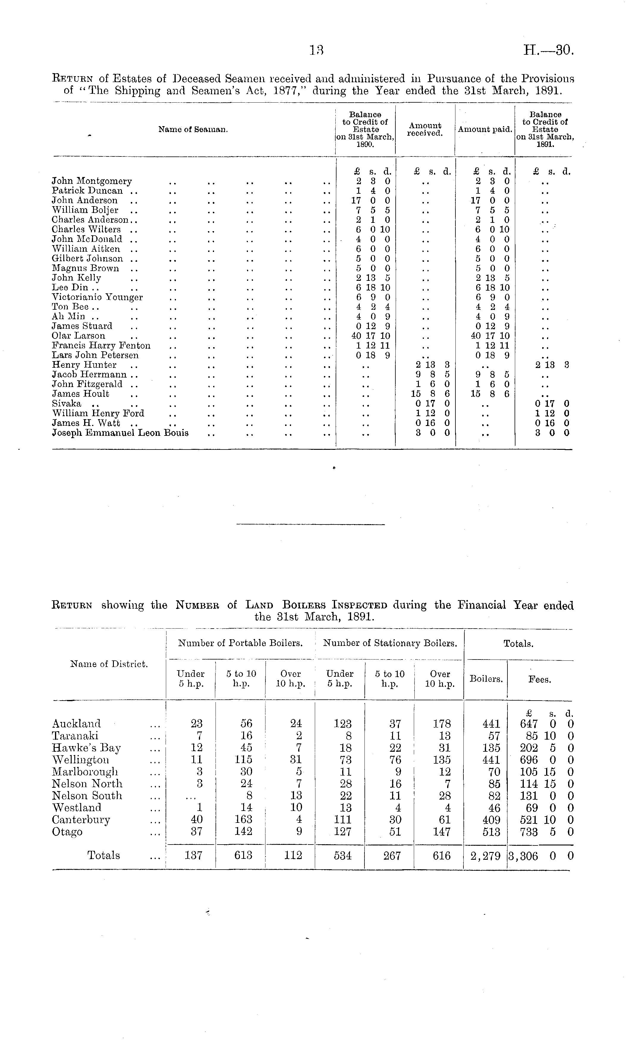 Name of Seaman. Balance to Credit of Estate on 31st March, 1800. Amount received. Amount paid. Balance to Credit of Estate on 31st March, 1891. John Montgomery Patrick Duncan John Anderson William Boljer Charles Anderson Charles Witters John McDonald William Aitken Gilbert Johnson Magnus Brown John Kelly Lee Din .. Victorianio Younger Ton Bee Ah Min James Stuard Olar Larson Francis Harry Fenton Lars John Petersen Henry Hunter Jacob Herrmann John Fitzgerald James Hoult Sivaka William Henry Ford James H. Watt Joseph Emmanuel Leon Bouis £ s. a. 2 3 0 14 0 17 0 0 7 5 5 2 10 6 0 10 4 0 0 6 0 0 5 0 0 5 0 0 2 13 5 6 18 10 6 9 0 4 2 4 4 0 9 0 12 9 40 17 10 1 12 11 0 18 9 £ s. a. £ a. d. 2 3 0 14 0 17 0 0 7 5 5 2 10 6 0 10 4 0 0 6 0 0 5 0 0 5 0 0 2 13 5 6 18 10 6 9 0 4 2 4 4 0 9 0 12 9 40 17 10 1 12 11 0 18 9 £ s. d. 2 13 3 9 8 5 16 0 15 8 6 0 17 0 1 12 0 0 16 0 3 0 0 2 13 3 9 8 5 16 0 15 8 6 0 17 0 1 12 0 0 16 0 3 0 0