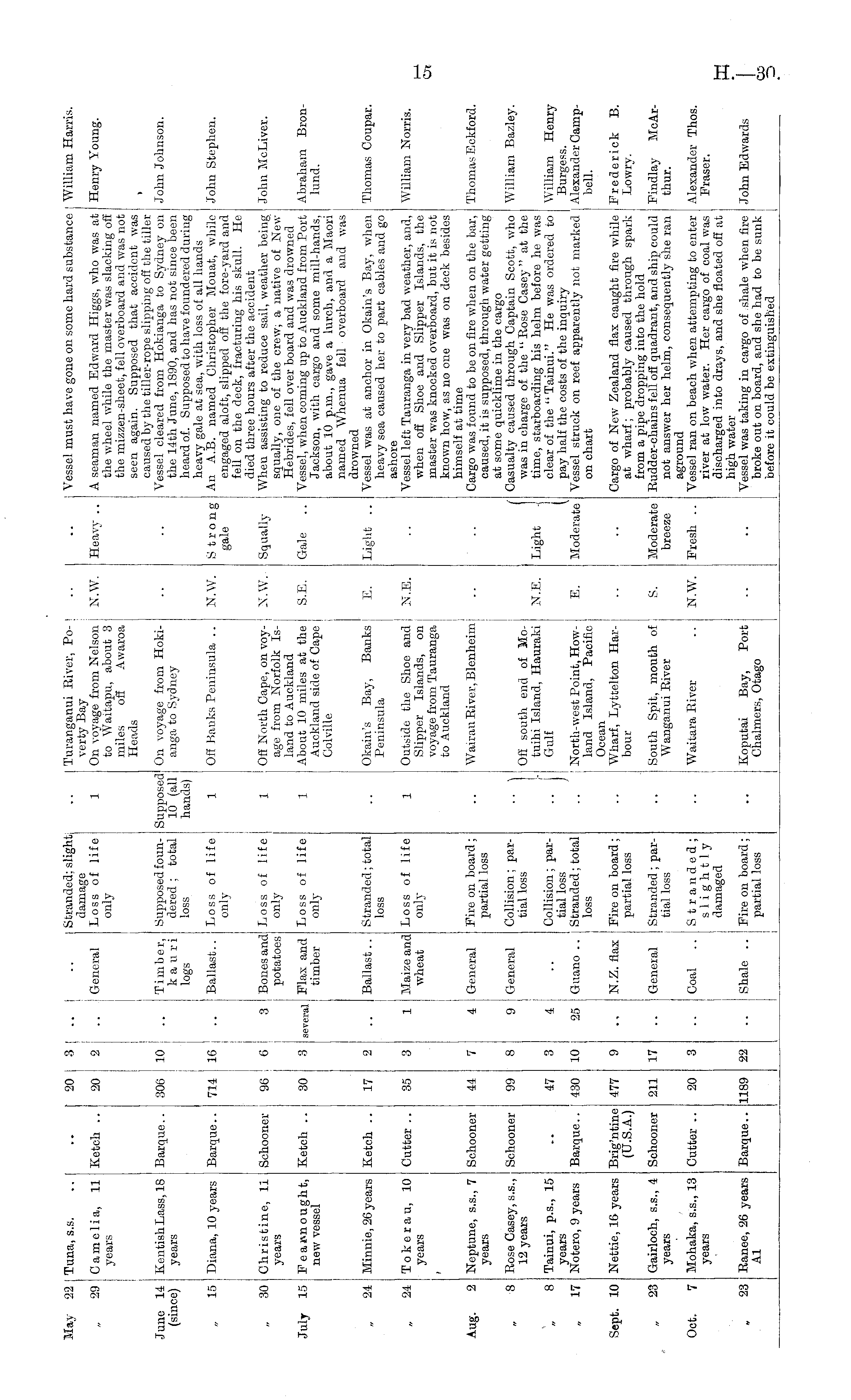 May 22 Tuna, s.s. .. , .. Stranded; slight damage Loss of life only •• Turanganui River, Po- [ verty Bay On voyage from Nelson N.W. to Waitapu, about 3 miles off Awaroa Heads Vessel must have gone on some hard substance William Hams. 29 Camelia, 11 years Ketch .. 20 2 General i N.W. Heavy .. A seaman named Edward Higgs, who was at the wheel while the master was slacking off the mizzen-sheet, fell overboard and was not seen again. Supposed that accident was caused by the tiller-rope slipping off the tiller Vessel cleared from Hokianga to Sydney on the 14th June, 1890, and has not since been heard of. Supposed to have foundered during heavy gale at sea, with loss of all hands An A.B. named Christopher Mouat, while engaged aloft, slipped off the fore-yard and fell on the deck, fracturing his skull. He died three hours after the accident When assisting to reduce sail, weather being squally, one of the crew; a native of New Hebrides, fell over board and was drowned Vessel, when coming up to Auckland from Port Jackson, with cargo and some mill-hands, about 10 p.m., gave a lurch, and a Maori named Whenua fell overboard and was drowned Vessel was at anchor in Okain's Bay, when heavy sea caused her to part cables and go ashore Vessel left Tauranga in very bad weather, and, when off Shoe and Slipper Islands, the master was knocked overboard, but it is not known how, as no one was on deck besides himself at time Cargo was found to be on fire when on the bar, caused, it is supposed, through water getting at some quicklime in the cargo Casualty caused through Captain Scott, who was in charge of the "Rose Casey" at the time, starboarding his helm before he was clear of the "Tainui." He was ordered to pay half the costs of the inquiry Vessel struck on reef apparently not marked on chart Henry Young. June 14 (since) Barque.. Timber, k a u r i logs Supposed 10 (all hands) i Kentish Lass, 18 Supposed foundered ; total loss On voyage from Hokianga to Sydney John Johnson. 306 10 years 15 Diana, 10 years Barque.. 714 16 Ballast.. Loss of life only 1 Off Hanks Peninsula .. N.W. S trong gale John Stephen. 30 Christine, 11 years Schooner 96 3 3 Bones and potatoes Loss of life only 1 Off North Cape, on voy- | N.W. age from Norfolk Is- I land to Auckland About 10 miles at the S.E. Auckland side of Cape \ Colville Squally John McLiver. July 15 F ear.nought, new vessel Ketch .. 30 3 several veral Flax and timber Loss of life only 1 Gale .. Abraham Bronlund. Minnie, 26 years Ketch .. Ballast.. Stranded; total loss Light .. Thomas Coupar. 24 17 Okain's Bay, Banks j E. Peninsula 24 Tokerau, 10 years Cutter .. 35 1 Maize and wheat 1 Loss of life only 1 Outside the Shoe and j N.E. Slipper Islands, on voyage from Tauranga to Auckland William Norris. Neptune, s.s., 7 years Schooner 4 General Fire on board; partial loss Wairau River, Blenheim I Thomas Eckford. Aug. 2 44 7 8 Rose Casey, s.s., 12 years Schooner 99 9 General Collision; partial loss - ) Light J Moderate William Bazley. 8 Tainui, p.s., 15 years Notero, 9 years 47 [ Collision; partial loss Stranded; total loss i Off south end of Motuihi Island, Hauraki N.E. Gulf William Henry Burgess. Alexander Campbell. 3 4 | -) Barque.. 10 I 17 Sept. 10 Nettie, 16 years Brig'ntine (U.S.A.) 430 477 25 j Guano .. [ Fire on board; partial loss North-west Point, How- E. land Island, Pacific Ocean Wharf, Lyttelton Har- i hour Cargo of New Zealand flax caught fire while at wharf; probably caused through spark from a pipe dropping into the hold Rudder-chains fell off quadrant, and ship could not answer her helm, consequently she ran aground Vessel ran on beach when attempting to enter river at low water. Her cargo of coal was discharged into drays, and she floated off at high water Vessel was taking in cargo of shale when fire broke out on board, and she had to be sunk before it could be extinguished Frederick B. Lowry. ., N.Z. flax 23 Gairloeh, s.s., 4 years Schooner 211 17 General Stranded; partial loss South Spit, mouth of j S. Wanganui River i Moderate breeze Findlay McArthur. Oct. 7 Mohaka, s.s., 13 Cutter .. 20 Coal .. Stranded; slightly damaged Waitara River .. N.W. Fresh .. Alexander Thos. Fraser. years . 23 Ranee, 26 years Al Barque.. Fire on board; partial loss Koputai Bay, Port Chalmers, Otago John Edwards 1189 ■22 Shale ..
