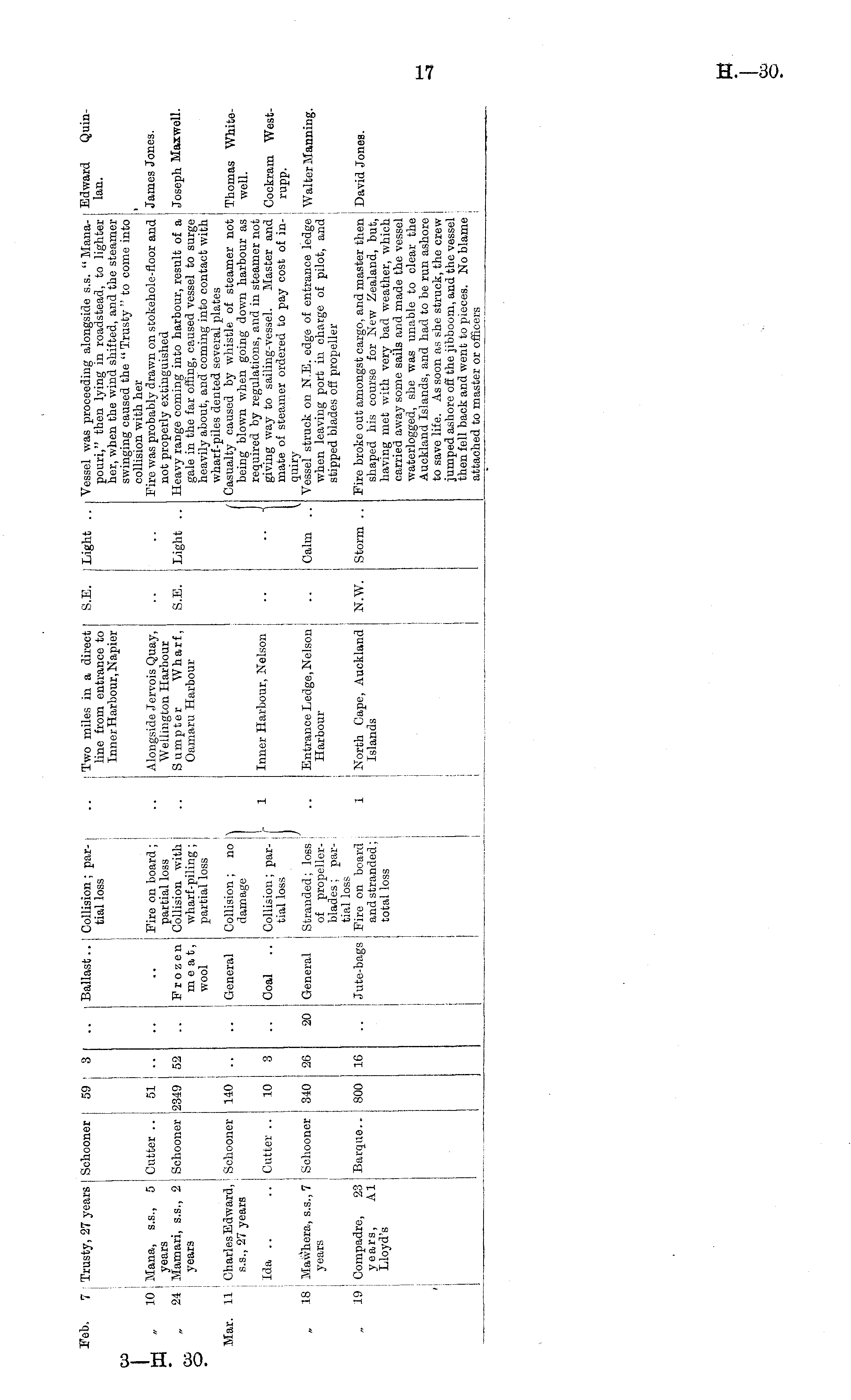 Feb. 7 ; Trusty, 27 years Schooner 59 I Ballast.. Collision; partial loss Two miles in a direct line from entrance to Inner Harbour, Napier S.E. Light .. Vessel was proceeding alongside s.s. " Manapouri," then lying in roadstead, to lighter her, when the wind shifted, and the steamer swinging caused the "Trusty" to come into collision with her Fire was probably drawn on stokehole-floor and not properly extinguished Heavy range coming into harbour, result of a gale in the far offing, caused vessel to surge heavily about, and coming into contact with wharf-piles dented several plates Casualty caused by whistle of steamer not being blown when going down harbour as required by regulations, and in steamer not giving way to sailing-vessel. Master and mate of steamer ordered to pay cost of inquiry Vessel struck on N.E. edge of entrance ledge when leaving port in charge of pilot, and stipped blades off propeller Edward Qumlan. :um"I „ 10 Mana, s.s., 5 years „ 24 Mamari, s.s., 2 years Cutter .. i Schooner 51 2349 52 Frozen meat, wool Fire on board; partial loss Collision with wharf-piling ; partial loss Alongside Jervois Quay, Wellington Harbour Sumpter Wharf, Oamaru Harbour S.E. Light .. James Jones. Joseph Maxwell. Mar. 11 Charles Edward, s.s., 27 years Schooner 140 General Collision; no \ damage Collision; par- f j tial loss 1 "I Thomas Whitewell. Cutter .. 10 .. Coal .. Inner Harbour, Nelson Ida .. Cockram Westrupp. „ 18 i Mawhera, s.s., 7 years Schooner 340 26 20 General Stranded; loss j of propeller- j ; blades; partial loss Fire on board ; and stranded;! total loss 1 Entrance Ledge, Nelson Harbour Calm .. Walter Manning. 19 Compadre, 23 years, Al Lloyd's Barque.. Jute-bags North Cape, Auckland Islands N.W. Storm .. Fire broke out amongst cargo, and master then shaped his course for New Zealand, but, having met with very bad weather, which carried away some sails and made the vessel waterlogged, she was unable to clear the Auckland Islands, and had to be run ashore to save life. As soon as she struck, the crew jumped ashore off the jibboom, and the vessel then fell back and went to pieces. No blame attached to master or officers David Jones. 800 16 I !