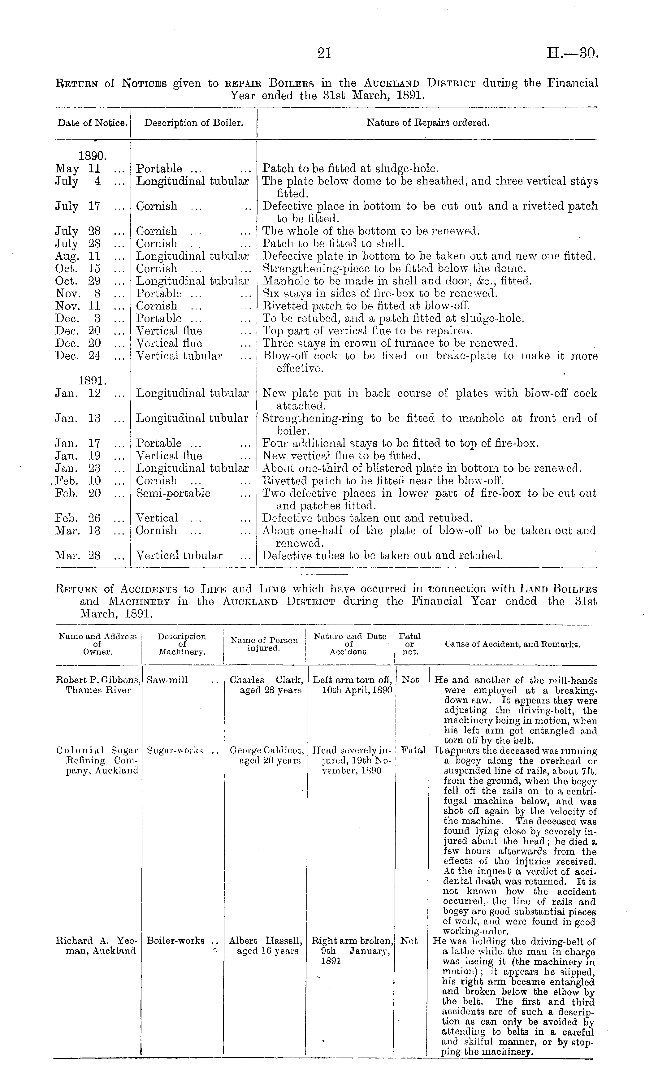 Return of Accidents to Life and Limb which have occurred in connection with Land Boilers and Machinery in the Auckland District during the Financial Year ended the 31st March, 1891.