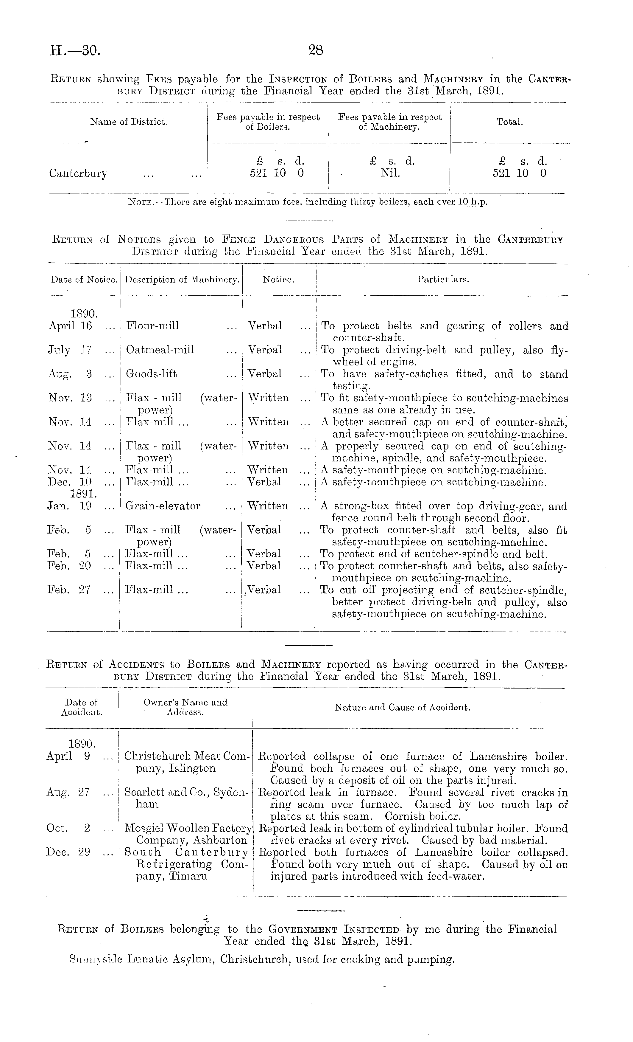 Return of Accidents to Boilers and Machinery reported as having occurred in the Canterbury District during the Financial Year ended the 31st March, 1891.