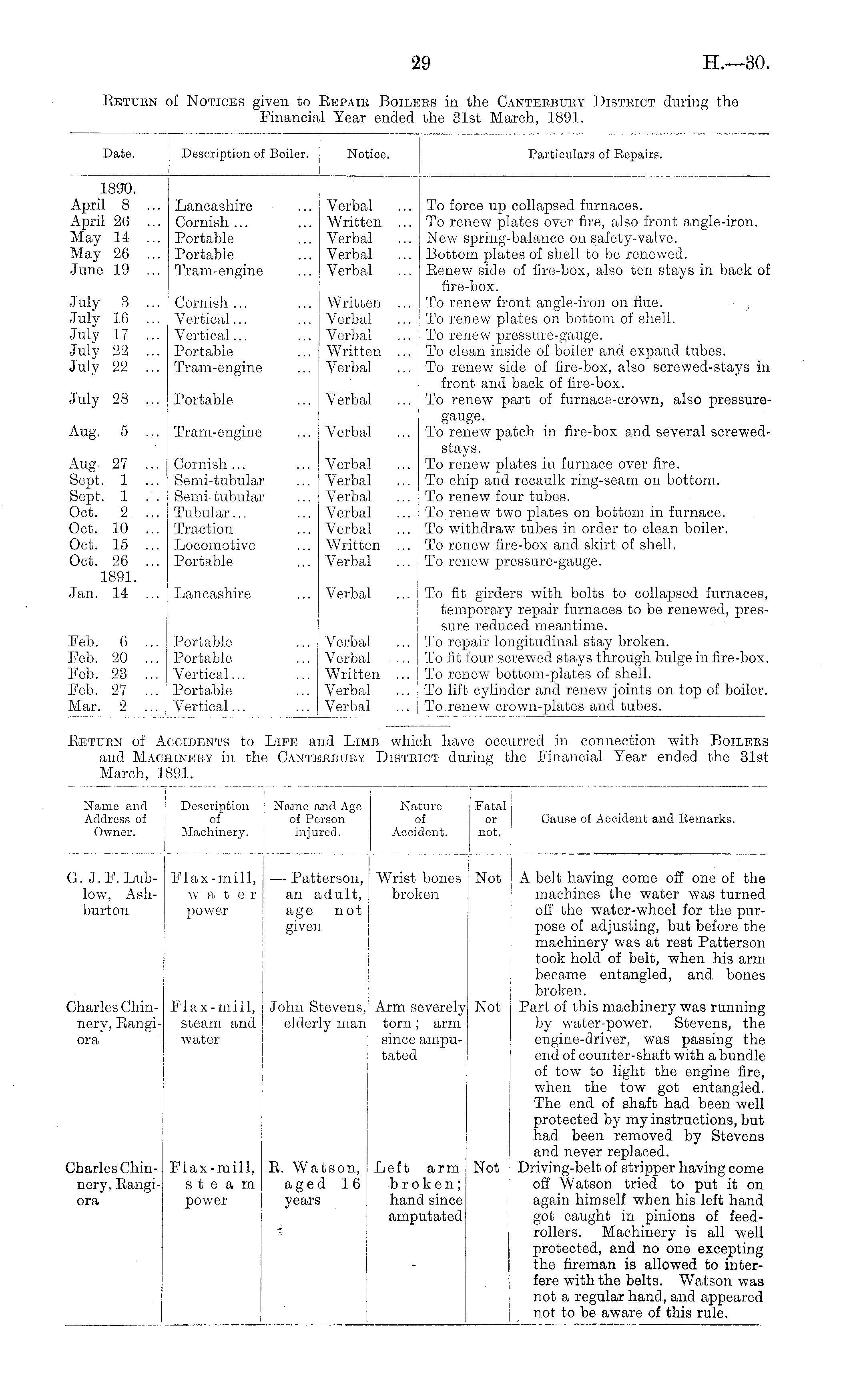 Return of Accidents to Life and Limb which have occurred in connection with Boilers and Machinery in the Canterbury District during the Financial Year ended the 31st March, 1891.