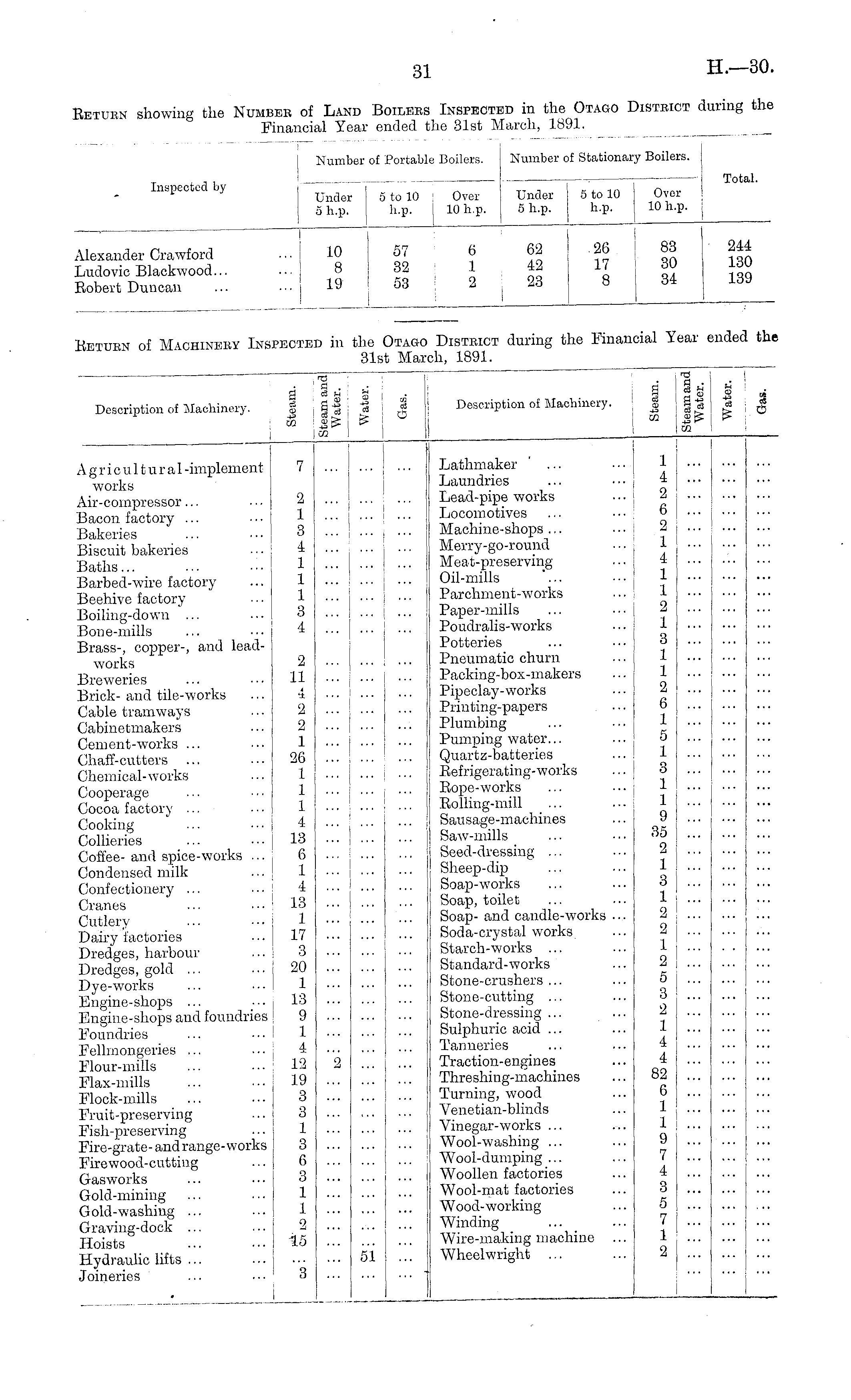 Return of Machinery Inspected in the Otago District during the Financial Year ended the 31st March, 1891.