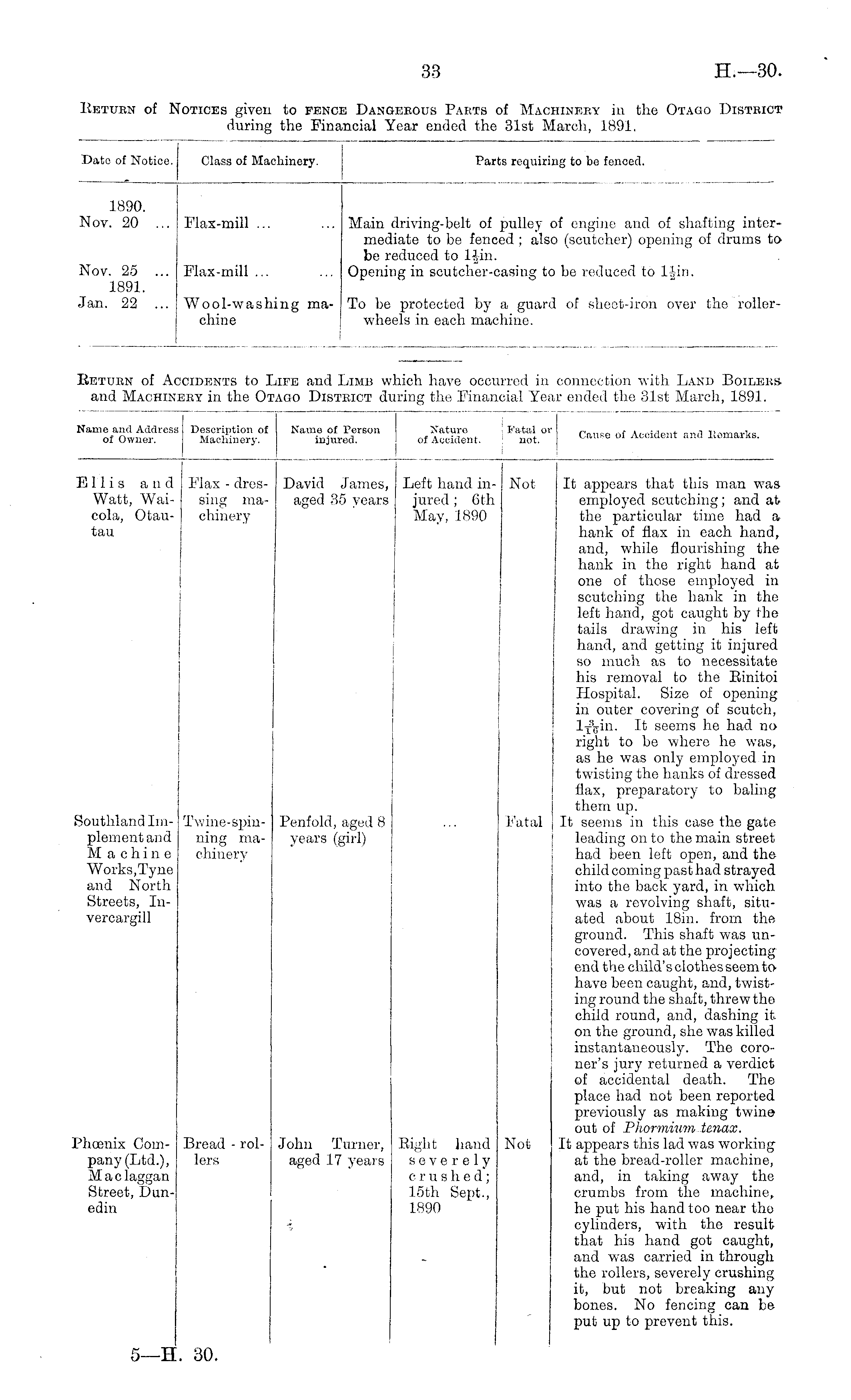 Return of Accidents to Life and Limb which have occurred in connection with Land Boilers. and Machinery in the Otago District during the Financial Year ended the 31st March, 1891.