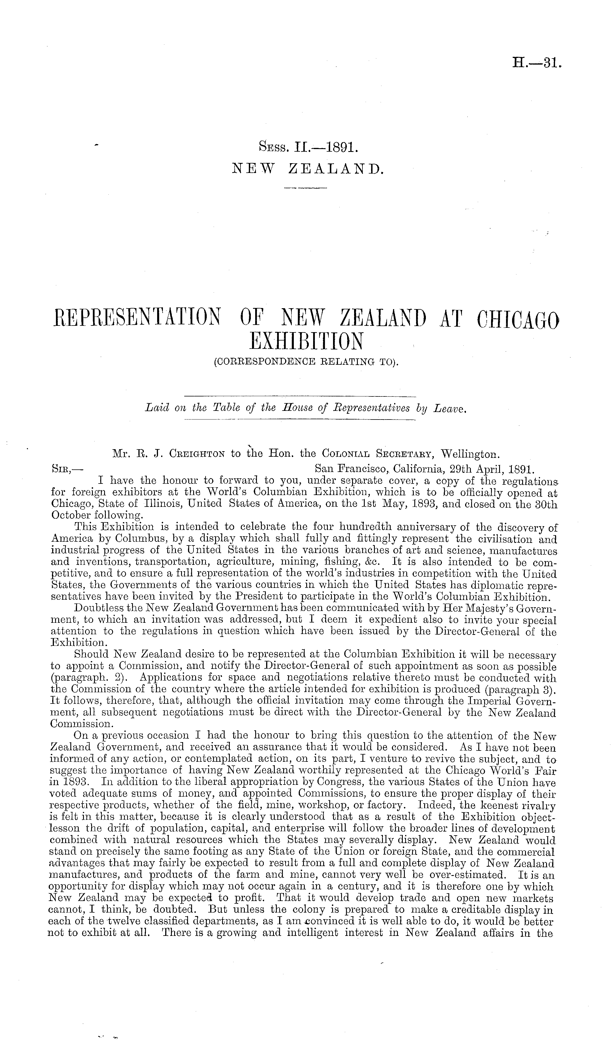 Mr. E. J. Ckeighton to the Hon. the Colonial Sboeetaey, Wellington. Sib, — San Francisco, California, 29th April, 1891. I have the honour to forward to you, under separate cover, a copy of the regulations for foreign exhibitors at the World's Columbian Exhibition, which is to be officially opened at Chicago, State of Illinois, United States of America, on the Ist May, 1893, and closed on the 30th October following. This Exhibition is intended to celebrate the four hundredth anniversary of the discovery of America by Columbus, by a display which shall fully and fittingly represent the civilisation and industrial progress of the United States in the various branches of art and science, manufactures and inventions, transportation, agriculture, mining, fishing, &c. It is also intended to be competitive, and to ensure a full representation of the world's industries in competition with the United States, the Governments of the various countries in which the United States has diplomatic representatives have been invited by the President to participate in the World's Columbian Exhibition. Doubtless the New Zealand Government has been communicated with by Her Majesty's Government, to which an invitation was addressed, but I deem it expedient also to invite your special attention to the regulations in question which have been issued by the Director-General of the Exhibition. Should New Zealand desire to be represented at the Columbian Exhibition it will be necessary to appoint a Commission, and notify the Director-General of such appointment as soon as possible (paragraph. 2). Applications for space and negotiations relative thereto must be conducted with the Commission of the country where the article intended for exhibition is produced (paragraph 3). It follows, therefore, that, although the official invitation may come through the Imperial Government, all subsequent negotiations must be direct with the Director-General by the New Zealand Commission. On a previous occasion I had the honour to bring this question to the attention of the New Zealand Government, and received an assurance that it would be considered. As I have not been informed of any action, or contemplated action, on its part, I venture to revive the subject, and to suggest the importance of having New Zealand worthily represented at the Chicago World's Fair in 1893. In addition to the liberal appropriation by Congress, the various States of the Union have voted adequate sums of money, and appointed Commissions, to ensure the proper display of their respective products, whether of the field, mine, workshop, or factory. Indeed, the keenest rivalry is felt in this matter, because it is clearly understood that as a result of the Exhibition objectlesson the drift of population, capital, and enterprise will follow the broader lines of development combined with natural resources which the States may severally display. New Zealand would stand on precisely the same footing as any State of the Union or foreign State, and the commercial advantages that may fairly be expected to result from a full and complete display of New Zealand manufactures, and products of the farm and mine, cannot very well be over-estimated. It is an opportunity for display which may not occur again in a century, and it is therefore one by which New Zealand may be expected to profit. That it would develop trade and open new markets cannot, I think, be doubted. But unless the colony is prepared to make a creditable display in each of the twelve classified departments, as I am convinced it is well able to do, it would be better not to exhibit at all. There is a growing and intelligent interest in New Zealand affairs in the