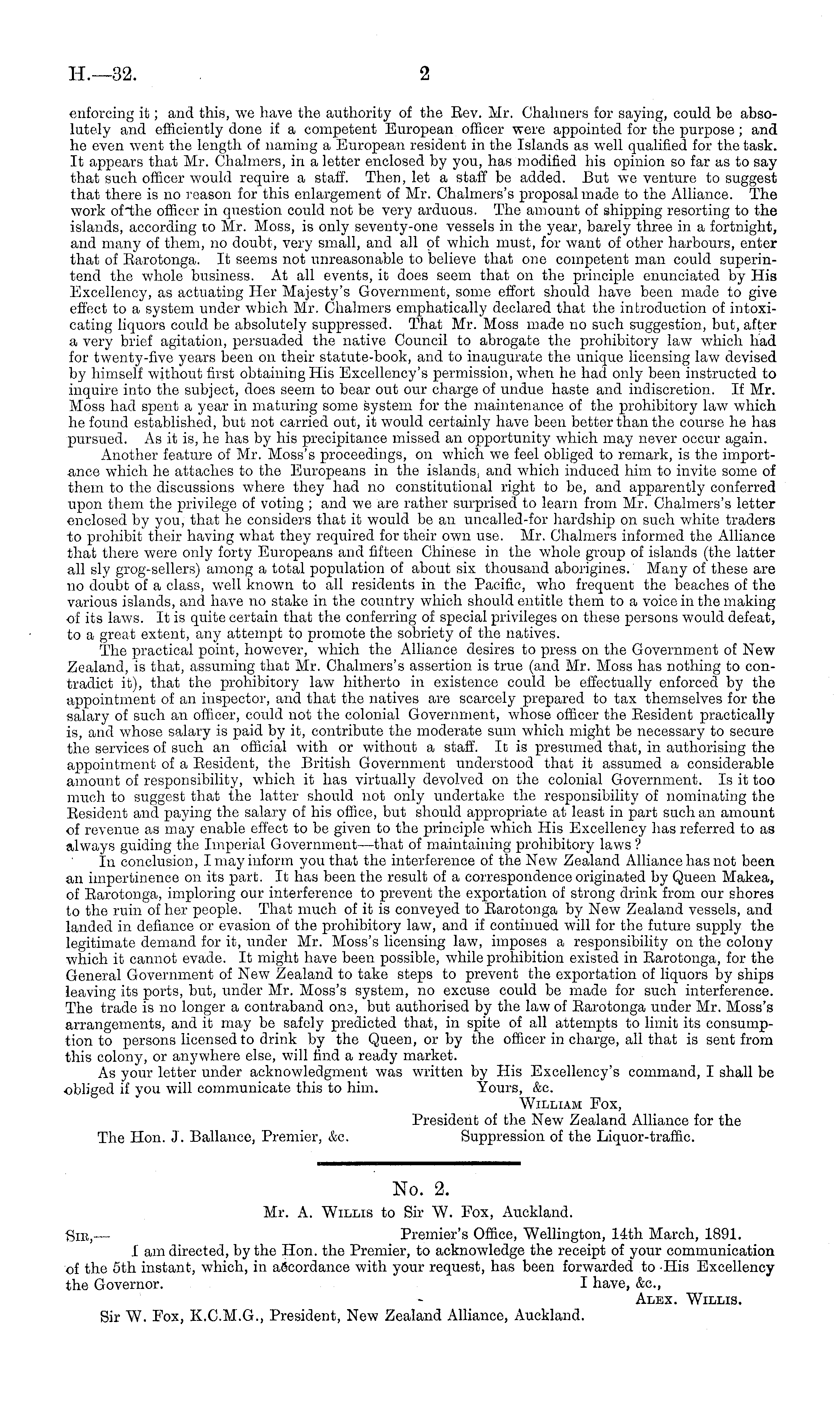 No. 2. Mr. A. Willis to Sir W. Fox, Auckland. Sib, — Premier's Office, Wellington, 14th March, 1891. 1 am directed, by the Hon. the Premier, to acknowledge the receipt of your communication of the sth instant, which, in a6cordance with your request, has been forwarded to -His Excellency the Governor. I have, &c, Alex. Willis. Sir W. Fox, K.C.M.G., President, New Zealand Alliance, Auckland.