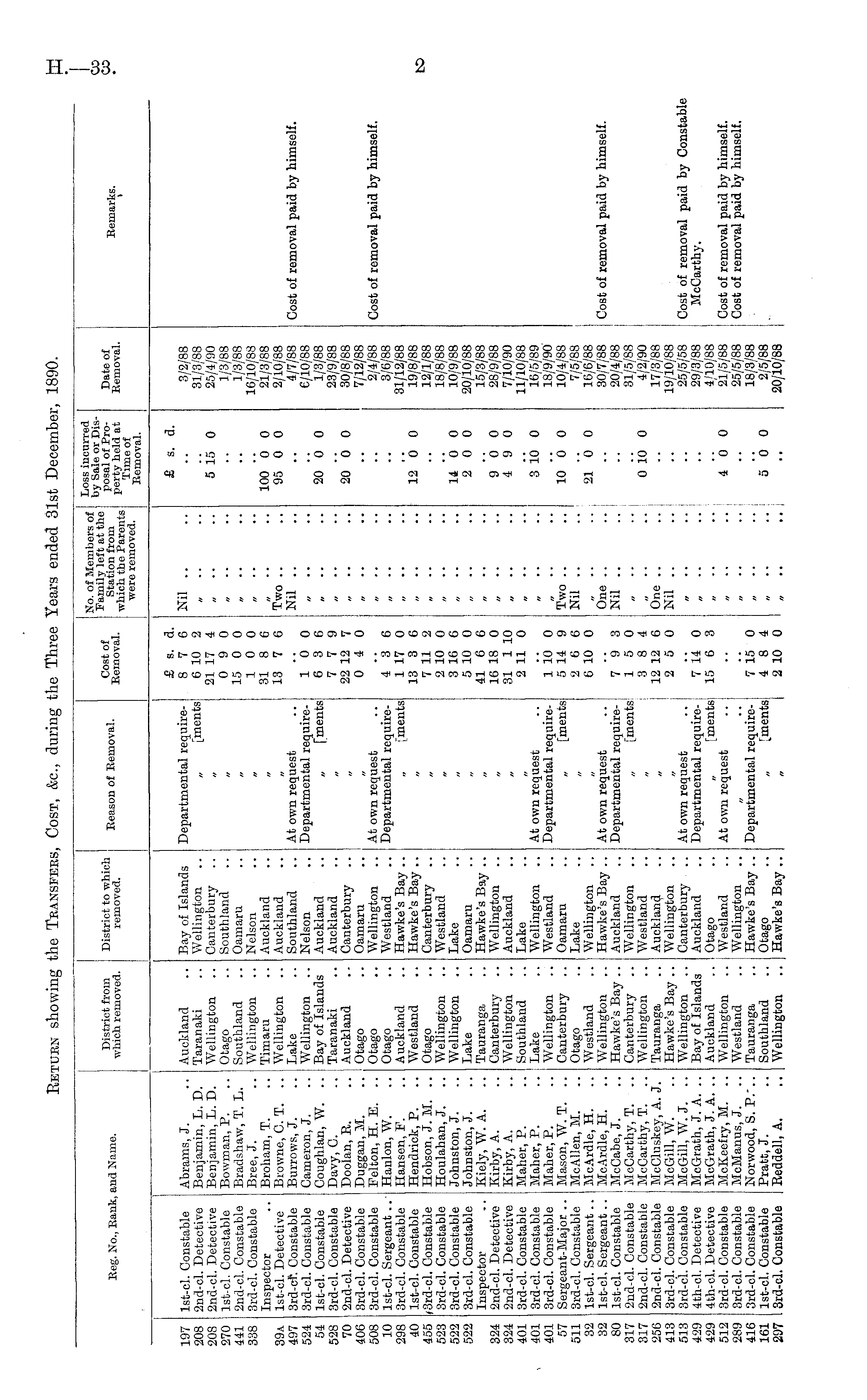 Keg. No., Rank, and Name. District from which removed. District to -which removed. Eeason of Removal. Cost of Removal. No. of Members of Family left at the Station from which the Parents were removed. Loss incurred by Sale or Disposal of Property held at Time of Removal. Date of Removal. Remarks. 197 208 208 270 441 338 lst-cl. Constable 2nd-cl. Detective 2nd-cl. Detective lst-cl. Constable 2nd-cl. Constable 3rd-cl. Constable Inspector lst-cl. Detective 3rd-cl. Constable 3rd-cl. Constable lst-cl. Constable 3rd-cl. Constable 2nd-cl. Detective 3rd-cl. Constable 3rd-cl. Constable lst-cl. Sergeant .. 3rd-cl. Constable lst-cl. Constable i3rd-cl. Constable 3rd-cl. Constable 3rd-cl. Constable 3rd-cl. Constable Inspector 2nd-cl. Detective 2nd-cl. Detective 3rd-cl. Constable 3rd-cl. Constable 3rd-cl. Constable Sergeant-Major .. 3rd-cl. Constable lst-cl. Sergeant .. lst-cl. Sergeant .. lst-cl. Constable 2nd-cl. Constable 2nd-el. Constable 2nd-cl. Constable 3rd-cl. Constable 3rd-cl. Constable 4th-cl. Detective ! 4th-cl. Detective ! 3rd-cl. Constable j 3rd-cl. Constable 3rd-cl. Constable lst-cl. Constable 3rd-ol. Constable Abrams, J. Benjamin, L. D. Benjamin, L. D. Bowman, P. Bradshaw, T. L. Bree, J. Brobam, T. Browne, C. T. Burrows, J. Cameron, J. Coughlan, W. Davy, C. Doolan, E. Duggan, M. Felton, H. E. .. Hanlon, W. Hansen, F. Hendrick, P. Hobson, J. M. .. Houlahan, J. Johnston, J. Johnston, J. Kiely, W. A. .. Kirby, A. Kirby, A. Maher, P. Maher, P. Maher, P. Mason, W. T. .. McAllen, M. McArdle, H. .. McArdle, H. McCabe, J. McCarthy, T. .. McCarthy, T. .. McCluskey, A. J. McGill, W. McGill, W. J. .. McGrath, J. A. McGrath, J. A. McKeefry, M. .. McManus, J. Norwood, S. P. .. Pratt, J. Keddell, A. Auckland Taranaki Wellington Otago Southland Wellington Timaru Wellington Lake Wellington Bay of Islands Taranaki Auckland Otago Otago Otago Auckland Westland Otago Wellington Wellington Lake Tauranga Canterbury Wellington Southland Lake Wellington Canterbury Otago Westland Wellington Hawke's Bay .. Canterbury Wellington Tauranga Hawke's Bay .. Wellington Bay of Islands Auckland Wellington Westland Tauranga Southland Wellington Bay of Islands Wellington Canterbury Southland Oam aru Nelson Auckland Auckland Southland Nelson Auckland Auckland Canterbury Oamaru Wellington Westland Hawke's Bay .. Hawke's Bay .. Canterbury Westland Lake Oamaru Hawke's Bay .. Wellington Auckland Lake Wellington Westland Oamaru Lake Wellington Hawke's Bay .. Auckland Wellington Westland Auckland Wellington Canterbury Auckland Otago Westland Wellington Hawke's Bay .. Otago Hawke's Bay .. Departmental require- „ [ments £ s. d. 8 7 6 6 10 2 21 17 4 0 9 0 15 0 0 10 0 31 8 6 13 7 6 Nil .. £ s. d. 5 15 0 3/2/88 31/3/88 25/4/90 1/3/88 1/3/88 16/10/88 21/3/88 2/10/88 4/7/88 6/10/88 1/3/88 23/9/88 30/8/88 7/12/88 2/4/88 3/6/88 31/12/88 19/8/88 12/1/88 18/8/88 10/9/88 20/10/88 15/3/88 28/9/88 7/10/90 11/10/88 16/5/89 18/9/90 10/4/88 7/5/88 16/6/88 30/7/88 20/4/88 31/5/88 4/2/90 17/3/88 19/10/88 25/5/58 29/3/88 4/10/88 21/5/88 25/5/88 18/3/88 2/5/88 20/10/88 39a 497 524 54 528 70 406 508 10 298 40 455 523 522 522 Two .. Nil .. 100 0 0 95 0 0 At own request Departmental require- „ [ments 10 0 6 3 6 7 7 9 22 12 7 0 4 0 20 0 0 Cost of removal paid by himself. 20 0 0 Cost of removal paid by himself. At own request Departmental require- „ rments 4 3 6 1 17 0 13 3 6 7 11 2 2 10 0 3 16 6 5 10 0 41 6 6 16 18 0 31 1 10 2 11 0 12 0 0 „ 14 0 0 2 0 0 324 324 401 401 401 57 511 32 32 80 317 317 256 413 513 429 429 512 289 416 161 297 9 0 0 4 9 0 Cost of removal paid by himself. At own request Departmental requirements 1 10 0 5 14 9 2 6 6 6 10 0 I 3 10 0 Two .. Nil .. One .. Nil .. i 10 0 0 21 "6 0 At own request .. j Departmental require- j „ [ments! 7 9 3 15 0 3 8 4 12 12 6 2 5 0 One '.. Nil .. * * I 0 10 0 Cost of removal paid by Constabli McCarthy. At own request .. j Departmental require[ments At own request .. j 7 14 0 15 6 3 i 4 0 0 Cost of removal paid by himself. Cost of removal paid by himself. Departmental require- | „ [ments 7 15 0 4 8 4 2 10 0 // • • 5 0 0