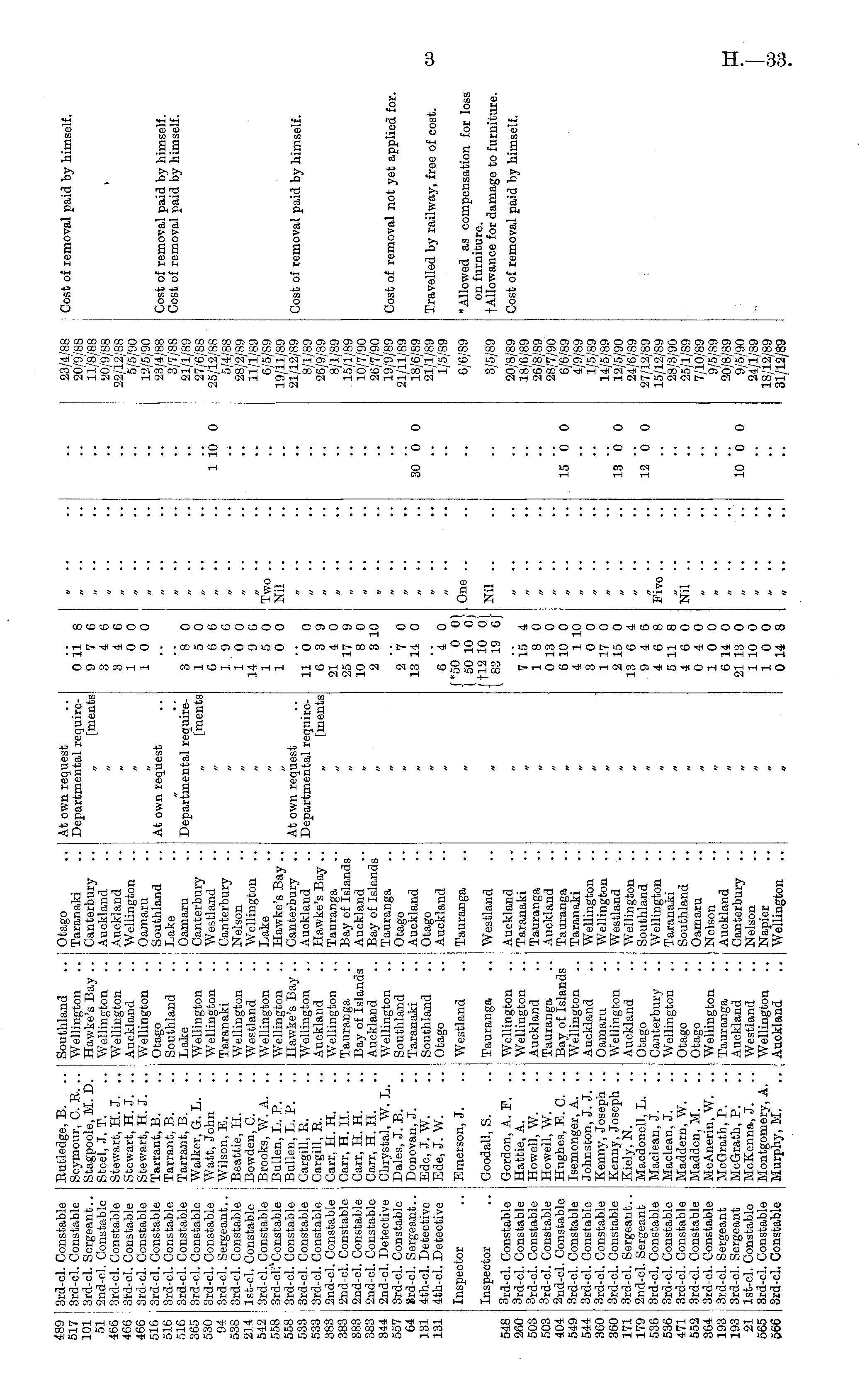 489 517 101 51 466 466 466 516 516 516 365 530 94 538 214 542 558 558 533 533 383 383 383 383 344 557 64 131 131 3i-a-cl. Constable 3rd-cl. Constable 3rd-cl. Sergeant.. 2nd-cl. Constable 3rd-cl. Constable 3rd-cl. Constable 3rd-cl. Constable 3rd-cl. Constable 3rd-cl. Constable 3rd-cl. Constable 3rd-cl. Constable 3rd-cl. Constable 3rd-cl. Sergeant.. 3rd-cl. Constable lst-cl. Constable 3rd-cl. Constable 3rd-cl.'Constable 3rd-cl. Constable 3rd-el. Constable 3rd-cl. Constable 2na-el. Constable 2nd-cl. Constable 2nd-cl. Constable 2nd-cl. Constable 2nd-cl. Detective 3rd-cl. Constable 3rd-el. Sergeant.. 4th-cl. Detective 4th-cl. Detective Rutledge, B. Seymour, C. R. .. Stagpoole, M. D. Steel, J. T. Stewart, H. J. Stewart, H. J. Stewart, H. J. Tarrant, B. Tarrant, B. Tarrant, B. Walker, G. L. Watt, John Wilson, E. Beattie, H. Bowden, C. Brooks, W. A. Bullen, L. P. Bullen, L. P. Cargill, R. Cargill, R. Carr, H. H. Carr, H. H. Carr, H. H. Carr, H. H. Chrystal, W. L. Dales, J. B. Donovan, J. Ede, J. W. Ede, J. W. Southland Wellington Hawke's Bay .. Wellington Wellington Auckland Wellington Otago Southland Lake Wellington Wellington Taranaki Wellington Westland Wellington Wellington Hawke's Bay .. Wellington Auckland Wellington Tauranga Bay of Islands Auckland Wellington Southland Taranaki Southland Otago Otago Taranaki Canterbury Auckland Auckland Wellington Oamaru Southland Lake Oamaru Canterbury Westland Canterbury Nelson Wellington Lake Hawke's Bay .. Canterbury Auckland Hawke's Bay .. Tauranga Bay of Islands Auckland Bay of Islands Tauranga Otago Auckland Otago Auckland At own request Departmental require- „ [ments „ At own request Departmental require- „ [ments 0 11 8 9 7 6 3 4 6 3 4 6 10 0 10 0 3 8 0 15 0 6 6 6 19 6 10 0 14 9 6 15 0 10 0 Two .. Nil .. i io o 23/4/88 20/9/88 11/8/88 20/9/88 22/12/88 5/5/90 12/5/90 23/4/88 3/7/88 21/1/89 27/6/88 25/12/88 5/4/88 28/2/89 11/1/89 6/5/89 19/11/89 21/12/89 8/1/89 26/9/89 8/1/89 15/1/89 10/7/90 26/7/90 19/9/89 21/11/89 18/6/89 21/1/89 1/5/89 Cost of removal paid by himself. i Cost of removal paid by himself. Cost of removal paid by himself. Cost of removal paid by himself. At own request Departmental require- „ [ments 11 0 0 6 3 9 21 4 0 25 17 9 10 8 0 2 3 10 Cost of removal not yet applied for. 2 '7 0 13 14 0 30 0 0 6 4 0 f*50 0 0] \ 50 10 0) Itl2 10 0\ \ 83 19 6/ Travelled by railway, free of cost. Inspector Emerson, J. Westland Tauranga One .. 6/6/89 'Allowed as compensation for loss on furniture. fAllowance for damage to furniture. Inspector Goodall, S. Tauranga Westland Nil .. 3/5/89 548 260 503 503 404 549 544 360 360 171 179 536 536 471 552 364 193 193 21 565 566 3rd-cl. Constable 3rd-cl. Constable 3rd-cl. Constable 3rd-cl. Constable 2nd-cl. Constable 3rd-cl. Constable 3rd-cl. Constable 3rd-el. Constable 3rd-cl. Constable 3rd-cl. Sergeant.. 2nd-cl. Sergeant 3rd-el. Constable 3rd-cl. Constable 3rd-cl. Constable 3rd-cl. Constable 3rd-el. Constable 3rd-cl. Sergeant 3rd-cl. Sergeant lst-cl. Constable 3rd-cl. Constable 3ra-cl. Constable Gordon, A. F. Hattie, A. Howell, W. Howell, W. Hughes, E. C. Isemonger, A. Johnston, J. J. Kenny, Joseph .. Kenny, Joseph .. Kiely, N. Macdonell, L. .. Maclean, J. Maclean, J. Maddern, W. .. Madden, M. McAnerin, W. .. McGrath, P. McGrath, P. McKenna, J. Montgomery, A. Murphy, M. Wellington Wellington Auckland Tauranga Bay of Islands Wellington Auckland Oamaru Wellington Auckland Otago Canterbury Wellington Otago Otago Wellington Tauranga Auckland Westland Wellington Auckland Auckland Taranaki Tauranga Auckland Tauranga Taranaki Wellington Wellington Westland Wellington Southland Wellington Taranaki Southland Oamaru Nelson Auckland Canterbury Nelson Napier Wellington .. " " " 7 15 4 18 0 0 13 0 6 10 0 4 1 10 3 0 0 1 17 0 2 15 0 13 6 4 9 4 6 4 6 8 5 11 8 4 6 0 0 4 0 10 0 6 14 0 21 13 0 1 10 0 10 0 0 U 8 15 0 0 13 0 0 12 0 0 20/8/89 18/6/89 26/8/89 28/7/90 6/6/89 4/9/89 1/5/89 14/5/89 12/5/90 24/6/89 27/12/89 15/12/89 28/3/90 25/1/89 7/10/89 9/5/89 20/8/89 9/5/90 24/1/89 18/12/89 31/12/89 Cost of removal paid by himself. Five .. Nil '.'. 10 0 0 I w • •
