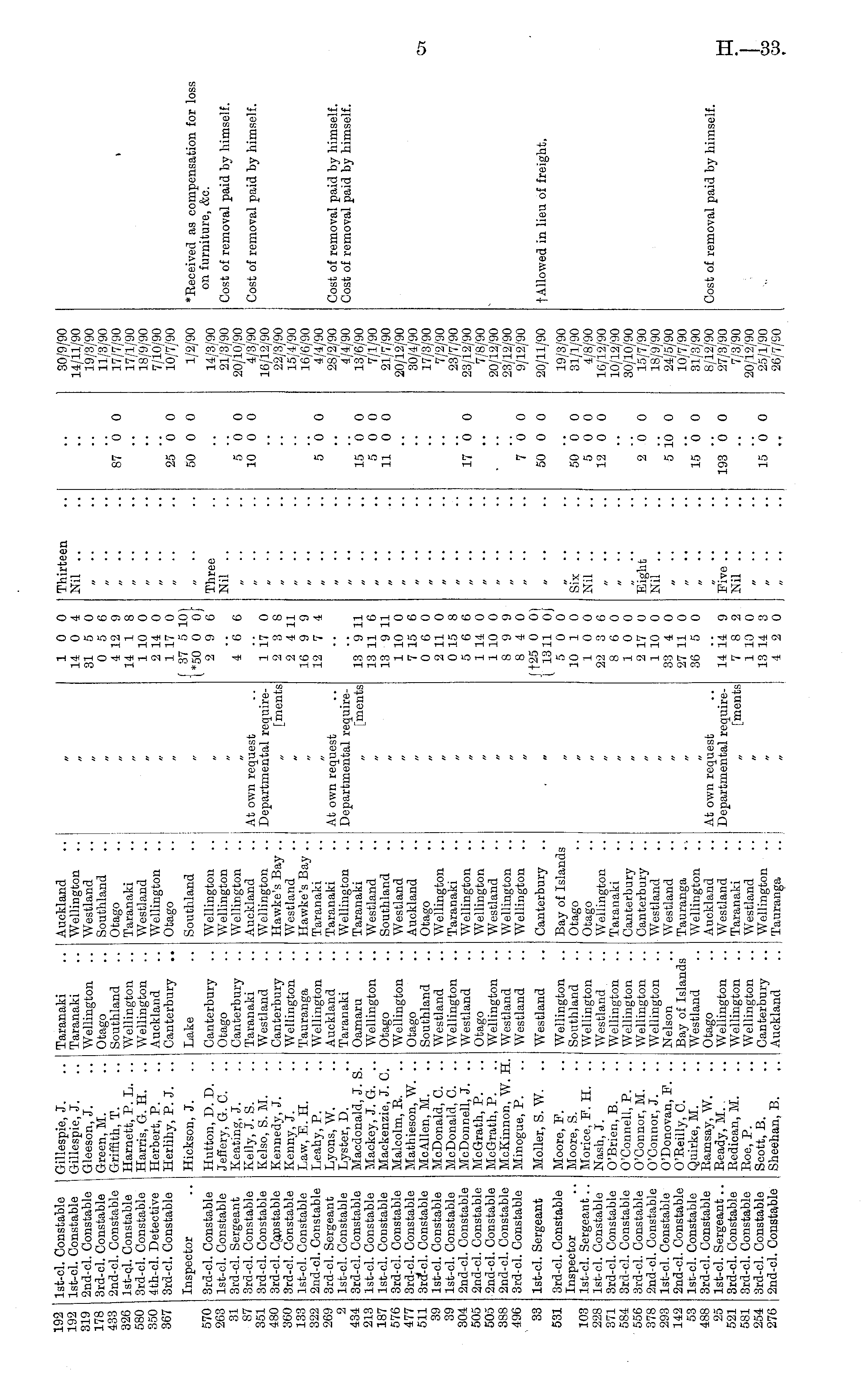 192 192 319 178 433 326 580 350 367 Ist-cl. Constable lst-cl. Constable 2nd-el. Constable 3rd-ol. Constable 2nd-cl. Constable lst-cl. Constable 3rd-cl. Constable 4th-cl. Detective 3rd-cl. Constable Gillespie, J. Gillespie, J. Gleeson, J. Green, M. Griffith, T. Harnett, P. L. Harris, G. H. Herbert, P. Herlihy, P. J. Taranaki Taranaki Wellington Otago Southland Wellington Wellington Auckland Canterbury .. Auckland Wellington Westland Southland Otago Taranaki Westland Wellington Otago 10 0 14 0 4 31 5 0 0 5 6 4 12 9 14 1 8 1 10 0 2 14 0 1 17 0 f 37 5 10) \*50 0 Of 2 9 6 Thirteen Nil .. 87 0 0 30/9/90 14/11/90 19/3/90 11/3/90 17/7/90 17/1/90 18/9/90 7/10/90 10/7/90 » Inspector 3rd-cl. Constable lst-cl. Constable 3rd-cl. Sergeant 3rd-cl. Constable 3rd-cl. Constable 3rd-cl. Constable 3rd-cl. Constable lst-cl. Constable 2nd-cl. Constable 3rd-cl. Sergeant lst-cl. Constable 3rd-cl. Constable lst-cl. Constable lst-cl. Constable 3rd-cl. Constable 3rd-el. Constable 3rd-cl. Constable lst-cl. Constable lst-cl. Constable 2nd-cl. Constable 2nd-cl. Constable 2nd-cl. Constable 2nd-cl. Constable 3rd-cl. Constable Hickson, J. Lake Southland 25 '6 0 50 0 0 1/2/90 'Received as compensation for loss on furniture, &c. 570 263 31 87 351 480 360 133 322 269 2 434 213 187 576 477 511 39 39 304 505 505 388 496 Hutton, D. D. Jeffery, G. C. Keating, J. Kelly, J. S. Kelso, S. M. Kennedy, J. Kenny, J. Law, E. H. Leahy, P. Lyons, W. Lyster, D. Macdonald, J. S. Mackey, J. G. Mackenzie, J. C. Malcolm, R. Mathieson, W. .. McAllen, M. McDonald, C. .. McDonald, C. .. McDonnell, J. .. McGrath, P. .. McGrath, P. .. McKinnon, W. H. Minogue, P. Canterbury Otago Canterbury Taranaki Westland Canterbury Wellington Tauranga Wellington Auckland Taranaki Oamaru Wellington Otago Wellington Otago Southland Westland Wellington Westland Otago Wellington Westland Westland Wellington Wellington Wellington Auckland Wellington Hawke's Bay .. Westland Hawke's Bay .. Taranaki Taranaki Wellington Taranaki Westland Southland Westland Auckland Otago Wellington Taranaki Wellington Wellington Westland Wellington Wellington At own request Departmental require- „ [ments At own request Departmental require- „ [ments 4 6 6 1 17 0 2 3 8 2 4 11 16 9 9 12 7 4 13 9 11 13 11 6 13 9 11 1 10 0 7 15 6 0 6 0 2 11 0 0 15 8 5 6 6 1 14 0 1 10 0 8 9 9 8 4 0 (t25 0 0) \ 1311 0J 5 0 0 10 1 0 10 0 22 3 6 8 6 0 10 0 2 17 O 1 10 0 33 4 0 27 11 0 36 5 0 Three Nil .. 5 0 0 10 0 0 5 0 0 15 0 0 5 0 0 11 0 0 14/3/90 21/3/90 20/10/90 4/3/90 16/12/90 22/3/90 15/4/90 16/6/90 4/4/90 28/2/90 4/4/90 13/6/90 7/1/90 21/7/90 20/12/90 30/4/90 17/3/90 7/2/90 23/7/90 23/12/90 7/8/90 20/12/90 23/12/90 9/12/90 20/11/90 19/3/90 31/1/90 4/8/90 16/12/90 10/12/90 30/10/90 15/7/90 18/9/90 24/5/90 10/7/90 31/3/90 8/12/90 27/3/90 7/3/90 20/12/90 25/1/90 26/7/90 Cost of removal paid by himself. Cost of removal paid by himself. Cost of removal paid by himself. Cost of removal paid by himself. 17 0 0 7 0 0 t Allowed in lieu of freight. 33 lst-cl. Sergeant Moller, S. W. Westland Canterbury 50 0 0 531 3rd-el. Constable Inspector lst-cl. Sergeant.. lst-cl. Constable 3rd-cl. Constable 3rd-cl. Constable 3rd-cl. Constable 2nd-cl. Constable lst-cl. Constable 2nd-el. Constable lst-cl. Constable 3rd-cl. Constable lst-cl. Sergeant .. 3rd-cl. Constable 3rd-cl. Constable 3rd-cl. Constable 2nd-cl. Constable Moore, F. Moore, S. Morice, P. H. Nash, J. O'Brien, B. O'Connell, P. .. O'Connor, M. .. O'Connor, J. O'Donovan, P. .. O'Reilly, C. Quirke, M. Ramsay, W. Ready, M. . Redican, M. Roe, P. Scott, B. Sheehan, B. Wellington Southland Wellington Westland Wellington Wellington Wellington Wellington Nelson Bay of Islands Westland Otago Wellington Wellington Wellington Canterbury Auckland Bay of Islands Otago Otago Wellington Taranaki Canterbury Canterbury Westland Westland Tauranga Wellington Auckland Westland Taranaki Westland Wellington Tauranga Six .. Nil .. 50 0 0 5 0 0 12 0 0 103 228 371 584 556 378 293 142 53 488 25 521 581 254 276 Eight Nil .. 2 0 0 5 10 0 Cost of removal paid by himself. 15 0 0 At own request Departmental require- „ [ments 14 14 9 7 8 2 1 10 0 13 14 3 4 2 0 Five .. Nil .. 193 '6 0 15 '6 0 I