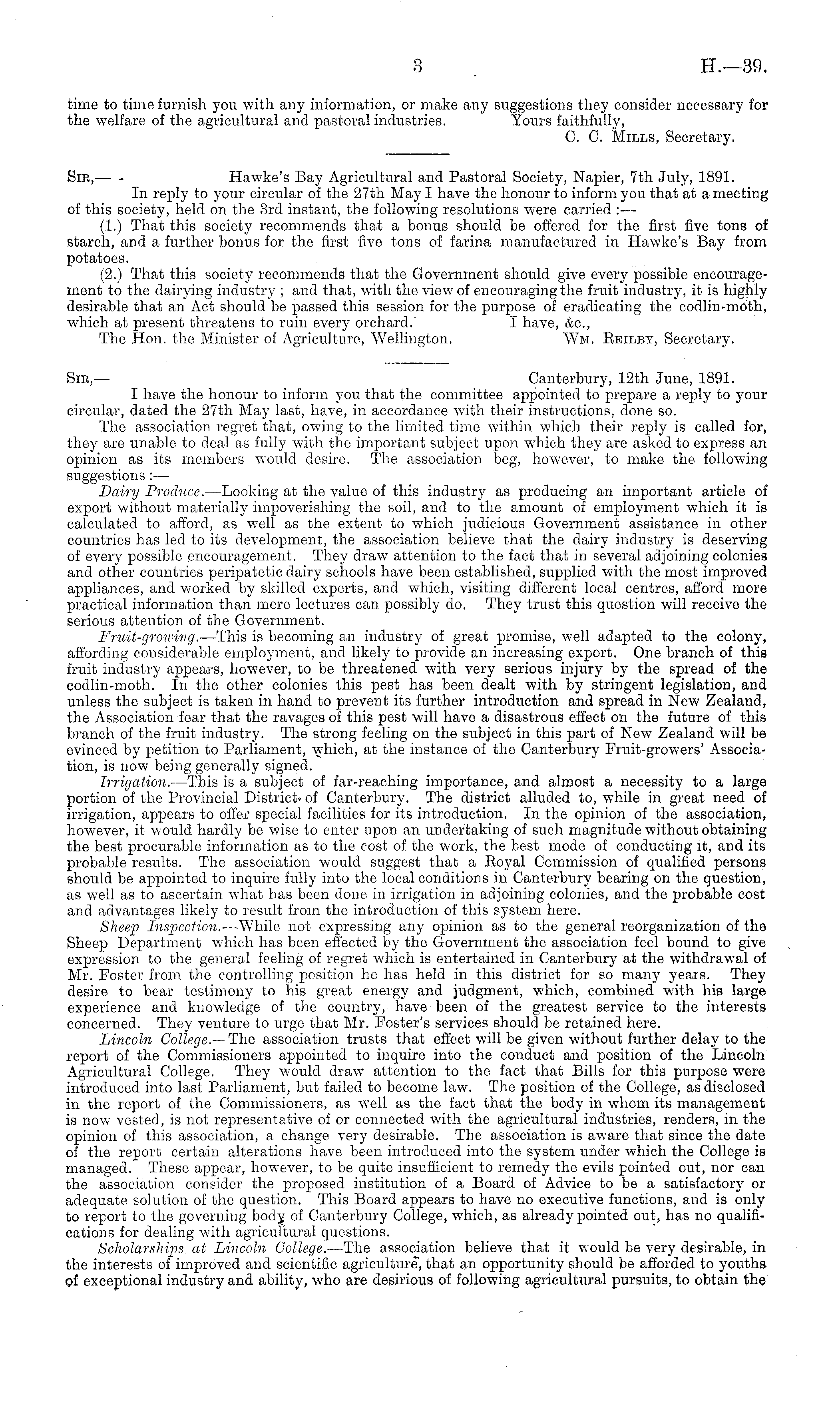 Sm,— Canterbury, 12th June, 1891. I have the honour to inform you that the committee appointed to prepare a reply to your circular, dated the 27th May last, have, in accordance with their instructions, done so. The association regret that, owing to the limited time within which their reply is called for, they are unable to deal as fully with the important subject upon which they are asked to express an opinion as its members would desire. The association beg, however, to make the following suggestions : — Dairy Produce. —Looking at the value of this industry as producing an important article of export without materially impoverishing the soil, and to the amount of employment which it is calculated to afford, as well as the extent to which judicious Government assistance in other countries has led to its development, the association believe that the dairy industry is deserving of every possible encouragement. They draw attention to the fact that in several adjoining colonies and other countries peripatetic dairy schools have been established, supplied with the most improved appliances, and worked by skilled experts, and which, visiting different local centres, afford more practical information than mere lectures can possibly do. They trust this question will receive the serious attention of the Government. Fruit-growing. —This is becoming an industry of great promise, well adapted to the colony, affording considerable employment, and likely to provide an increasing export. One branch of this fruit industry appeal's, however, to be threatened with very serious injury by the spread of the codlin-moth. In the other colonies this pest has been dealt with by stringent legislation, and unless the subject is taken in hand to prevent its further introduction and spread in New Zealand, the Association fear that the ravages of this pest will have a disastrous effect on the future of this branch of the fruit industry. The strong feeling on the subject in this part of New Zealand will be evinced by petition to Parliament, which, at the instance of the Canterbury Fruit-growers' Association, is now being generally signed. Irrigation. —This is a subject of far-reaching importance, and almost a necessity to a large portion of the Provincial District, of Canterbury. The district alluded to, while in great need of irrigation, appears to offer special facilities for its introduction. In the opinion of the association, however, it would hardly be wise to enter upon an undertaking of such magnitude without obtaining the best procurable information as to the cost of the work, the best mode of conducting it, and its probable results. The association would suggest that a Royal Commission of qualified persons should be appointed to inquire fully into the local conditions in Canterbury bearing on the question, as well as to ascertain what has been done in irrigation in adjoining colonies, and the probable cost and advantages likely to result from the introduction of this system here. Sheep Inspection. —While not expressing any opinion as to the general reorganization of the Sheep Department which has been effected by the Government the association feel bound to give expression to the general feeling of regret which is entertained in Canterbury at the withdrawal of Mr. Foster from the controlling position he has held in this district for so many years. They desire to bear testimony to his great energy and judgment, which, combined with his large experience and knowledge of the country, have been of the greatest service to the interests concerned. They venture to urge that Mr. Foster's services should be retained here. Lincoln College.—The association trusts that effect will be given without further delay to the report of the Commissioners appointed to inquire into the conduct and position of the Lincoln Agricultural College. They would draw attention to the fact that Bills for this purpose were introduced into last Parliament, but failed to become law. The position of the College, as disclosed in the report of the Commissioners, as well as the fact that the body in whom its management is now vested, is not representative of or connected with the agricultural industries, renders, in the opinion of this association, a change very desirable. The association is aware that since the date of the report certain alterations have been introduced into the system under which the College is managed. These appear, however, to be quite insufficient to remedy the evils pointed out, nor can the association consider the proposed institution of a Board of Advice to be a satisfactory or adequate solution of the question. This Board appears to have no executive functions, and is only to report to the governing body of Canterbury College, which, as already pointed out, has no qualifications for dealing with agricultural questions. Scholarships at Lincoln College. —The association believe that it would be very desirable, in the interests of improved and scientific agriculture, that an opportunity should be afforded to youths of exceptional industry and ability, who are desirious of following agricultural pursuits, to obtain the