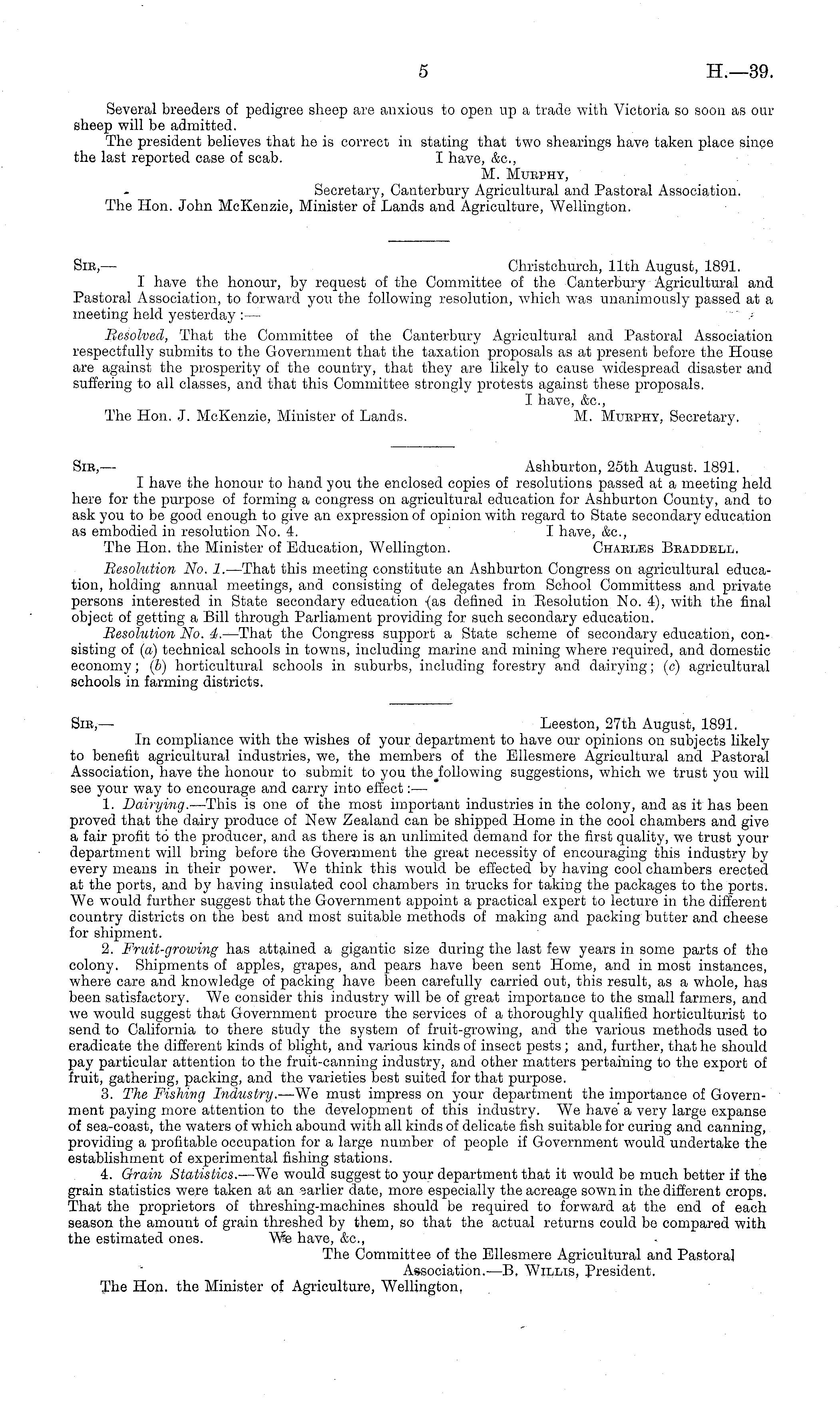 Sib,— Leeston, 27th August, 1891. In compliance with the wishes of your department to have our opinions on subjects likely to benefit agricultural industries, we, the members of the Ellesmere Agricultural and Pastoral Association, have the honour to submit to you the following suggestions, which we trust you will see your way to encourage and carry into effect: — 1. Dairying. —This is one of the most important industries in the colony, and as it has been proved that the dairy produce of New Zealand can be shipped Home in the cool chambers and give a fair profit to the producer, and as there is an unlimited demand for the first quality, we trust your department will bring before the Government the great necessity of encouraging this industry by every means in their power. We think this would be effected by having cool chambers erected at the ports, and by having insulated cool chambers in trucks for taking the packages to the ports. We would further suggest that the Government appoint a practical expert to lecture in the different country districts on the best and most suitable methods of making and packing butter and cheese for shipment. 2. Fruit-growing has attained a gigantic size during the last few years in some parts of the colony. Shipments of apples, grapes, and pears have been sent Home, and in most instances, where care and knowledge of packing have been carefully carried out, this result, as a whole, has been satisfactory. We consider this industry will be of great importance to the small farmers, and we would suggest that Government procure the services of a thoroughly qualified horticulturist to send to California to there study the system of fruit-growing, and the various methods used to eradicate the different kinds of blight, and various kinds of insect pests ; and, further, that he should pay particular attention to the fruit-canning industry, and other matters pertaining to the export of fruit, gathering, packing, and the varieties best suited for that purpose. 3. The Fishing Industry. —We must impress on your department the importance of Government paying more attention to the development of this industry. We have a very large expanse of sea-coast, the waters of which abound with all kinds of delicate fish suitable for curing and canning, providing a profitable occupation for a large number of people if Government would undertake the establishment of experimental fishing stations. 4. Grain Statistics. —We would suggest to your department that it would be much better if the grain statistics were taken at an earlier date, more especially the acreage sown in the different crops. That the proprietors of threshing-machines should be required to forward at the end of each season the amount of grain threshed by them, so that the actual returns could be compared with the estimated ones. We have, &c, The Committee of the Ellesmere Agricultural and Pastoral Association. —B. Willis, President. The Hon. the Minister of Agriculture, Wellington.