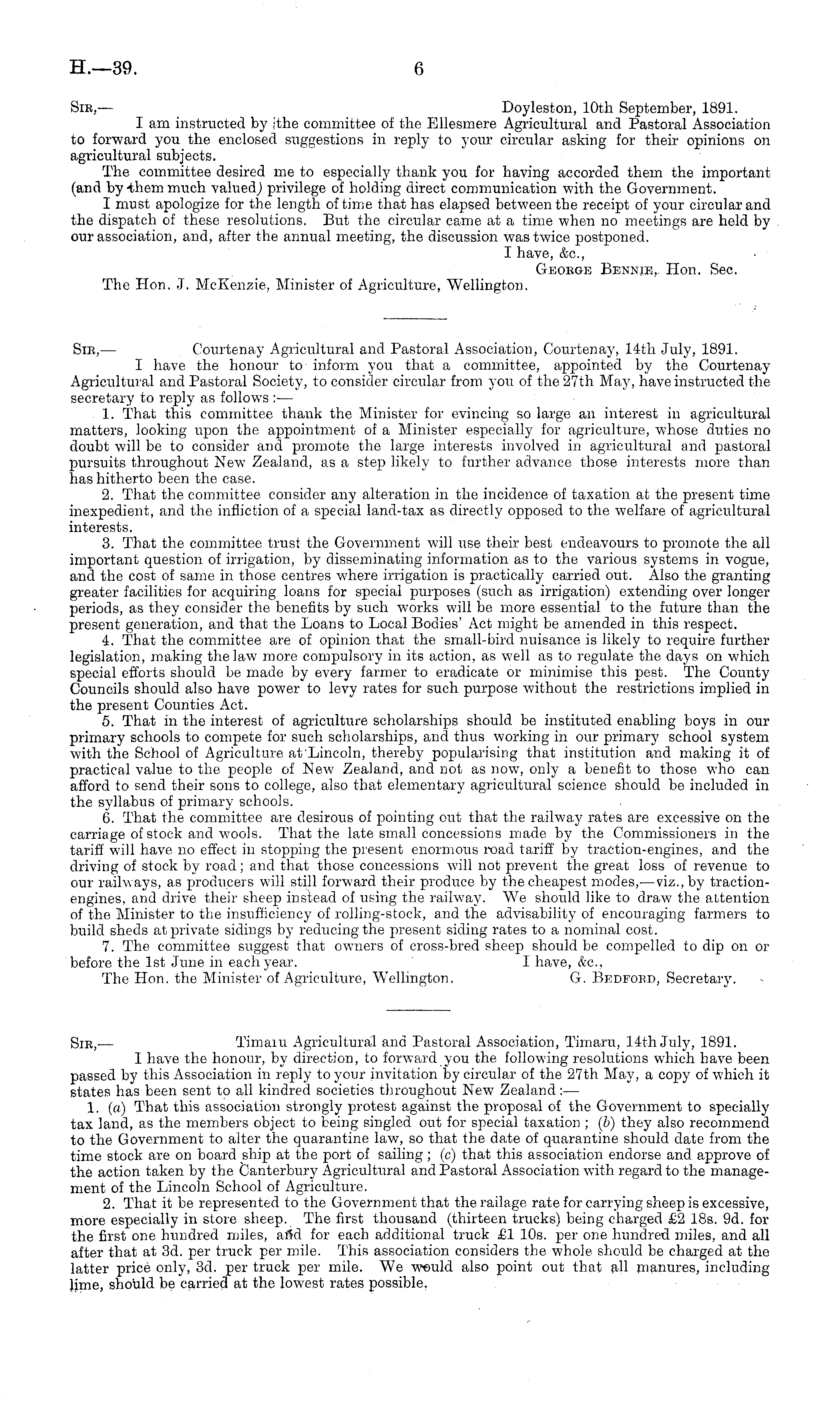 Sir,— Doyleston, 10th September, 1891. I am instructed by jthe committee of the P]llesmere Agricultural and Pastoral Association to forward you the enclosed suggestions in reply to your circular asking for their opinions on agricultural subjects. The committee desired me to especially thank you for having accorded them the important (and by-them much valued,) privilege of holding direct communication with the Government. I must apologize for the length of time that has elapsed between the receipt of your circular and the dispatch of these resolutions. But the circular came at a time when no meetings are held by our association, and, after the annual meeting, the discussion was twice postponed. I have, &c, Geoegk Bennie, Hon. Sec. The Hon. J. McKenzie, Minister of Agriculture, Wellington.