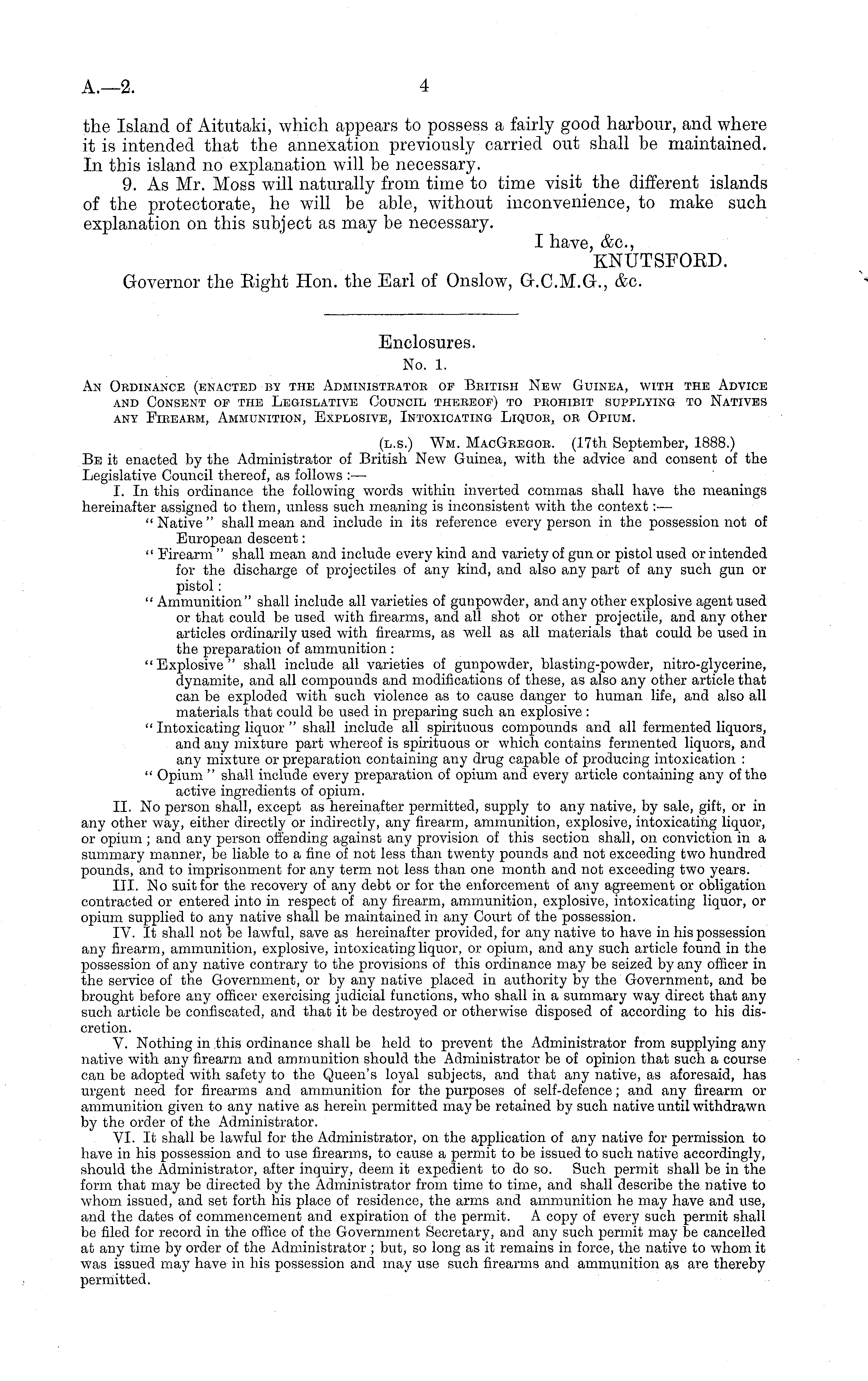 Enclosures. No. 1. An Oedinance (enacted by the Administeatoe of Beitish New Guinea, with the Advice and Consent of the Legislative Council theeeof) to peohibit supplying to Natives any Fieeabm, Ammunition, Explosive, Intoxicating Liquoe, oe Opium. (e.s.) Wm. MacGeegoe. (17th September, 1888.) Be it enacted by the Administrator of British New Guinea, with the advice and consent of the Legislative Council thereof, as follows : — I. In this ordinance the following words within inverted commas shall have the meanings hereinafter assigned to them, unless such meaning is inconsistent with the context: — " Native " shall mean and include in its reference every person in the possession not of European descent: " Firearm " shall mean and include every kind and variety of gun or pistol used or intended for the discharge of projectiles of any kind, and also any part of any such gun or pistol: " Ammunition" shall include all varieties of gunpowder, and any other explosive agent used or that could be used with firearms, and all shot or other projectile, and any other articles ordinarily used with firearms, as well as all materials that could be used in the preparation of ammunition : "Explosive" shall include all varieties of gunpowder, blasting-powder, nitro-glycerine, dynamite, and all compounds and modifications of these, as also any other article that can be exploded with such violence as to cause danger to human life, and also all materials that could be used in preparing such an explosive : " Intoxicating liquor " shall include all spirituous compounds and all fermented liquors, and any mixture part whereof is spirituous or which contains fermented liquors, and any mixture or preparation containing any drug capable of producing intoxication : " Opium " shall include every preparation of opium and every article containing any of the active ingredients of opium. 11. No person shall, except as hereinafter permitted, supply to any native, by sale, gift, or in any other way, either directly or indirectly, any firearm, ammunition, explosive, intoxicating liquor, or opium ; and any person offending against any provision of this section shall, on conviction in a summary manner, be liable to a fine of not less than twenty pounds and not exceeding two hundred pounds, and to imprisonment for any term not less than one month and not exceeding two years. 111. No suit for the recovery of any debt or for the enforcement of any agreement or obligation contracted or entered into in respect of any firearm, ammunition, explosive, intoxicating liquor, or opium supplied to any native shall be maintained in any Court of the possession. IV. It shall not be lawful, save as hereinafter provided, for any native to have in his possession any firearm, ammunition, explosive, intoxicating liquor, or opium, and any such article found in the possession of any native contrary to the provisions of this ordinance may be seized by any officer in the service of the Government, or by any native placed in authority by the Government, and be brought before any officer exercising judicial functions, who shall in a summary way direct that any such article be confiscated, and that it be destroyed or otherwise disposed of according to his discretion. V. Nothing in this ordinance shall be held to prevent the Administrator from supplying any native with any firearm and ammunition should the Administrator be of opinion that such a course can be adopted with safety to the Queen's loyal subjects, and that any native, as aforesaid, has urgent need for firearms and ammunition for the purposes of self-defence; and any firearm or ammunition given to any native as herein permitted may be retained by such native until withdrawn by the order of the Administrator. VI. It shall be lawful for the Administrator, on the application of any native for permission to have in his possession and to use firearms, to cause a permit to be issued to such native accordingly, should the Administrator, after inquiry, deem it expedient to do so. Such permit shall be in the form that may be directed by the Administrator from time to time, and shall describe the native to whom issued, and set forth his place of residence, the arms and ammunition he may have and use, and the dates of commencement and expiration of the permit. A copy of every such permit shall be filed for record in the office of the Government Secretary, and any such permit may be cancelled at any time by order of the Administrator ; but, so long as it remains in force, the native to whom it was issued may have in his possession and may use such firearms and ammunition as are thereby permitted.
