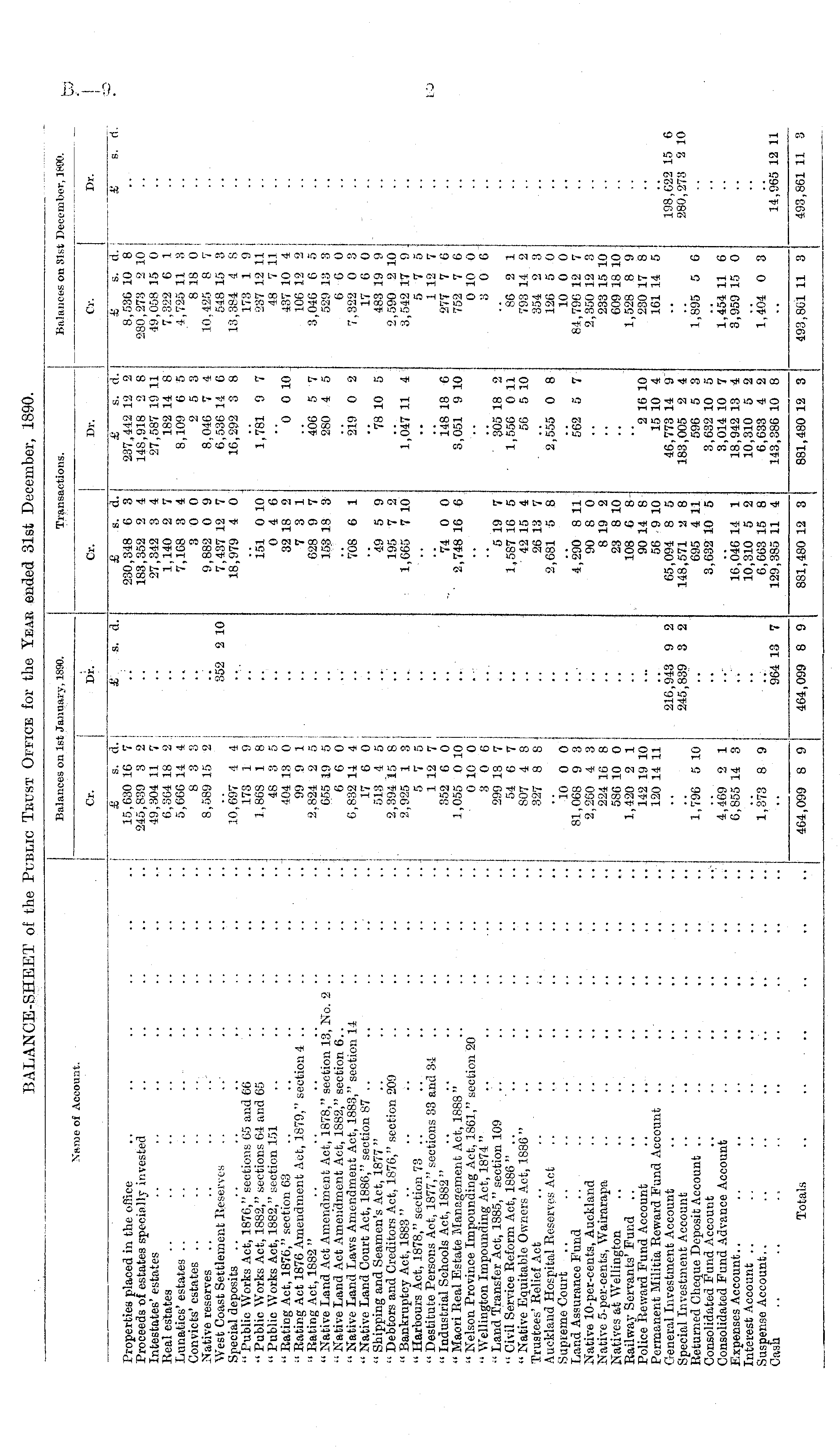 Balances on 1st January, 1890. Transactions. Balances on 31st December, 1890. Name of Account. Cr. Dr. Or. Dr. Cr. Dr. Properties placed in the office Proceeds of estates specio lly invested Intestates' estates Real estates Lunatics' estates .. .. .. Convicts' estates Native reserves West Coast Settlement Reserves Special deposits " Public Works Act, 1876," sections 65 and 66 •' Public Works Act, 1882," sections 64 and 65 " Public Works Act, 1882," section 151 " Eating Act, 1876," section 63 " Rating Act 1876 Amendment Act, 1879," section 4 .. " Eating Act, 1882 " " Native Land Act Amendment Act, 1878," section 13, No. 2 .. " Native Land Act Amendment Act, 1882," section 6.. " Native Land Laws Amendment Act, 1883," section 14 -' Native Land Court Act, 1886," section 87 .. " Shipping and Seamen's Act, 1877 " " Debtors and Creditors Act, 1876," section 209 " Bankruptcy Act, 1883 " .. " Harbours Act, 1878," section 73 .. " Destituto Persons Act, 1877," sections 83 and 34 11 Industrial Schools Act, 1882" " Maori Real Estate Management Act, 1888 " " Nelson Province Impounding Act, 1861," section 20 " Wellington Impounding Act, 1874 " •' Land Transfer Act, 1885," section 109 " Civil Service Reform Act, 1886 " .. " Native Equitable Owners Act, 1886 " Trustees' Relief Act Auckland Hospital Reserves Act Supreme Court Land Assurance Fund Native 10-per-cents, Auckland Native 5-per-cents, Wairarapa Natives at Wellington Railway Servants' Fund Police Reward Fund Account Permanent Militia Reward Fund Account General Investment Account Special Investment Account Returned Cheque Deposit Account Consolidated Fund Account Consolidated Fund Advance Account Expenses Account.. Interest Account .. .. .. Suspense Account,. Cash £ s. d. ( £ s. d. .. : 15,630 16 7 .: .. 1 245,839 3 2; .. ; 49,304 11 7 : 6,864 18 2 I 5,666 14 4 i 5 3 3 ; 8.589 15 2 352 2 10 10.697 4 4 1 173 1 9 1,868 18 48 3 5 ! 404 13 0 99 9 1 I 2.824 2 5 I 655 19 5 j 6 6 0 6,832 14 4 17 6 0 513 4 5 2,394 15 8 8,925 13 5 7 5 1 12 7 ' 352 6 0! 1,055 0 10 1 0 ID 0 3 0 6 299 18 7 54 6 7 807 4 8 327 8 8 '.'. 10 0 0 '.'. 81,068 9 3 2,260 4 3 224 16 8 586 10 0 1,420 2 1 ... 142 19 10 120 14 11 216,943 9 2 245,839 3 2 1,790 5 10 .. 4,469 2 1 6,855 14 3 '.'. 1,373 8 9 .'. 964 13 7 £ s. d. 230,348 6 3 183,352 2 4 27,342 8 4 1.140 2 7 7,168 3 4 3 0 0 9,882 0 9 7.437 12 7 18,979 4 0 1 151 0 10 0 4 6 32 18 2 7 3 1 628 9 7 153 18 3 708 6 1 49 5 9 195 7 2 1,665 7 10 '74 0 0 j ' 2,748 16 6 £ s. d. 237,442 12 2 148,918 2 8 27,587 19 11 182 14 8 8,109 6 5 2 5 3 8.046 7 4 6,536 14 6 16,292 3 8 1,781 9 7 i "o 0 10 j 406 5 7 280 4 5 219 0 2 J '78 10 5 1,047 11 4 148 18 6 3,051 9 10 £ s. d. 8,580 10 8 280,273 2 10 49,058 15 0 7.322 6 1 4,725 11 8 8 18 0 10.425 8 7 , 548 15 3 I 13,384 4 8 j 173 1 9 j 237 12 11 : 48 7 11 j 437 10 4 106 12 2 3,046 6 5 529 13 3 6 6 0 7,322 0 3 17 6 0 483 19 9 2,590 2 10 3,542 17 9 5 7 5 1 12 7 277 7 G 752 7 6 0 10 0 8 0 6 £ ft, d. 5 19 7 1,587 16 5 42 15 4 26 13 7 2,681 5 8 305 18 2 1,556 0 11 50 5 10 86 2 1 793 14 2 354 2 3 126 5 0 10 0 0 84,796 12 7 2,850 12 3 233 15 10 609 18 10 1,528 8 9 230 17 8 161 14 5 1,895 5 6 198,622 15 6 280,273 2 10 2,555 0 8 -4,290 8 11 90 8 0 8 19 2 23 8 10 108 G 8 90 14 8 56 9 10 65,094 8 5 148,571 2 8 695 4 11 3,632 10 5 562 5 7 •• 2 16 10 15 10 4 46,773 14 9 183,005 2 4 596 5 3 3.632 10 5 3,014 10 7 18,942 13 4 10,310 5 2 6.633 4 2 143,386 10 8 16,046 14 1 10,310 5 2 6,663 15 8 129,385 11 4 1,454 11 6 3,959 15 0 1,404 0 3 14,965 12 11 Totals .. 464,099 8 9 ! 464,099 8 9 493,861 11 3 881,480 12 3 881,480 12 3 493,861 11 3