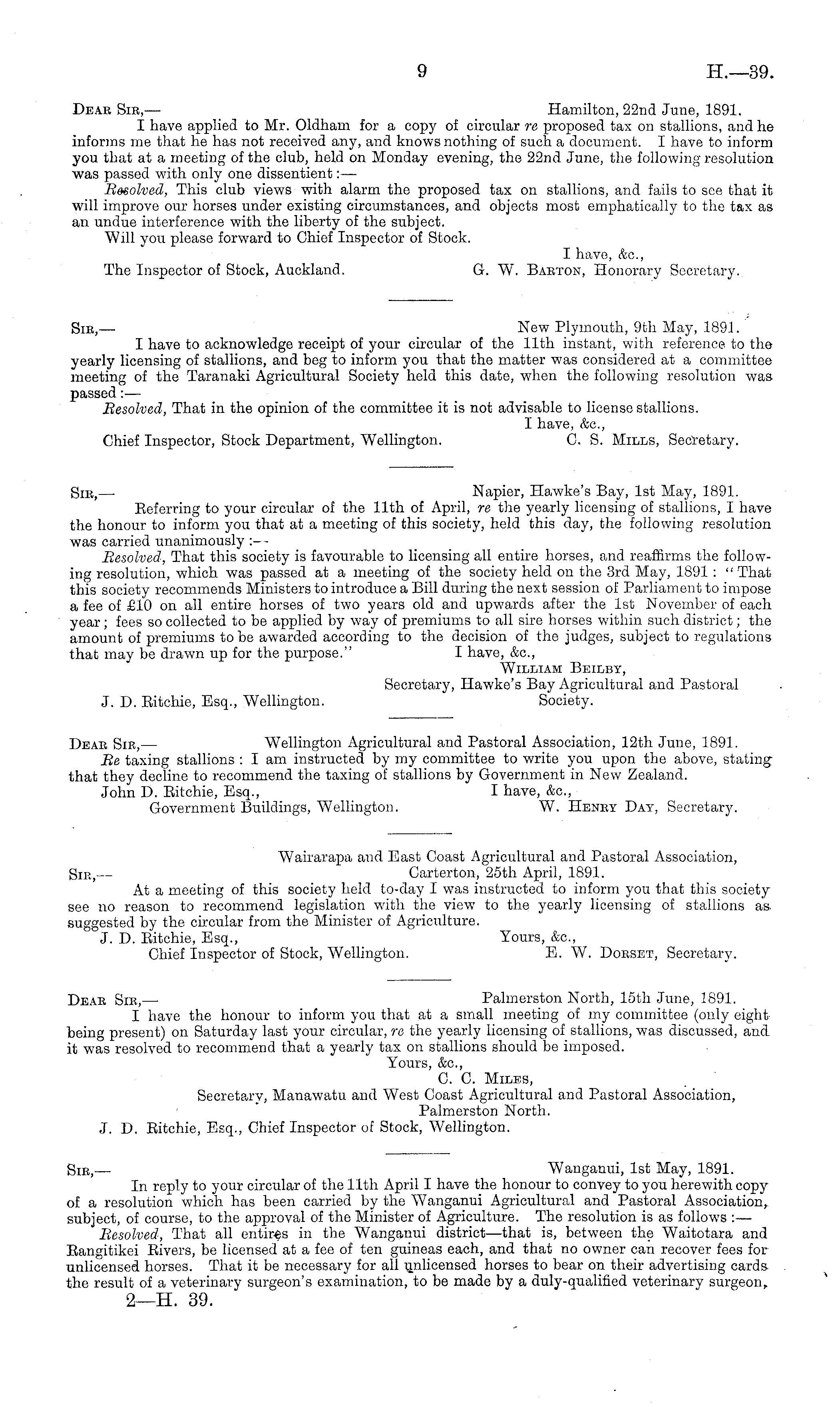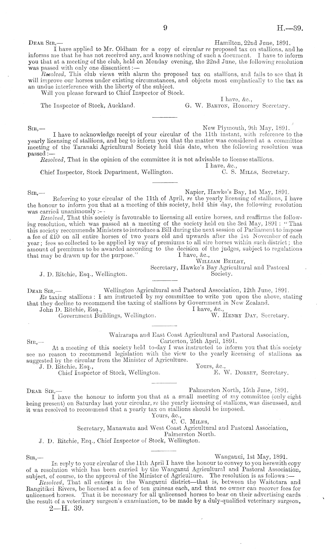 Sic, — Wanganui, Ist May, 1891. In reply to your circular of the 11th April I have the honour to convey to you herewith copy of a resolution which has been carried by the Wanganui Agricultural and Pastoral Association, subject, of course, to the approval of the Minister of Agriculture. The resolution is as follows : —■ Besolved, That all entires in the Wanganui district—that is, between the Waitotara and Eangitikei Eivers, be licensed at a fee of ten guineas each, and that no owner can recover fees for unlicensed horses. That it be necessary for all unlicensed horses to bear on their advertising cards the result of a veterinary surgeon's examination, to be made by a duly-qualified veterinary surgeon, 2—H. 39.
