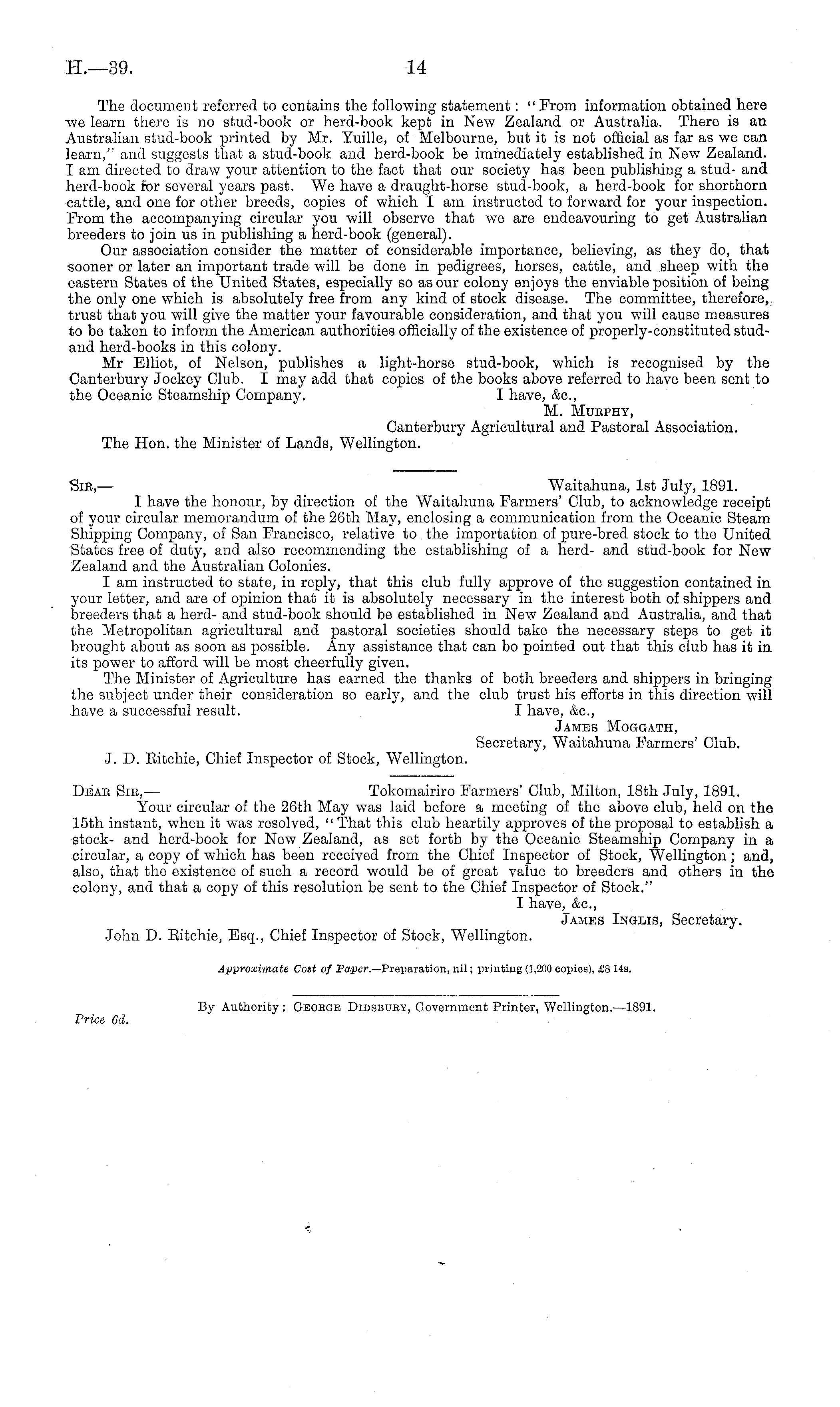 Dear Sib, — Tokomairiro Farmers' Club, Milton, 18th July, 1891. Your circular of the 26th May was laid before a meeting of the above club, held on the loth instant, when it was resolved, " That this club heartily approves of the proposal to establish a stock- and herd-book for New Zealand, as set forth by the Oceanic Steamship Company in a circular, a copy of which has been received from the Chief Inspector of Stock, Wellington; and, also, that the existence of such a record would be of great value to breeders and others in the colony, and that a copy of this resolution be sent to the Chief Inspector of Stock." I have, &c, James Inglis, Secretary. John D. Eitchie, Esq., Chief Inspector of Stock, Wellington. Approximate Cost of Paper.—Preparation, nil; printing (1,200 copies), £8 Us.