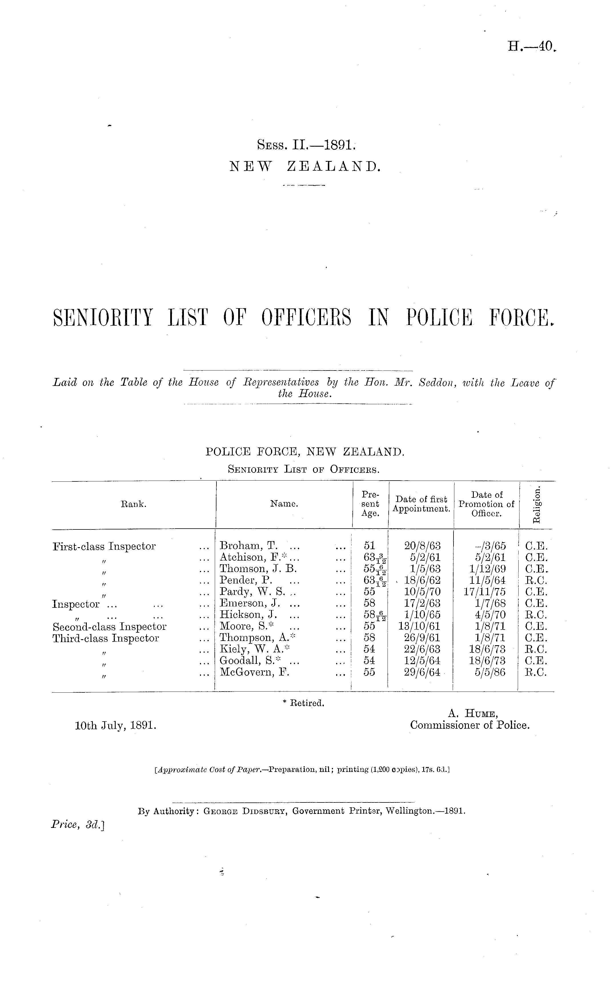 POLICE FORCE, NEW ZEALAND. Seniority List of Officers.